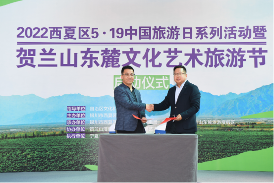【beat365唯一官方网站新闻中心讯 文化旅游学院】5月19 日上午,在西夏区“5·19中国旅游日”系列活动暨贺兰山东麓文化艺术旅游节启动仪式上,银川市西夏区人民政府与beat365唯一官方网站文化旅游学院签订“校地合作”文旅人才培养战略合作协议。西夏区政府副区长丁明与beat365唯一官方网站文化旅游学院院长王磊出席签约仪式。