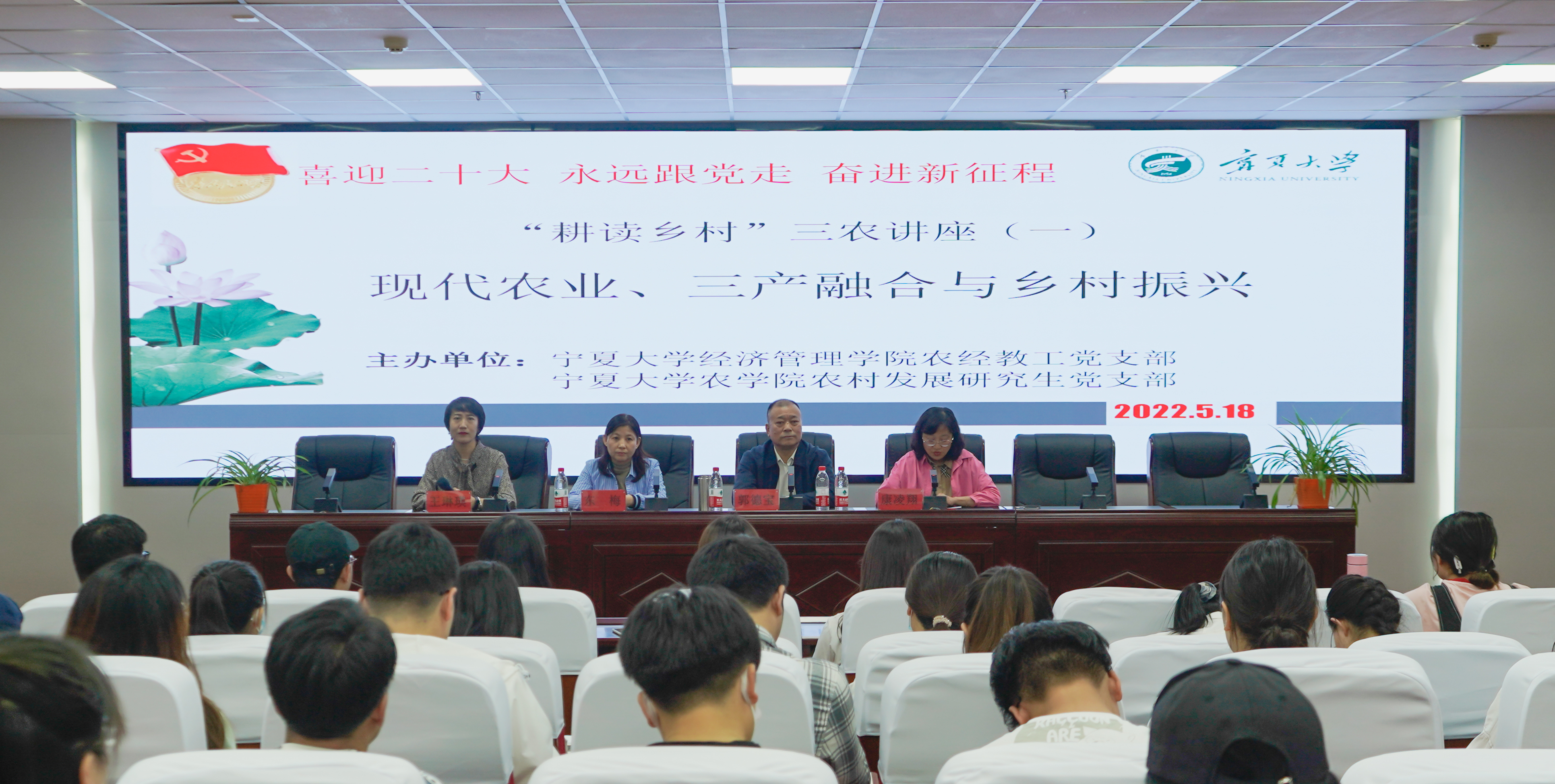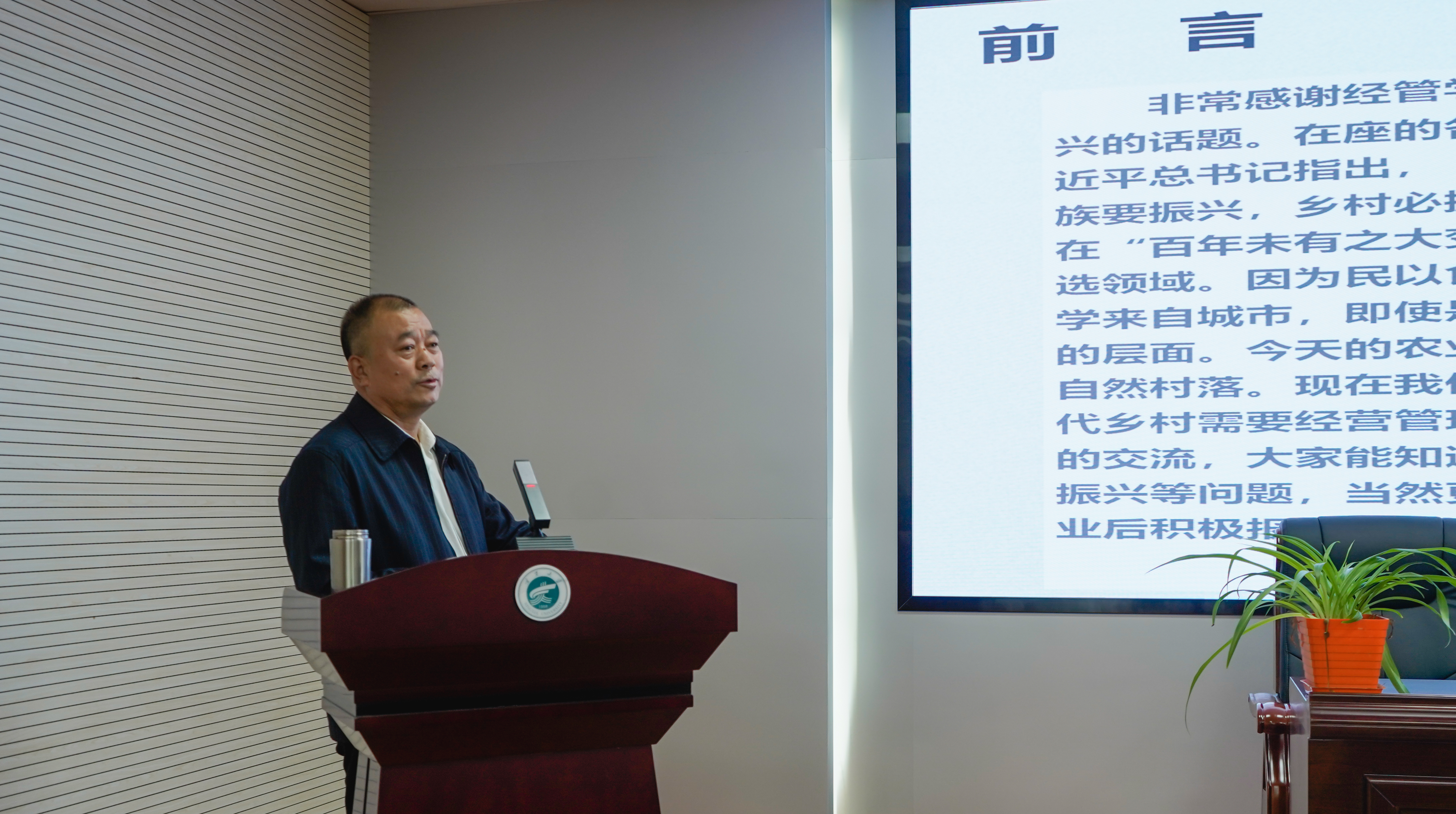 【beat365唯一官方网站新闻中心讯 经济管理学院】5月18日,经济管理学院农林经济管理教工党支部在文荟楼316教室举办“耕读乡村”三农系列讲座第一讲。特邀宁夏农业农村厅二级巡视员郭德宝担任主讲人,为同学们做“现代农业、三产融合与乡村振兴”的专题报告。经济管理学院副院长康凌翔,农林经济管理系主任东梅,教师王琳瑛,经济管理学院农林经济管理专业研究生、本科生参加讲座。