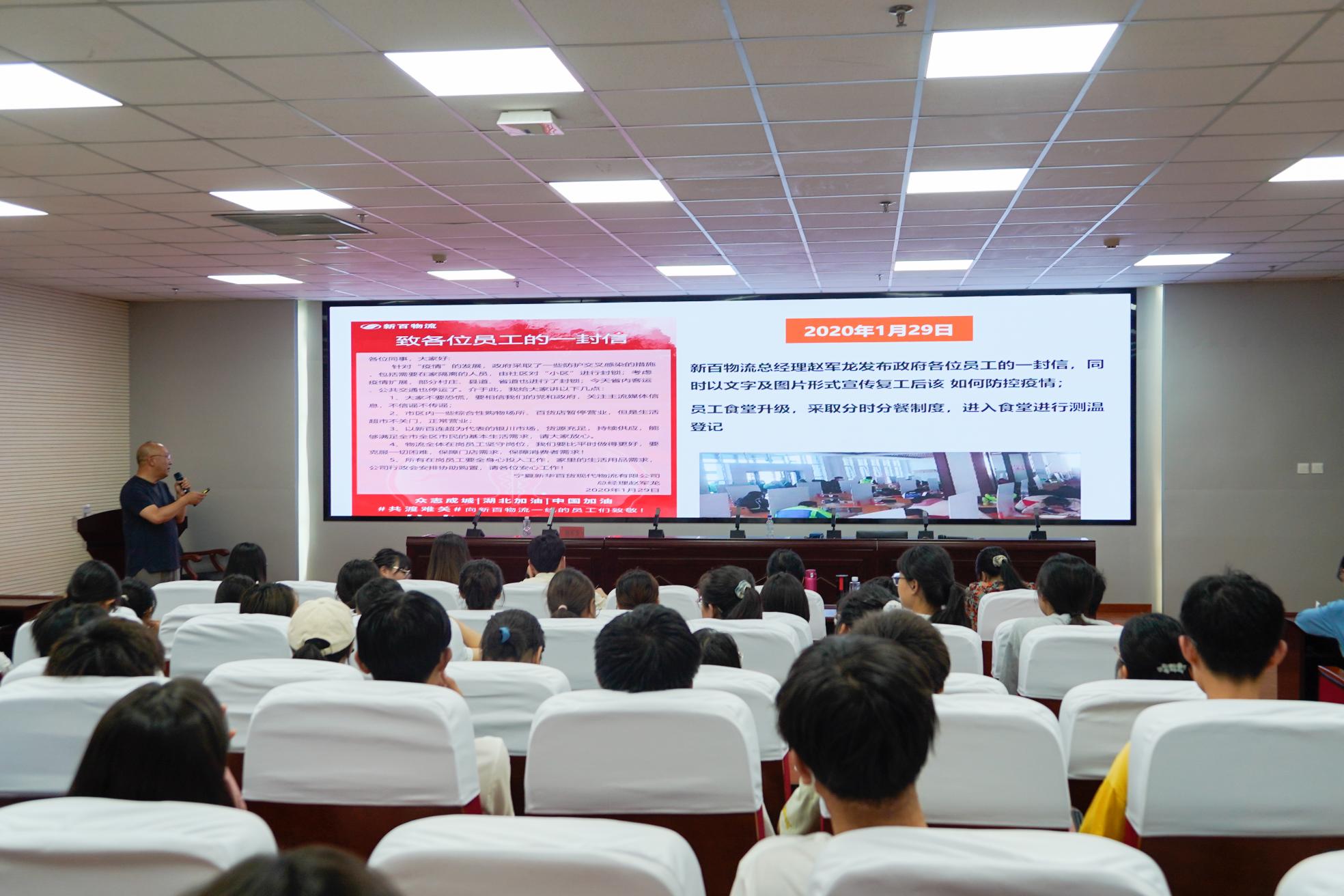 赵军龙首先介绍了新华百货现代物流有限公司作为整个宁夏供应链体系的重要角色,在疫情中担任保障全省市民商品供应的重要的角色,详细讲解了物流在实务中的操作方法。他表明面对突如其来的疫情,新百物流保安全、保储备、保质量、保配送,积极落实自治区党委政府工作部署,“疫”往直前,坚决扛起全区人民群众生活物资的供应重任,保障民生物资储备充足、配送及时。赵军龙以其丰富的经验和同学们进行积极的交流互动,耐心解答了同学们的疑惑。