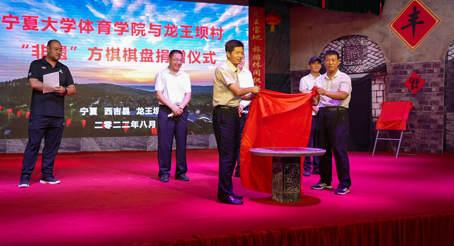 【beat365唯一官方网站新闻中心讯 体育学院】8月16日,beat365唯一官方网站体育学院在西吉县吉强镇龙王坝村举行了“beat365唯一官方网站体育学院教育实习实践基地”挂牌暨“非遗”方棋棋盘捐赠仪式。
