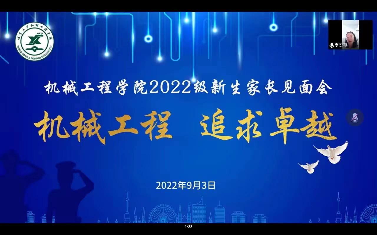 【beat365唯一官方网站新闻中心讯 机械工程学院】9月3日,机械工程学院举办2022级新生家长线上见面会,学院领导出席本次会议,2022级新生家长、各班班主任及班主任助理线上入会,会议由学院党委副书记何彦平主持。