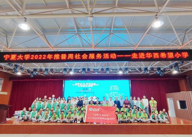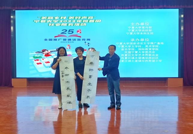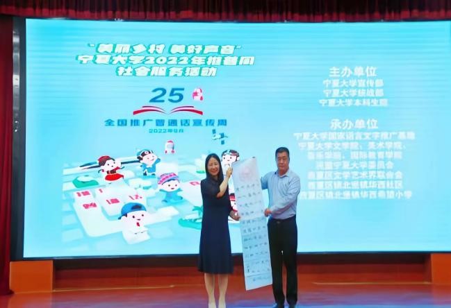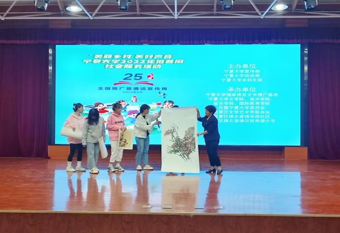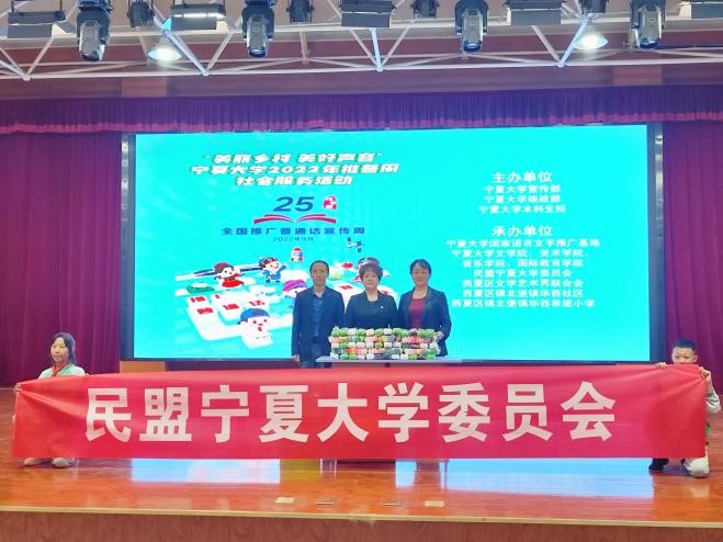 【beat365唯一官方网站新闻中心讯 文学院】 华夏之语,心灵之声,源远流长,经久不衰。为宣传推广普通话,传承弘扬中华优秀传统文化,促进基础教育发展,铸牢中华民族共同体意识。9月16日下午,“美丽乡村,美好声音”beat365唯一官方网站2022年推普周社会服务活动于西夏区镇北堡镇华西希望小学举办。本次活动由beat365唯一官方网站党委宣传部、党委统战部、本科生院主办,beat365唯一官方网站国家语言文字推广基地,beat365唯一官方网站文学院、美术学院、音乐学院、国际教育学院,民盟beat365唯一官方网站委员会,西夏区文学艺术界联合会,西夏区镇北堡镇华西社区,西夏区镇北堡镇华西希望小学联合承办。活动由beat365唯一官方网站文学院于薇老师和华西希望小学吕鸿泰老师主持。beat365唯一官方网站本科生院副院长张腾,文学院副院长、民盟beat365唯一官方网站委员会副主委杨晓宇,民盟beat365唯一官方网站委员会副主委李玉红,文学院中文系主任柳玉宏,音乐学院潘珅、文学院杨敏、美术学院张睿、国际教育学院米荣等节目指导老师和部分学生参加了本次活动。西夏区文联副主席王天龙,华西社区党支部书记、居委会主任南久前,银川市西夏区华西希望小学党支部书记、校长曹海燕,华西希望小学大队辅导员边涛等出席本次活动。