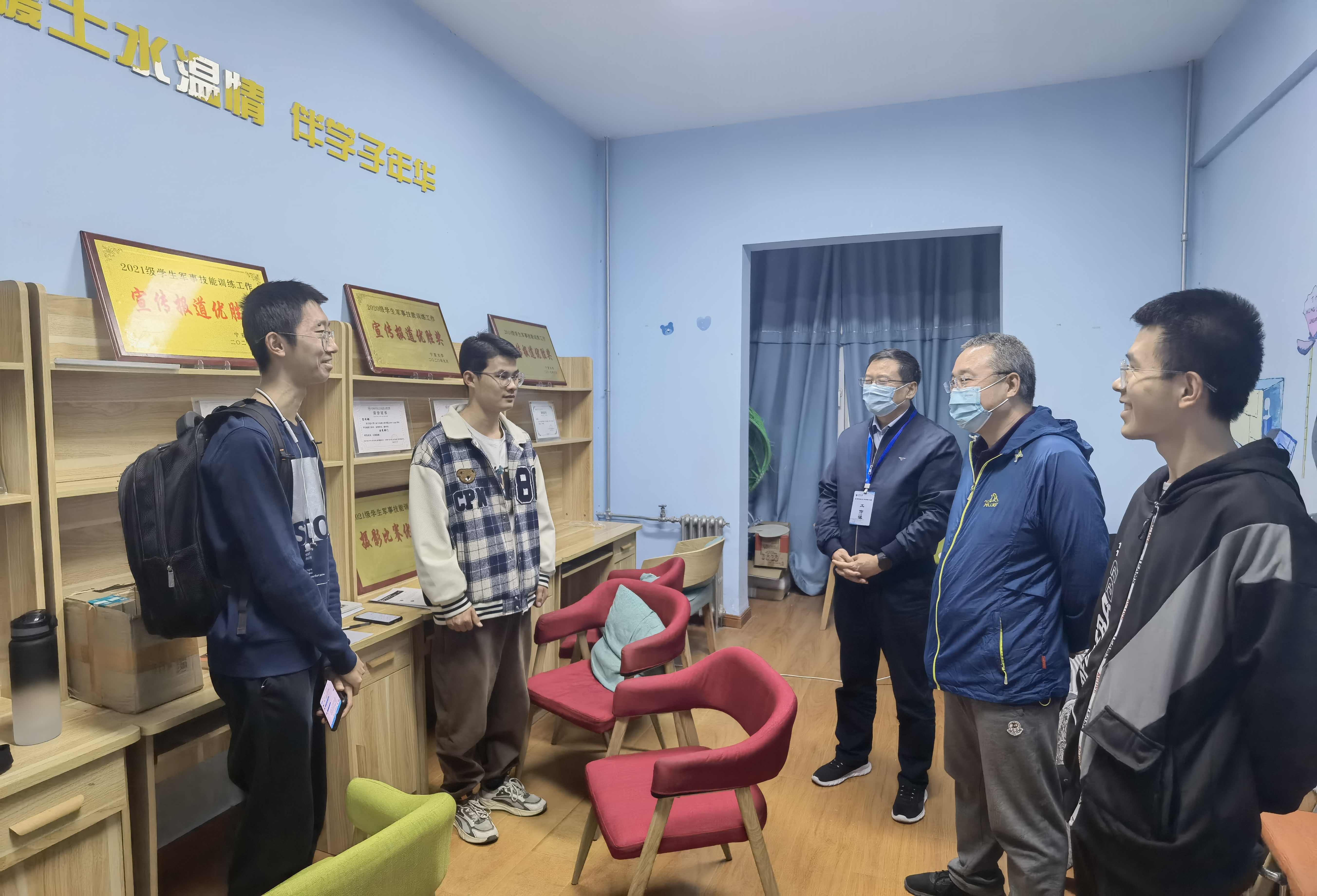 【beat365唯一官方网站新闻中心讯 土木与水利工程学院】为了解疫情期间学生思想状况,深入贯彻落实《beat365唯一官方网站中层以上领导干部“到学生中去”实施办法》,10月7日,beat365唯一官方网站党委常委、副校长王忠静在土木与水利工程学院党委书记陈晓敏的陪同下深入到土木与水利工程学院辅导员值班室、党员活动室、学生宿舍、学生食堂等地了解学生诉求,扎实开展好“七进一交友”活动。