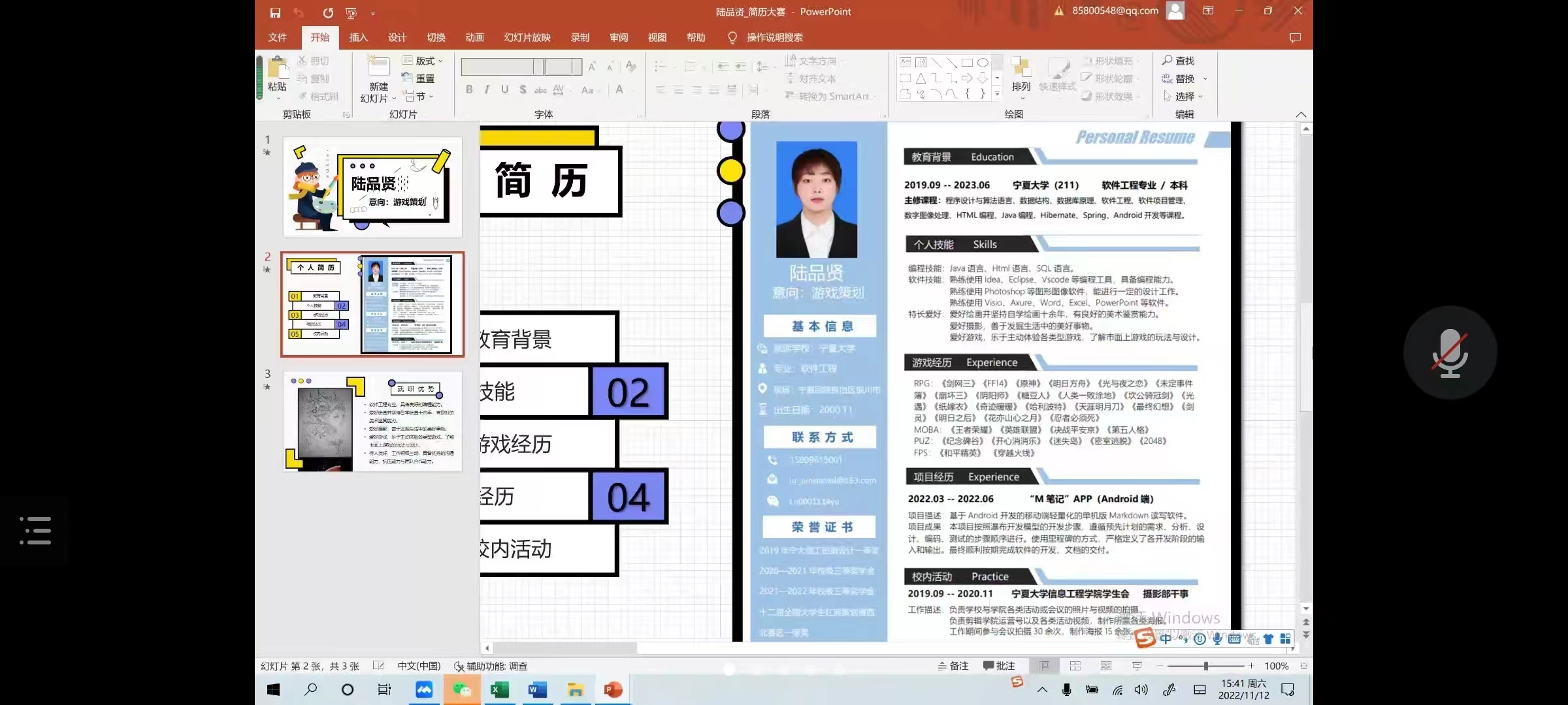 经过9月份初赛选拔后,11名选手入围决赛。决赛阶段11名选手依次介绍自己简历的制作过程,布局规划、亮点、特色等,选手们的讲解生动精彩呈现出鲜明的个人特征。在每位选手介绍完毕后,三位评委老师进行点评,并提出一些修改建议。