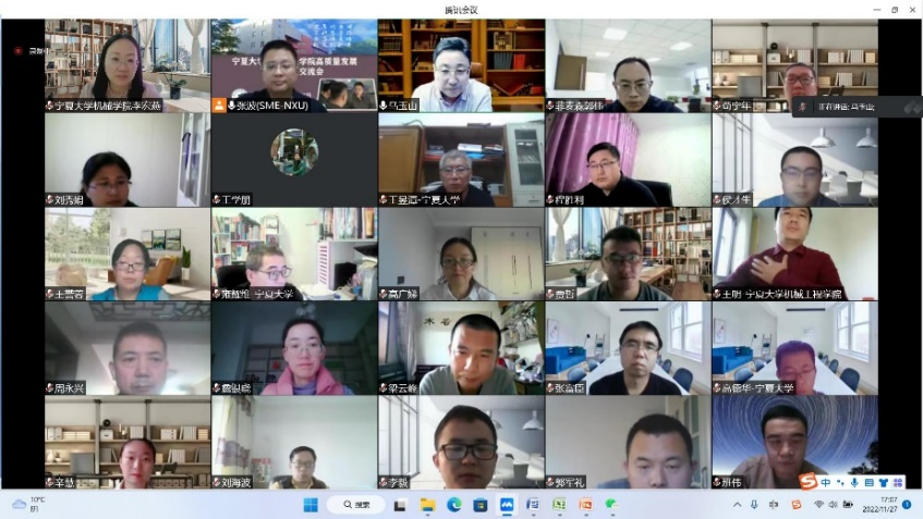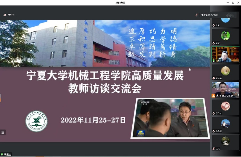 【beat365唯一官方网站新闻中心讯 机械工程学院】11月25-28日,机械工程学院党委组织召开了学院高质量发展教师访谈交流会。机械工程学院院长、中国工程院院士马玉山利用四天时间集中与学院50余名专任教师在线进行一对一交流访谈,交流会由学院执行院长张波主持。吴忠仪表有限责任公司总工程师王学朋、副总工程师刘海波、副总经理周永兴、宁夏菲麦森工业软件技术有限公司总经理郭伟等吴忠仪表团队骨干成员全程参加了访谈交流活动。
