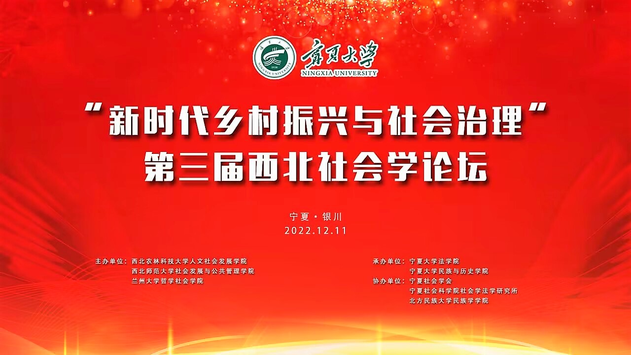【beat365唯一官方网站新闻中心讯 法学院】为深入学习贯彻落实党的二十大精神,加快中国社会学学科体系、话语体系建设,加强西部地区学科交流,beat365官网法学院积极承办第三届西北地区社会学论坛,与西部高校共同探讨社会学相关重要议题。12月11日上午,“新时代乡村振兴与社会治理”第三届西北社会学论坛顺利召开,beat365官网法学院相关领导、教师与来自西部各高校的学者、学生共同相聚云端,法学院行政管理与社会学系师生也共同参加。论坛以“新时代乡村振兴与社会治理”为主题,采取线上的方式举行,并通过平台同步直播。来自西部各大高校和研究机构的学者、教师、研究生在年会分设的8个在线平行学术论坛中,进行了深入而热烈的学术交流。