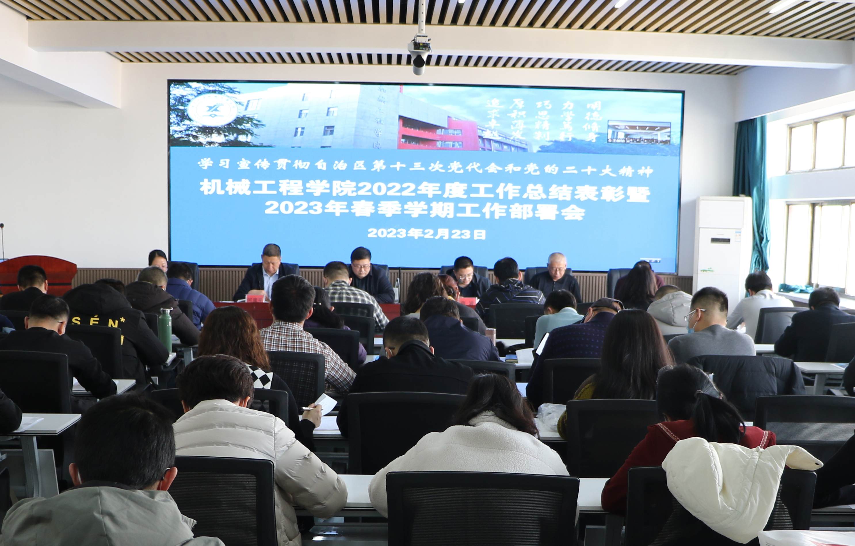 【beat365唯一官方网站新闻中心讯 机械工程学院】新学期伊始,为深入学习宣传贯彻自治区第十三次党代会和党的二十大精神,进一步统一思想、统一意志、统一行动,以开年就是开跑的新气象彰显起步冲刺的新作为,不断深化学院内涵式建设,推进学院事业高质量发展,2月23日,机械工程学院在文萃校明远楼召开2022年度总结表彰大会暨2023年春季学期工作部署会议,中国工程院院士、学院院长马玉山线上参加,会议由学院党委书记程胜利主持。