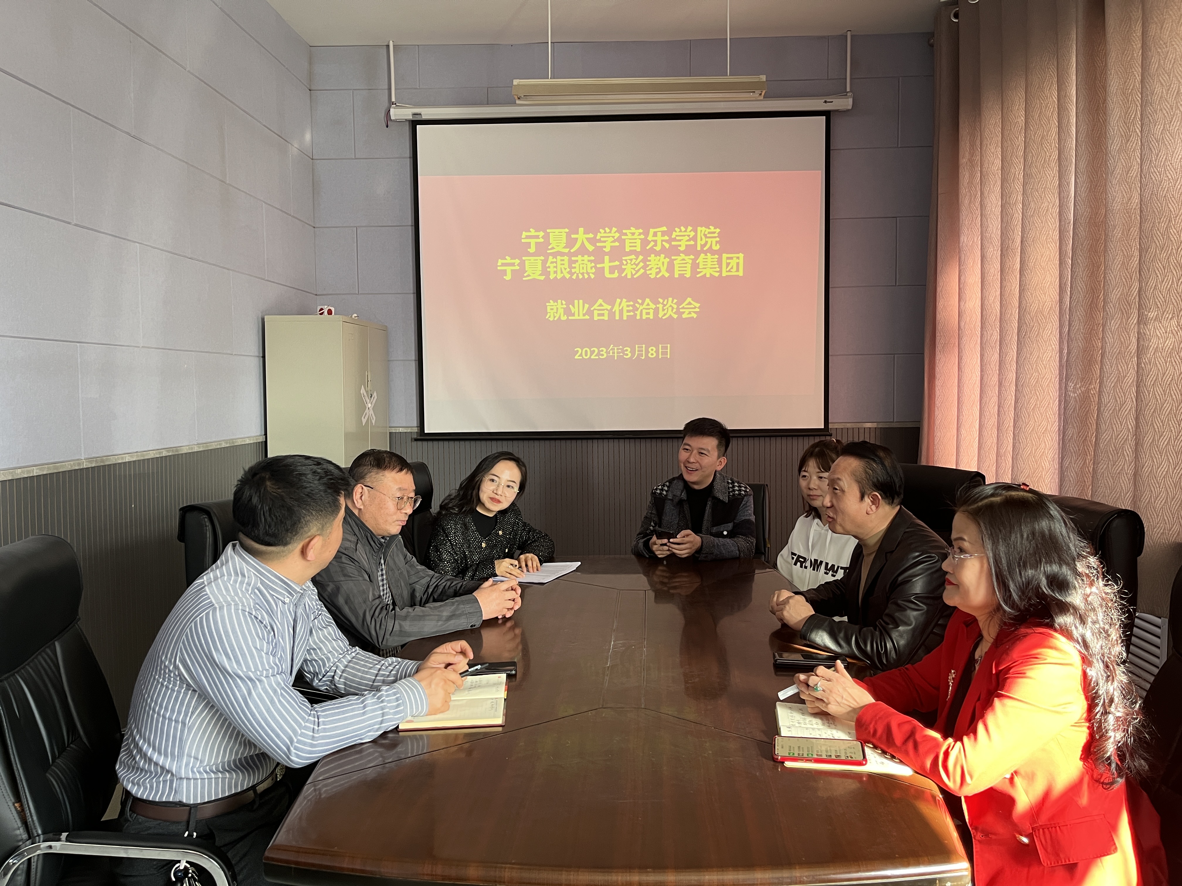 【beat365唯一官方网站新闻中心讯 音乐学院】为积极响应学校关于开展2023届毕业生春季促就业攻坚行动,抢抓春招关键期,全力攻坚促就业。3月8日,音乐学院与宁夏银燕七彩教育集团举行就业合作洽谈会,并针对2023届毕业生举办“银燕七彩”专场招聘宣讲会。音乐学院院长雷兴明,学院党委副书记贾述道,宁夏银燕七彩教育集团董事长朱宝全,总校副校长王声明等人参加了本次洽谈及宣讲会。