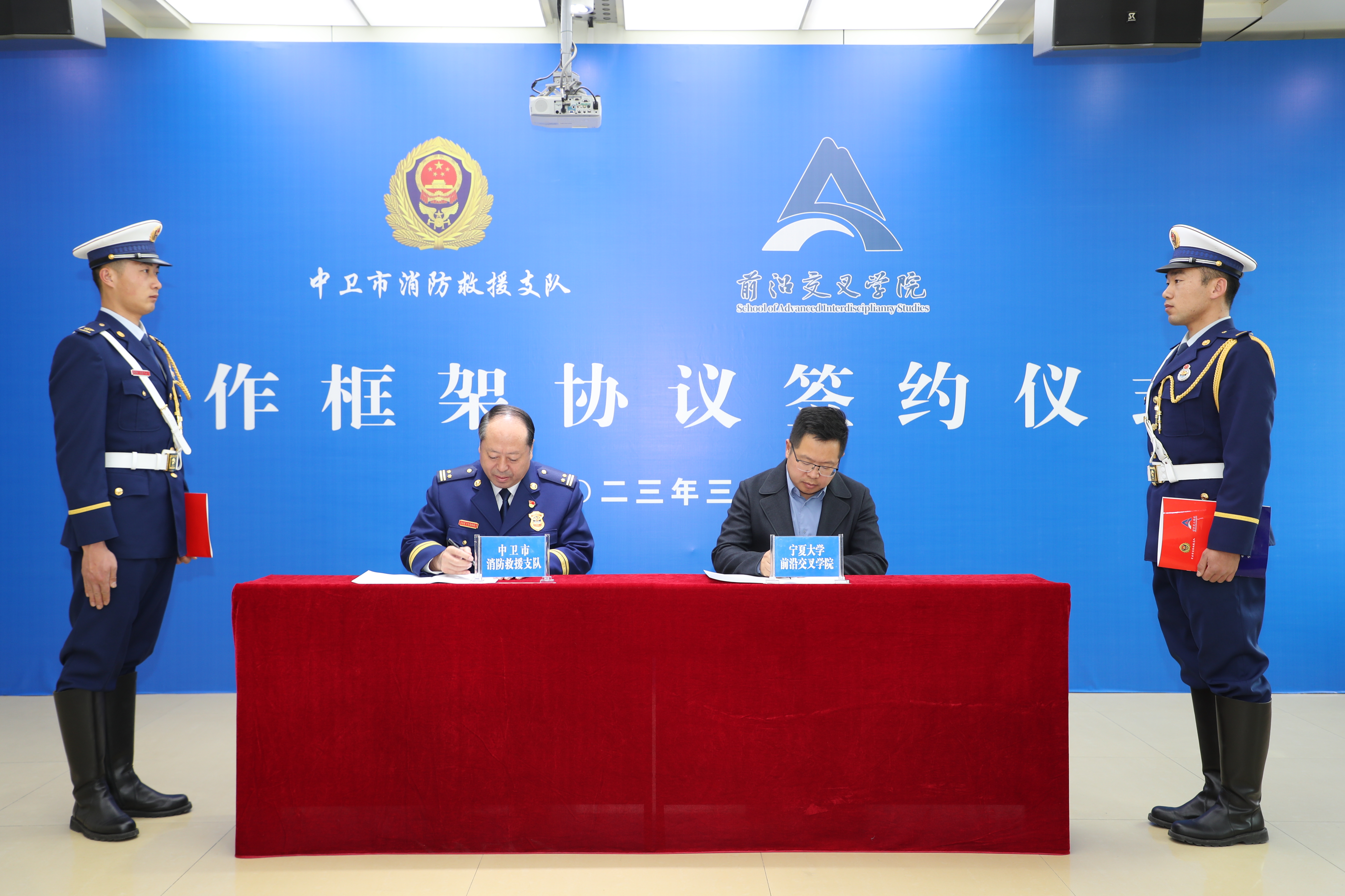 【beat365唯一官方网站新闻中心讯 前沿交叉学院】为深入贯彻落实全国消防救援队伍人才工作会议精神,全面加强高校与消防救援队伍的有机融合,3月22日下午,前沿交叉学院与中卫市消防救援支队举行合作框架协议签约仪式。支队党委书记、政治委员逯恒,党委副书记、支队长武秀宏,学院党总支书记任磊,执行院长王磊、对外合作与交流办公室主任房彦兵、综合办公室主任贾随生出席仪式。学院师生代表和支队机关各科室负责人、基层指战员代表参加仪式。