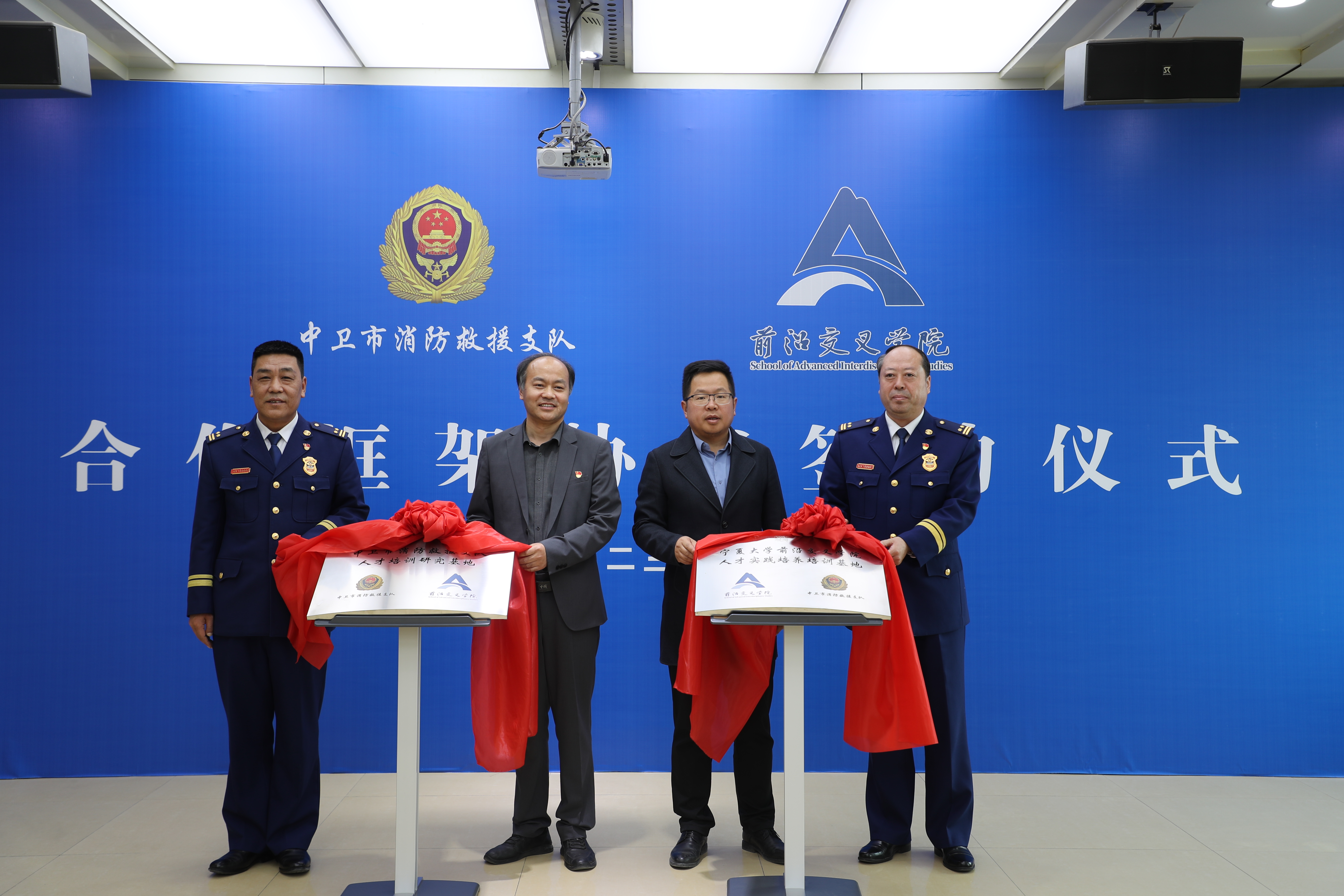 签约仪式上,逯恒和任磊分别致辞,王磊与武秀宏代表双方签订了《中卫市消防救援支队—beat365唯一官方网站前沿交叉学院合作框架协议》与《消防科技协作框架协议书》,在复杂系统分析、GIS建设应用、大数据智能化、无人机灭火救援等领域明确了合作意向。与会领导共同为“中卫市消防救援支队人才培训研究基地”和“beat365唯一官方网站前沿交叉学院人才实践培养培训基地”揭牌。