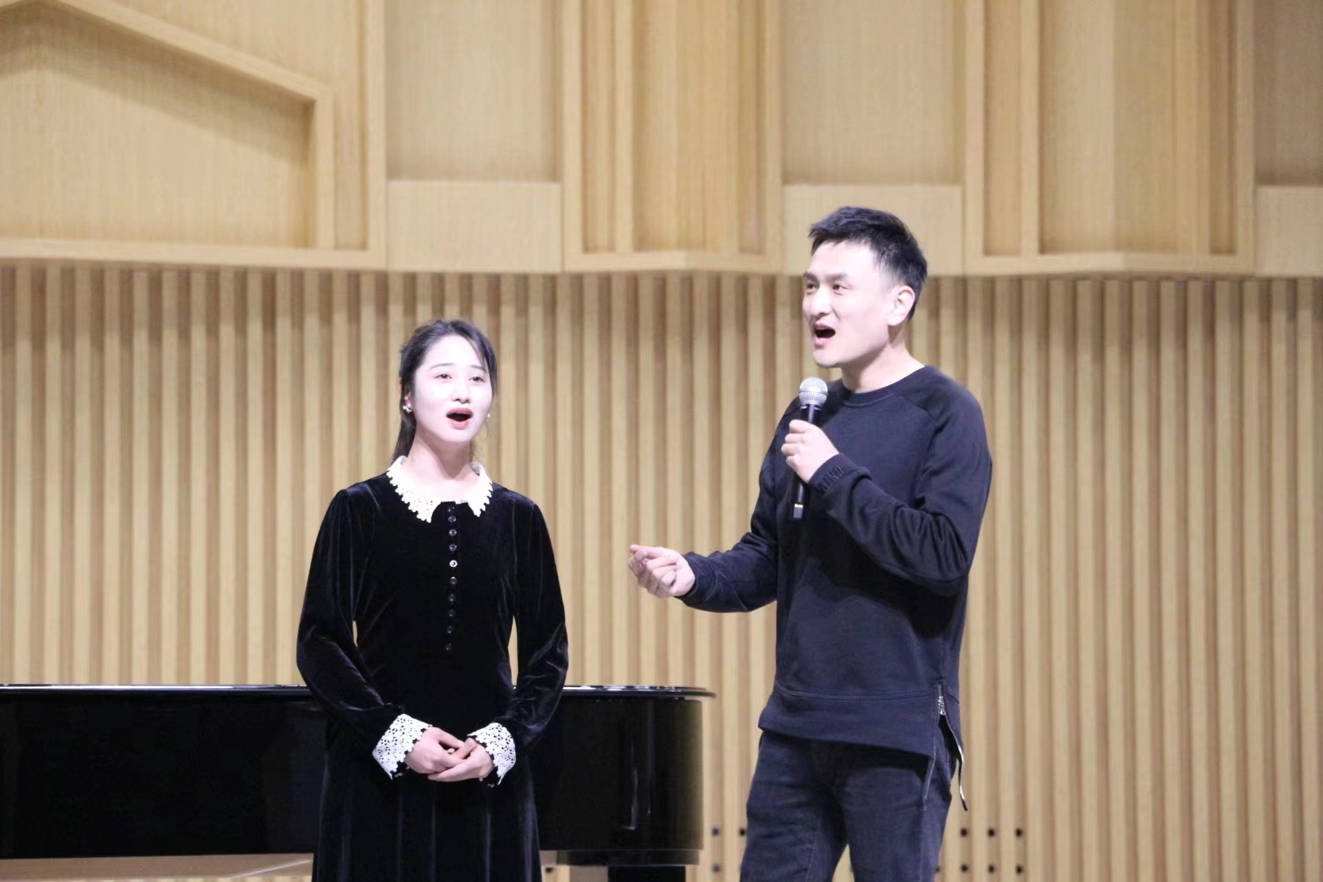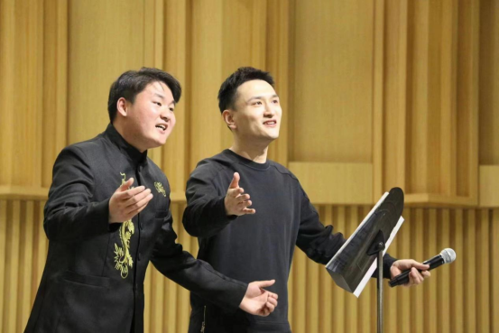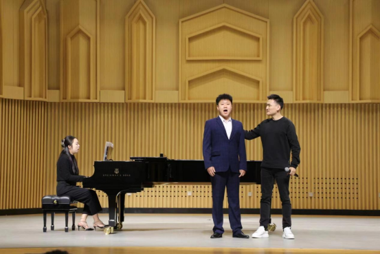 为期两天的公开课上,马小明博士认真聆听了15名同学的演唱,细细点评,亲自示范,对单个歌词的发音、旋律情绪的表达以及各种不同的唱法进行了深入浅出的讲解。在马小明专业的点评、鼓励、示范、领唱下,同学们踊跃展示唱腔唱法,在现场学习中改进发声技巧和表演风貌,或悠长或激昂的歌声在音乐厅的上空交织,让本就活跃的大师课堂再添几分浓厚的氛围,现场互动热烈。