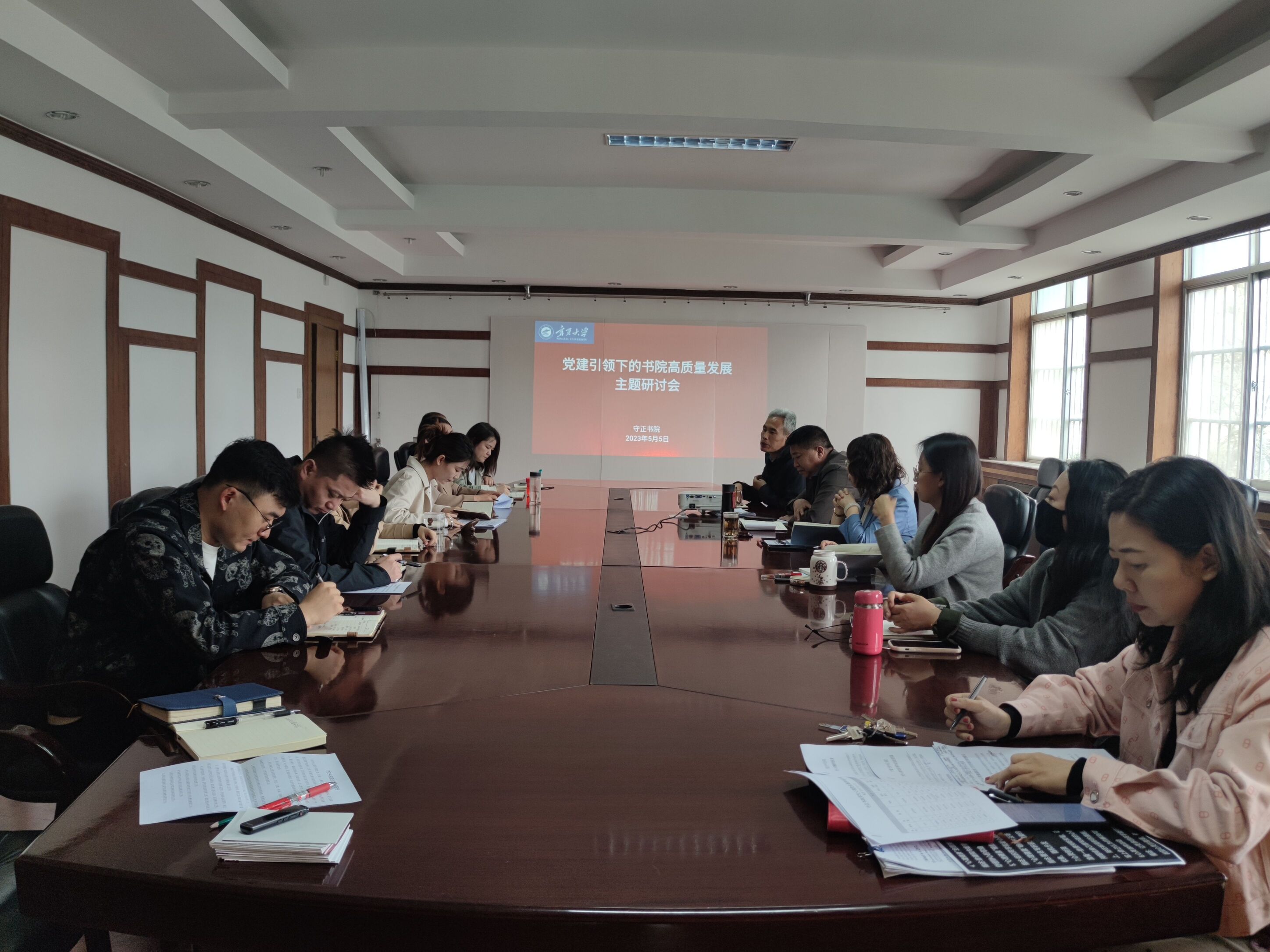 【beat365唯一官方网站新闻中心讯 守正书院】为把学习贯彻习近平新时代中国特色社会主义思想主题教育谋划好、组织好、落实好,进一步推动书院高质量新发展,5月5日上午,守正书院于怀远校区德言楼309会议室开展“党建引领下的书院高质量发展主题研讨会”。会议由守正书院党委副书记何文栋主持,守正书院党委书记、院长闫蓉,副书记赵永军,副院长顾珍以及书院全体辅导员参加。