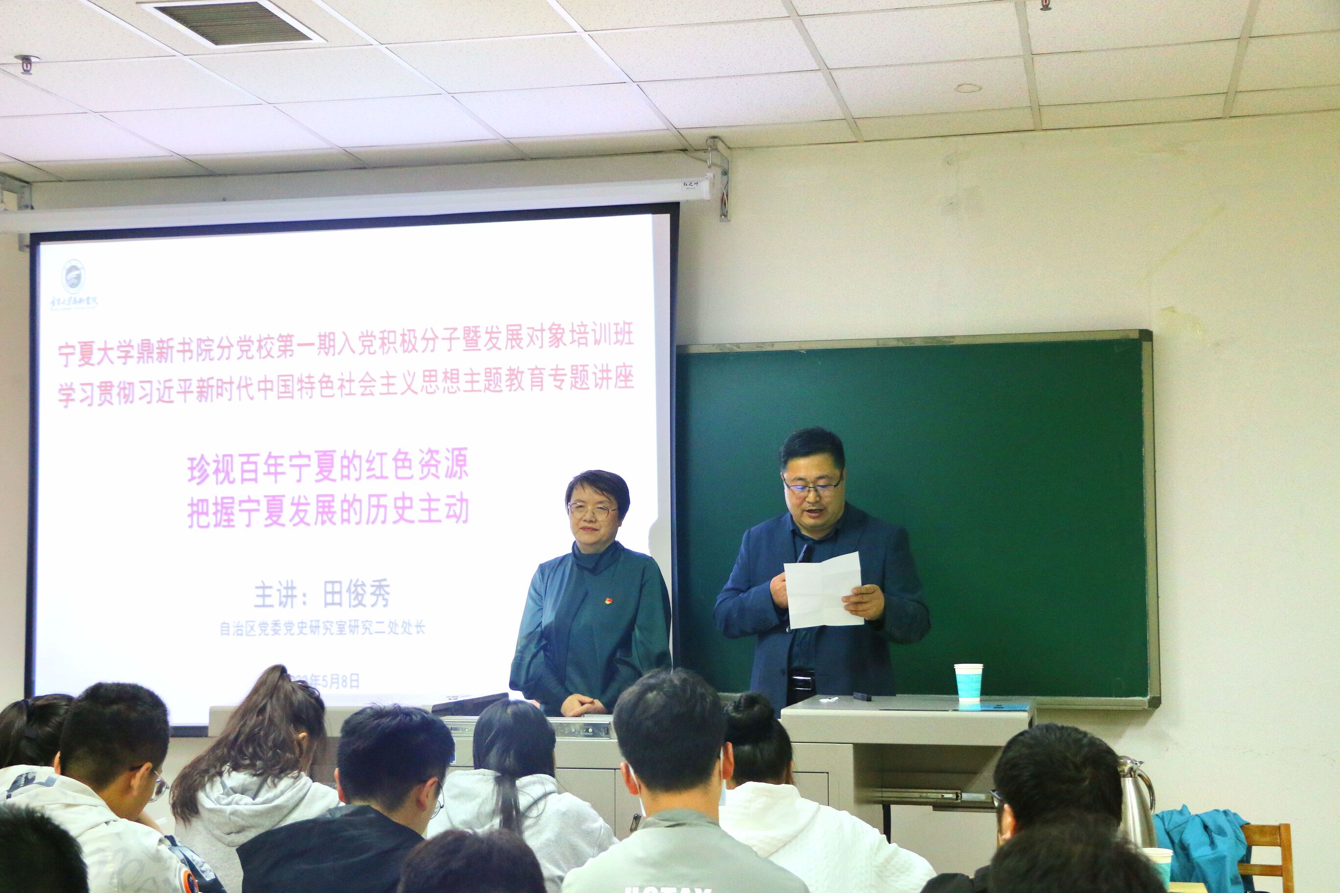 【beat365唯一官方网站新闻中心讯 鼎新书院】为推进学习贯彻习近平新时代中国特色社会主义思想主题教育,5月8日晚,beat365唯一官方网站鼎新书院于文萃校区文萃二教208教室举行学习贯彻习近平新时代中国特色社会主义思想主题教育专题讲座,自治区党委党史研究室二处处长田俊秀做宣讲报告,鼎新书院党委书记、院长程胜利主持报告会,书院所有发展对象和入党积极分子参加此次报告会。
