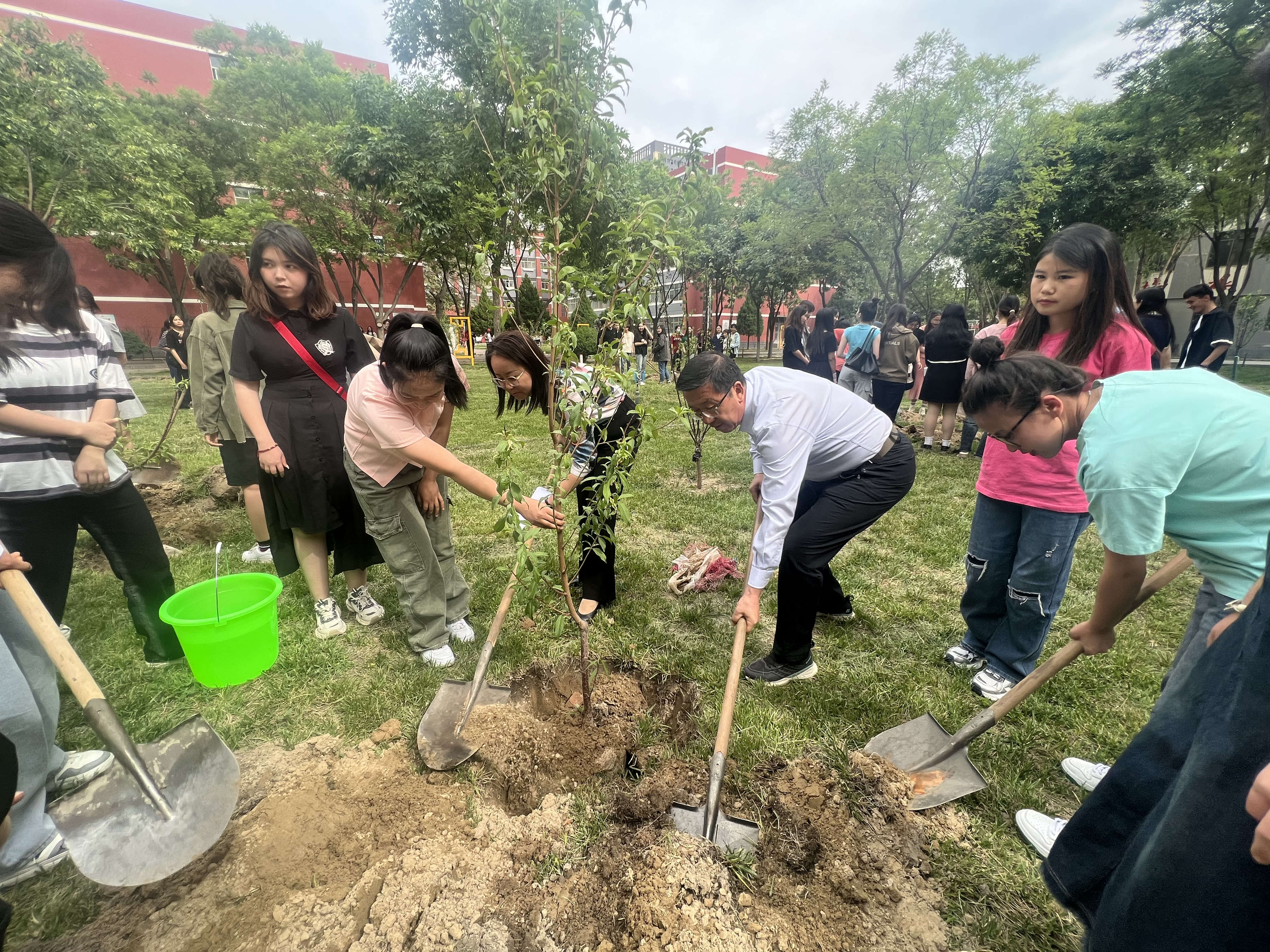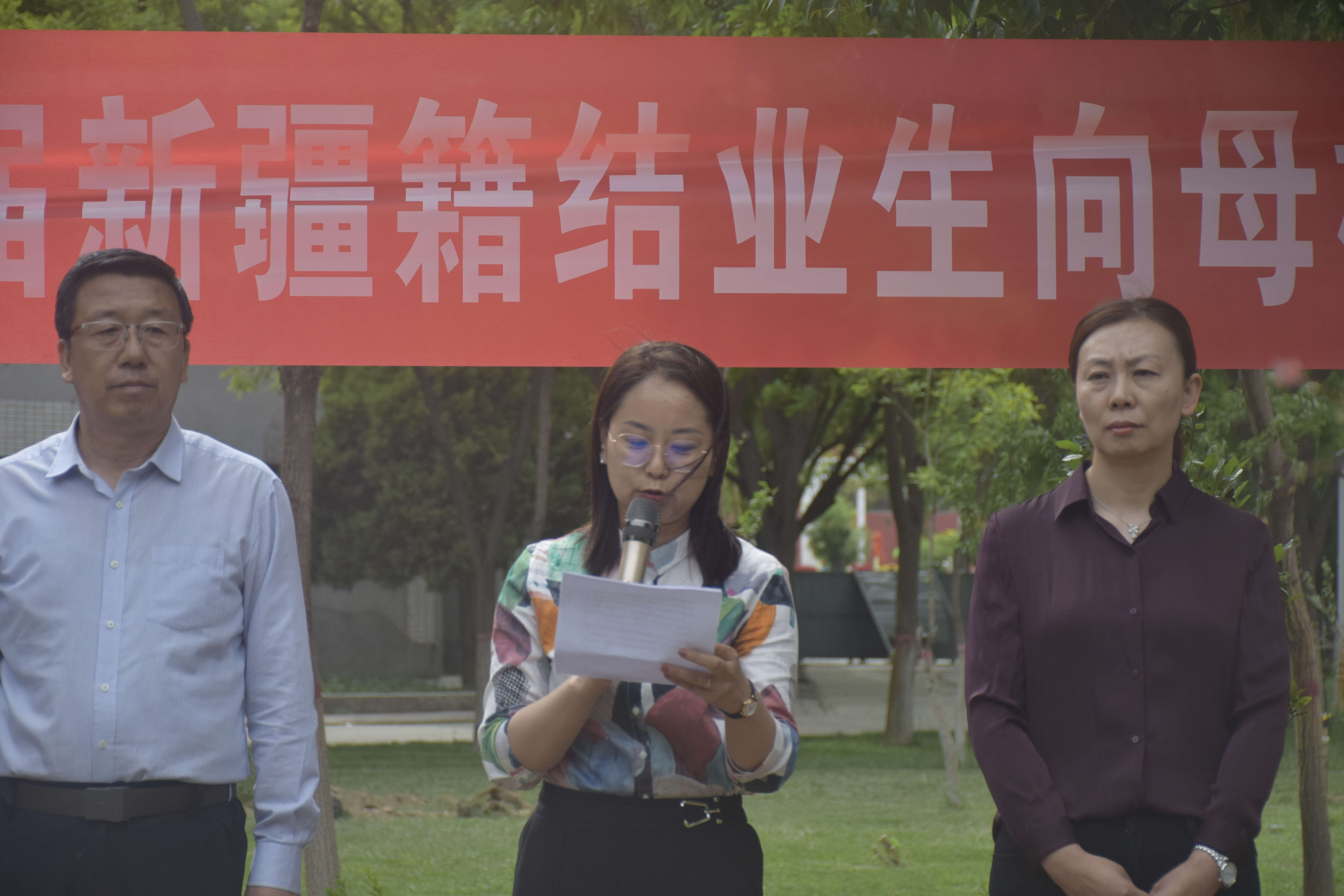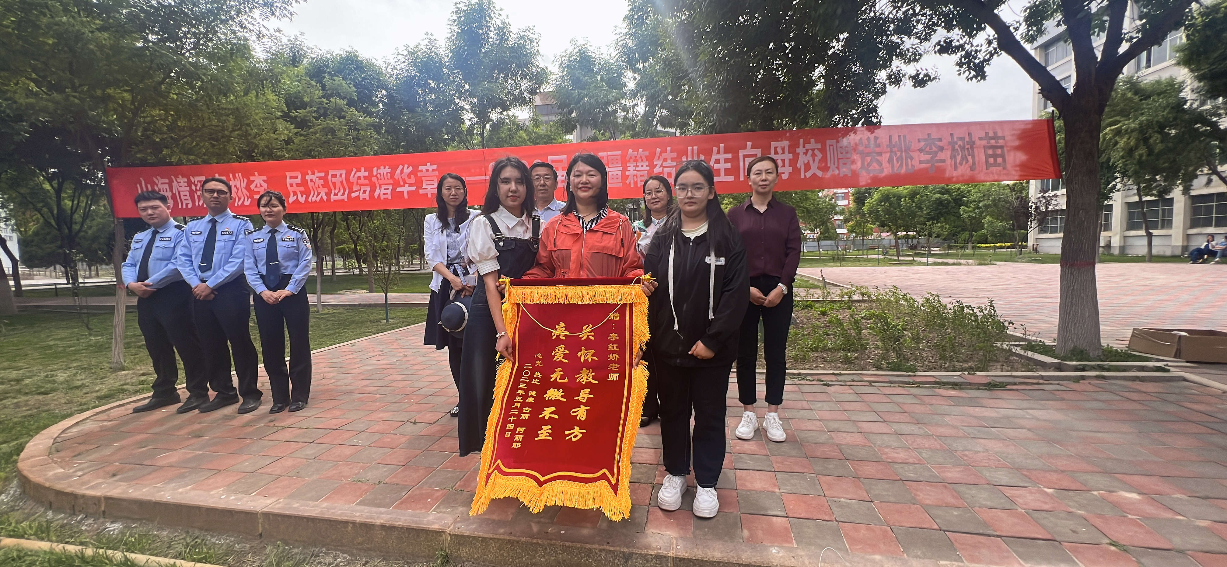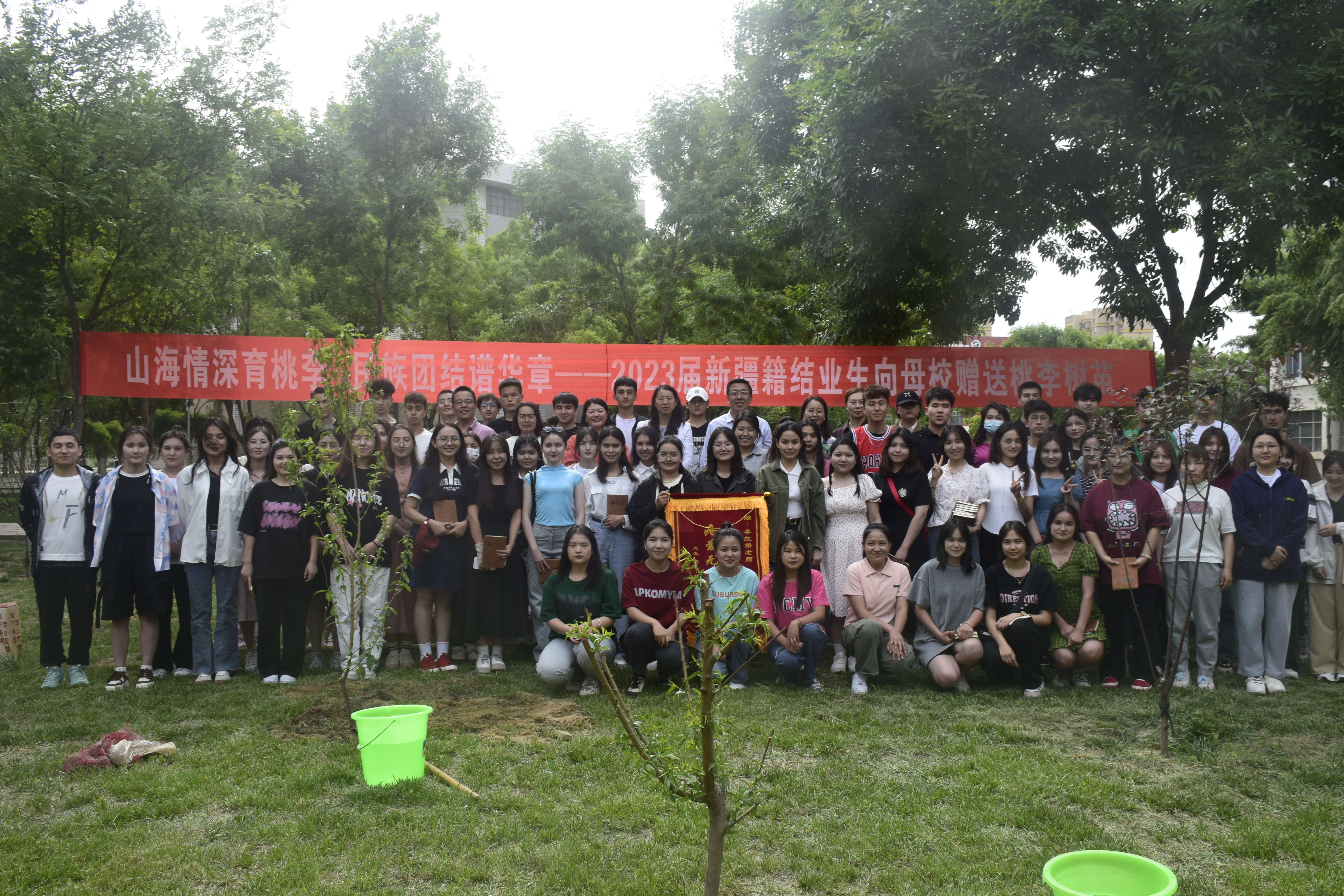 2023届新疆籍结业生代表阿丽耶·艾麦提、凯丽比努尔·热则克、热比·麦麦提敏向母校捐赠树苗,学院师生共植桃李树。新疆籍学生为母校种下的一颗颗桃李树,更是一颗民族团结之树,在以后的风风雨雨中,经过每一届学生的精心照顾,相信民族团结之花一定会盛开,民族团结之果实也一定会硕果累累,民族团结之情谊也一定会更加坚实。它将成为一种独特的纪念,见证莘莘学子的成长印迹,传承母校对你们的殷切关怀。