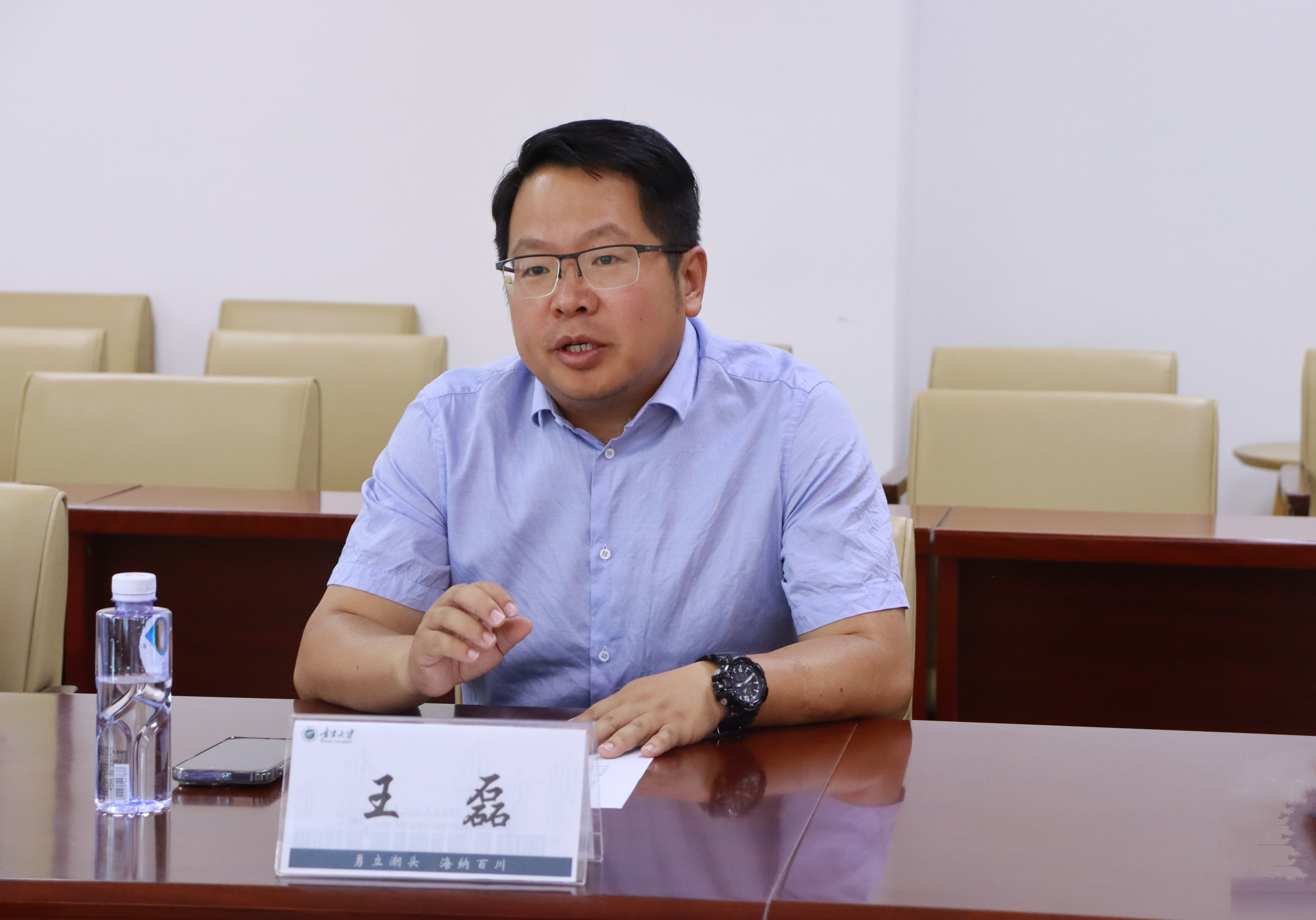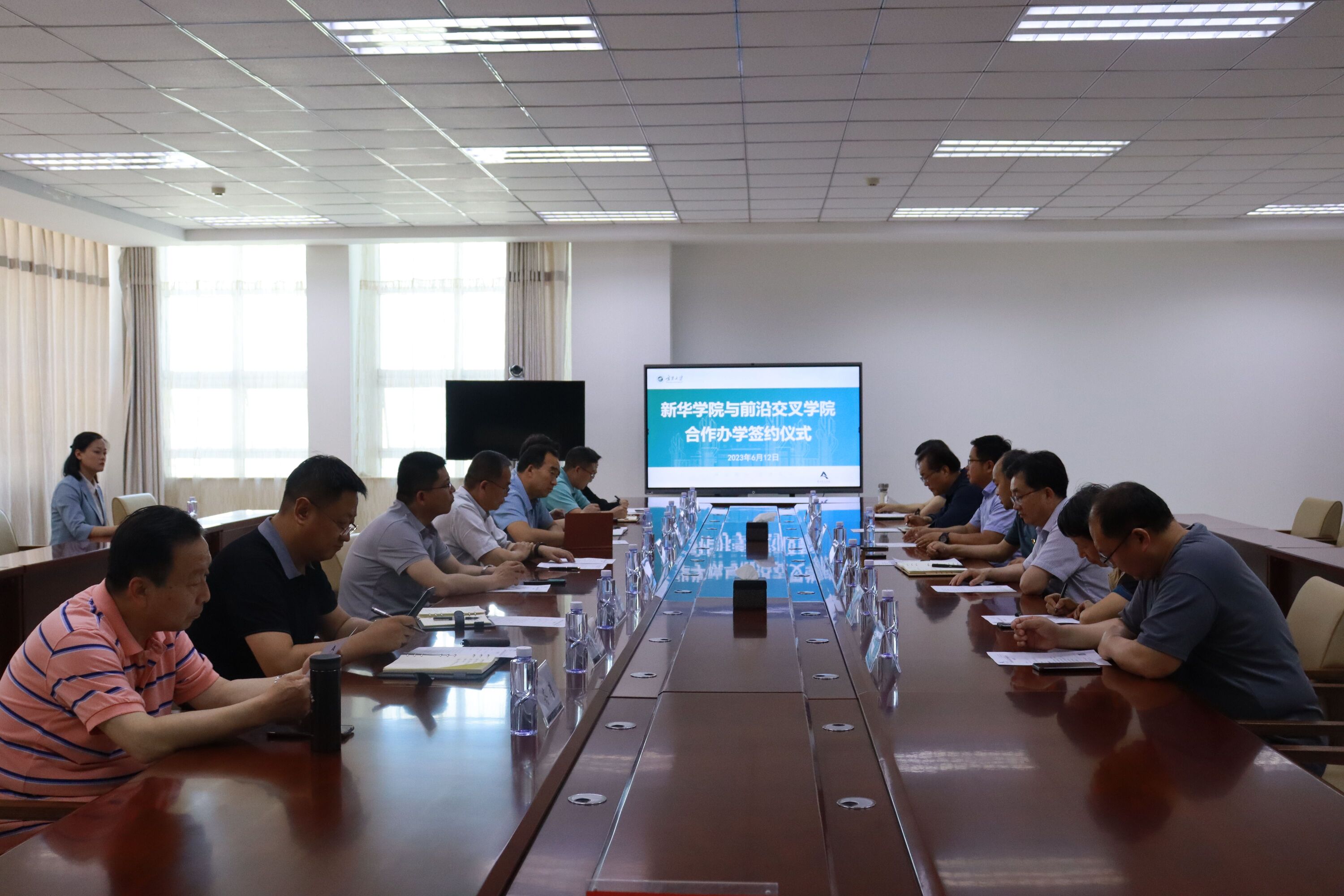 【beat365唯一官方网站新闻中心讯 前沿交叉学院】为进一步整合办学资源,实现跨校区联动,创新合作办学机制,6月12日下午,新华学院党委书记、政府督导员杨文刚,党委副书记、常务副院长罗进德等一行莅临我院就双方合作办学事宜座谈签约。前沿交叉学院党总支书记任磊,党总支副书记、执行院长王磊,博雅书院党委书记张翼等相关领导参加会议,签约仪式由王磊主持。