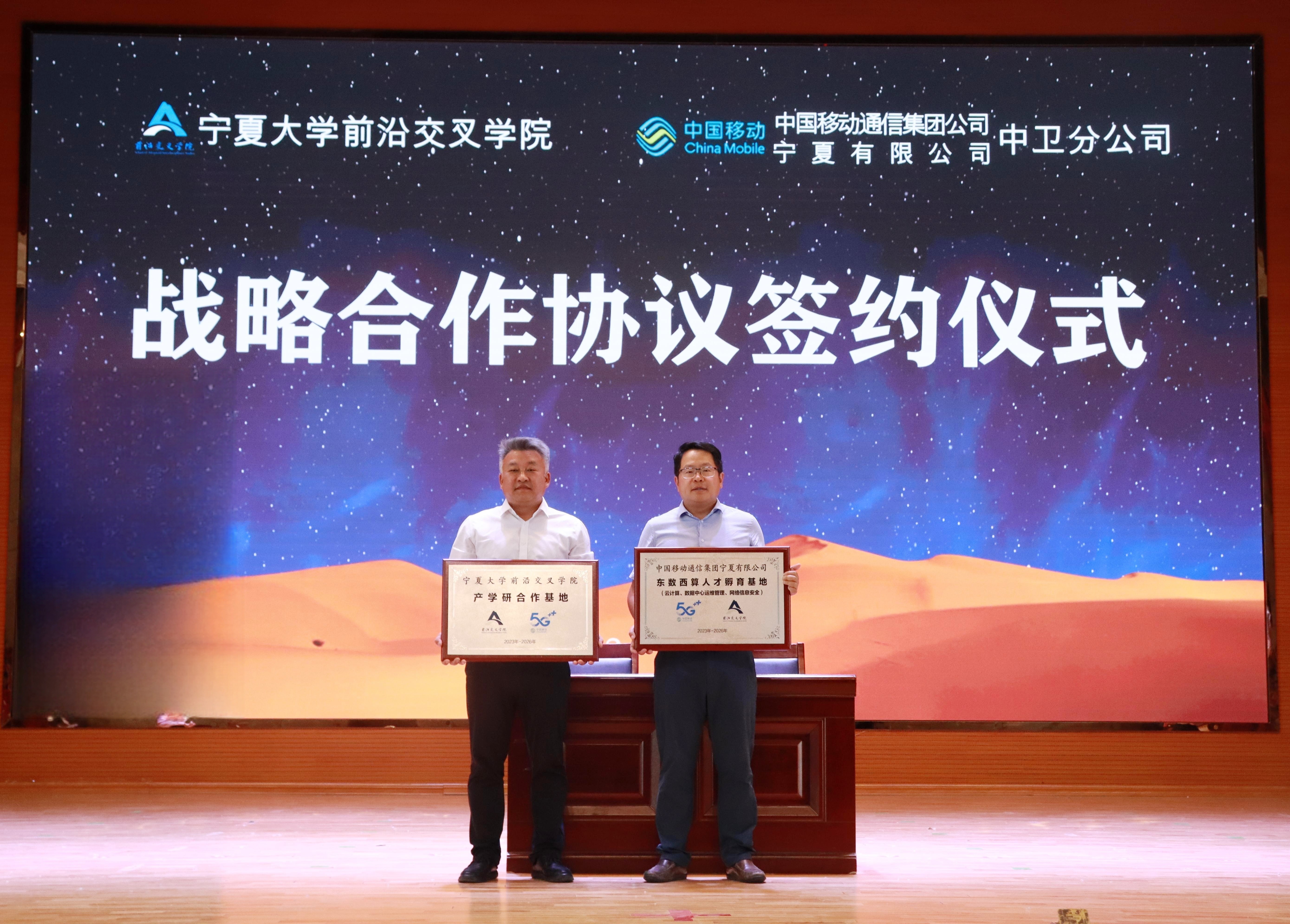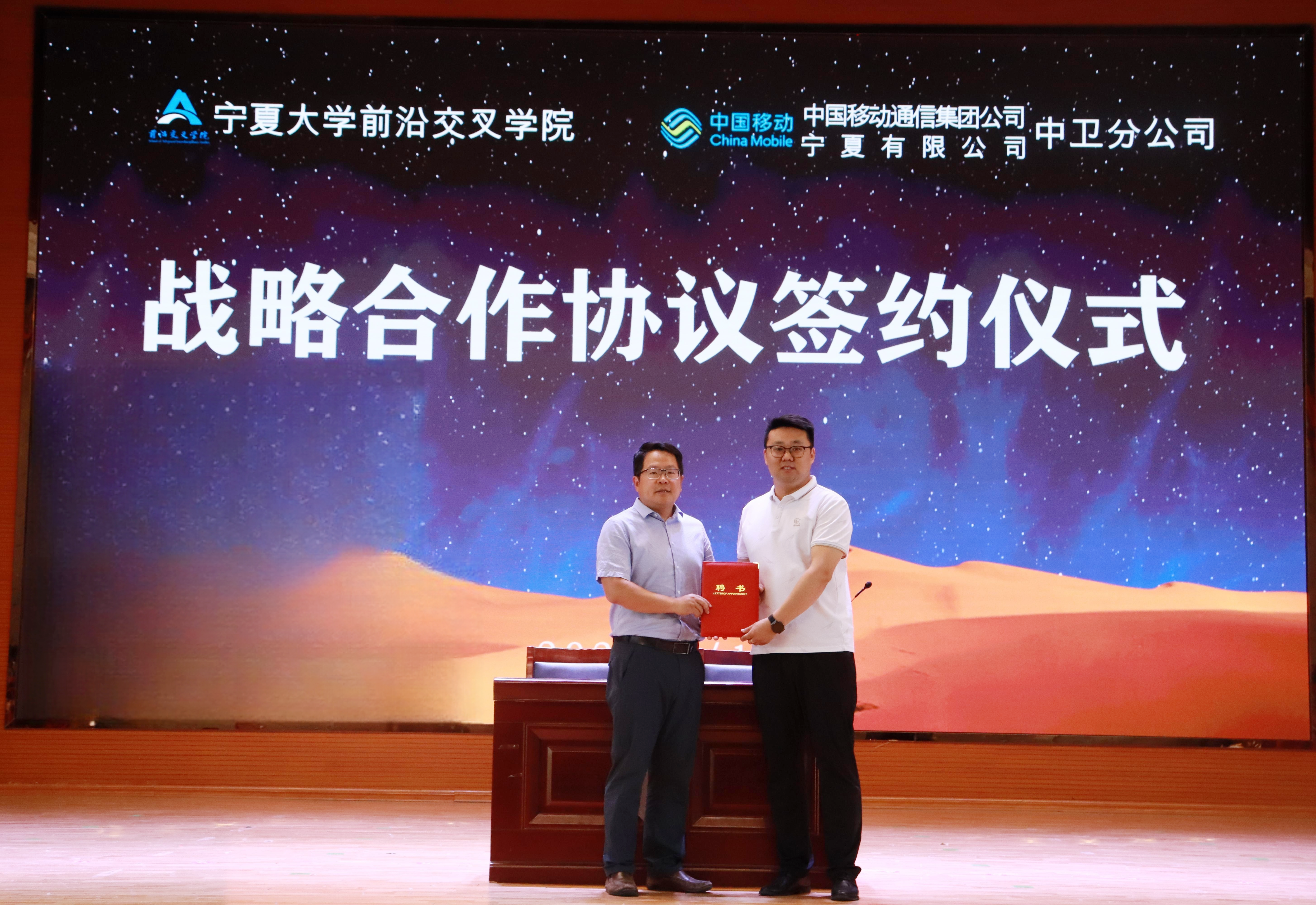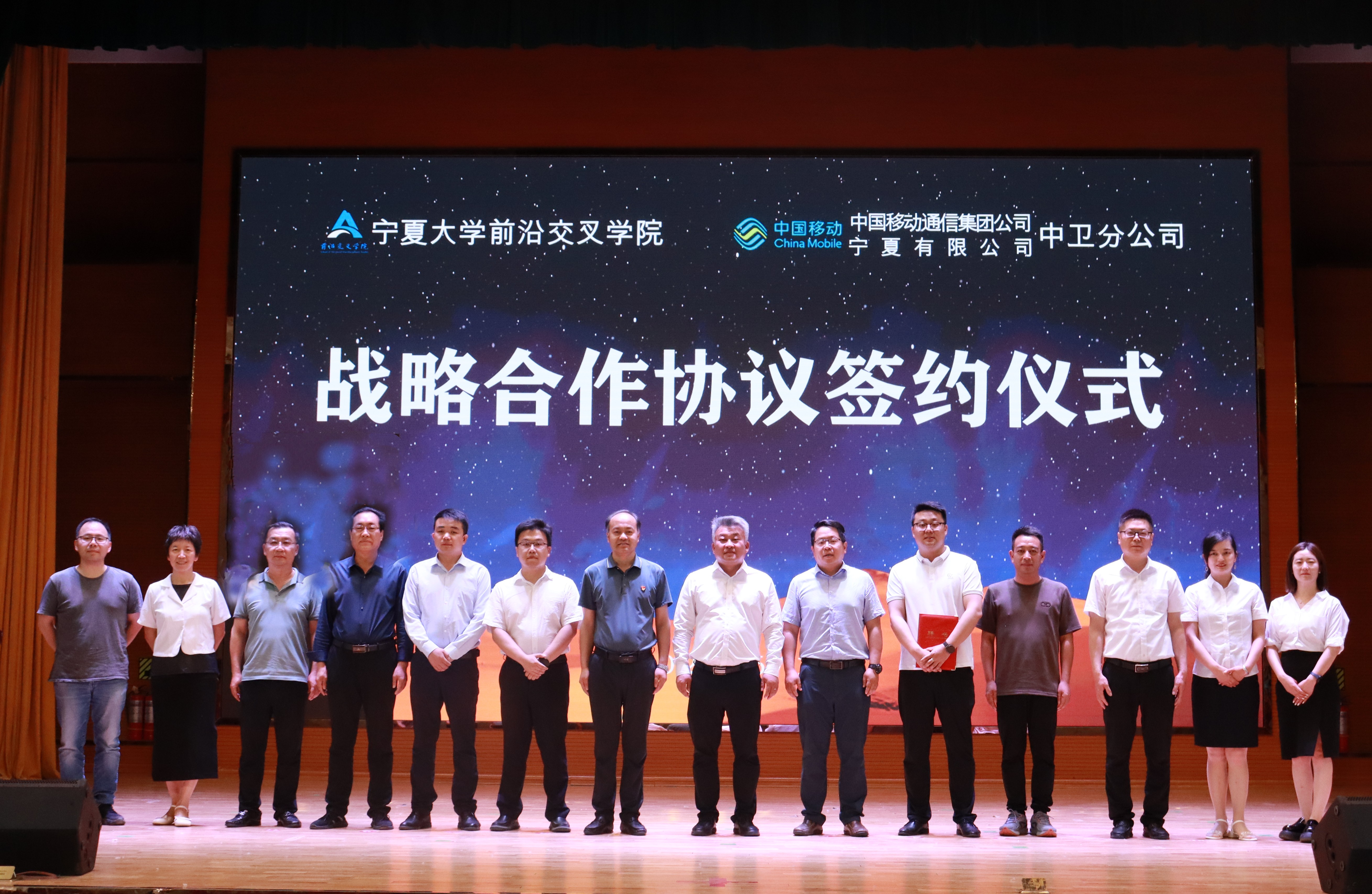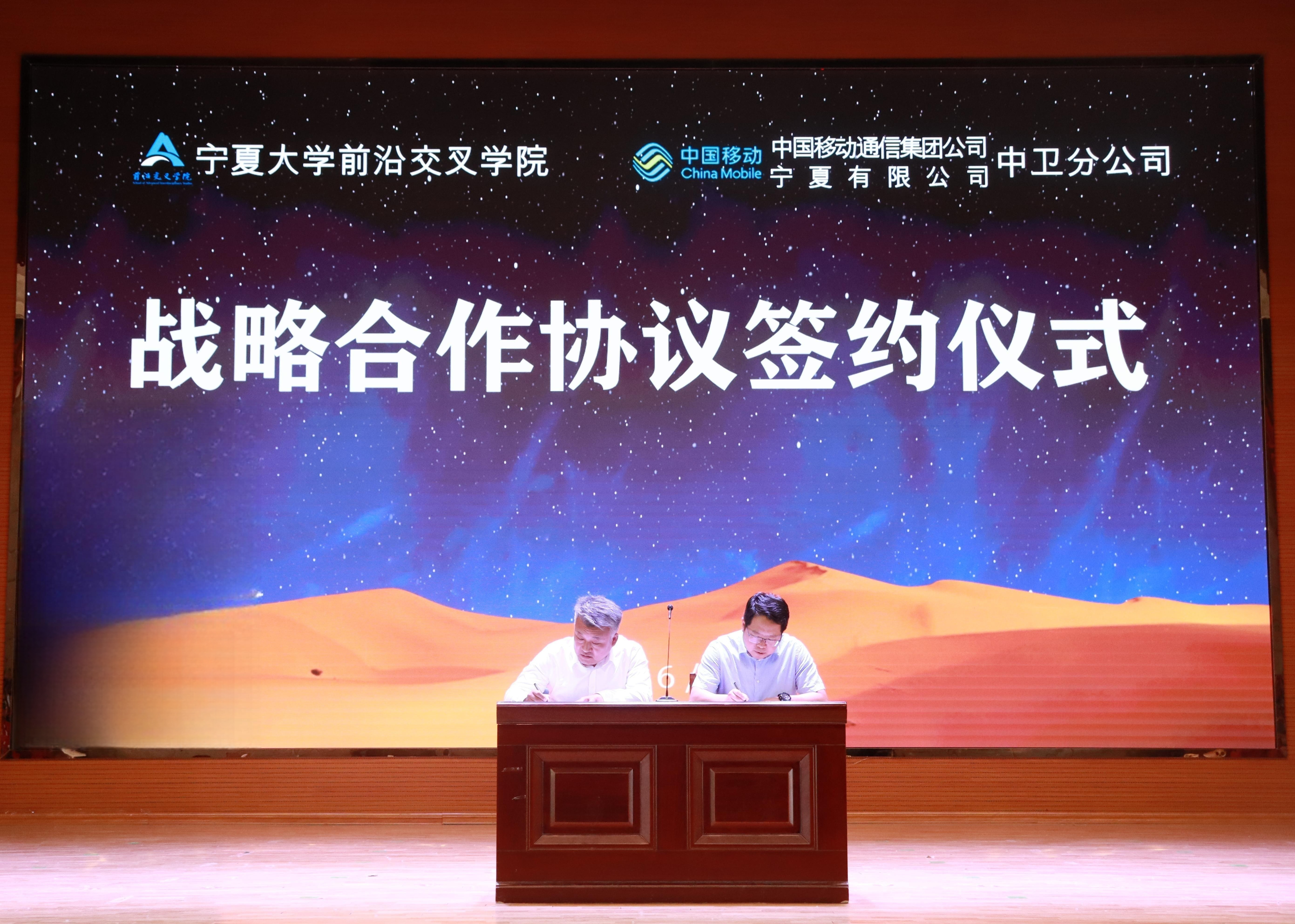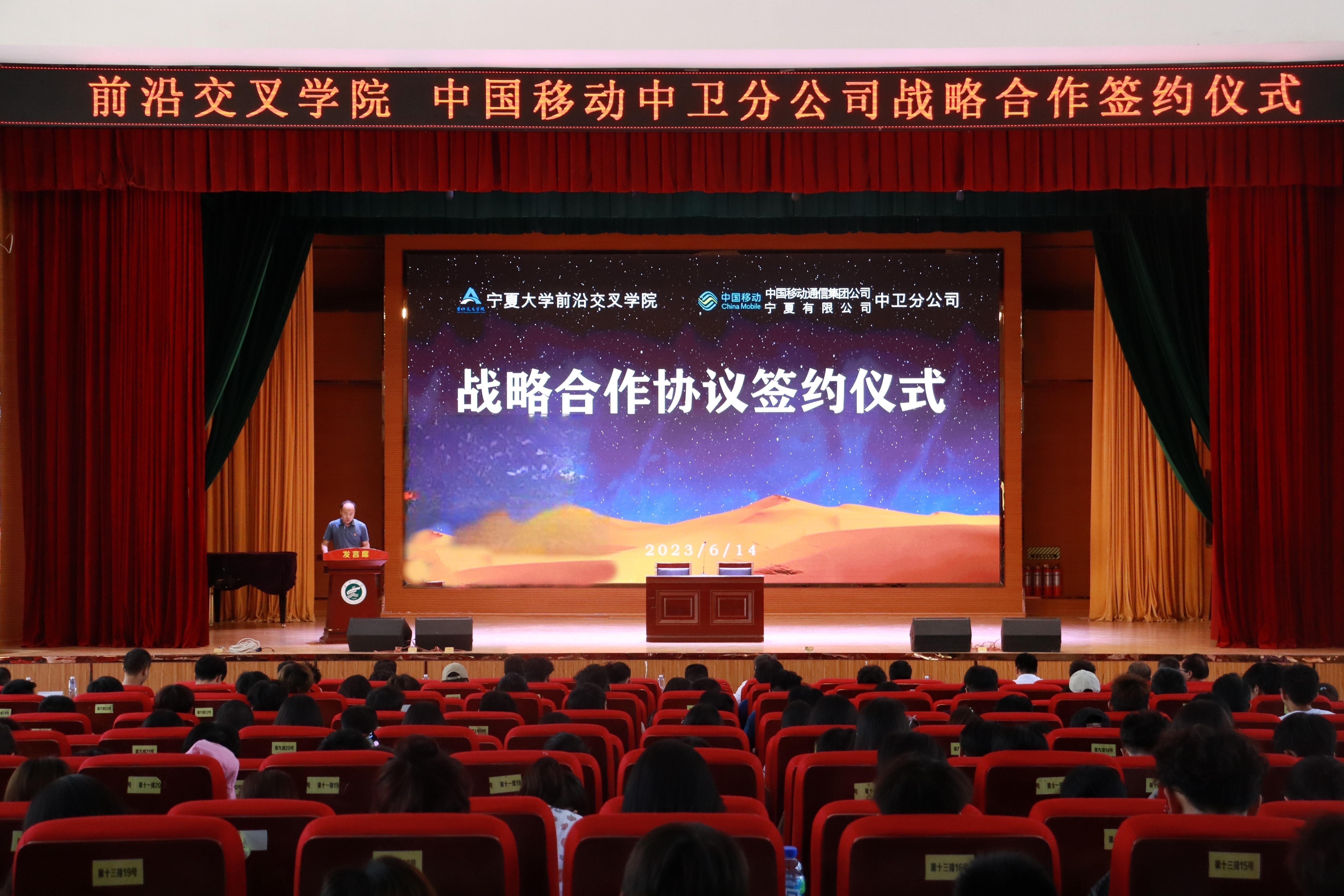 【beat365唯一官方网站新闻中心讯 前沿交叉学院】为深化校企合作,共建政产学研用为一体的高层次人才培育基地、创新项目孵育基地、5G+智慧校园示范基地,创新人才培养模式,提高人才培养质量。6月14日下午,前沿交叉学院与中国移动通信集团宁夏有限公司中卫分公司战略合作协议签约仪式在中卫校区应理报告厅隆重举行。中国移动通信集团宁夏有限公司中卫分公司党委书记、总经理唐红涛,副总经理宗伟,宁夏启明星辰信息安全技术有限公司技术总监路磊,前沿交叉学院党总支书记任磊,党总支副书记、执行院长王磊等领导及学院师生400余人参加了本次签约仪式。签约仪式由刘玉奇老师主持。