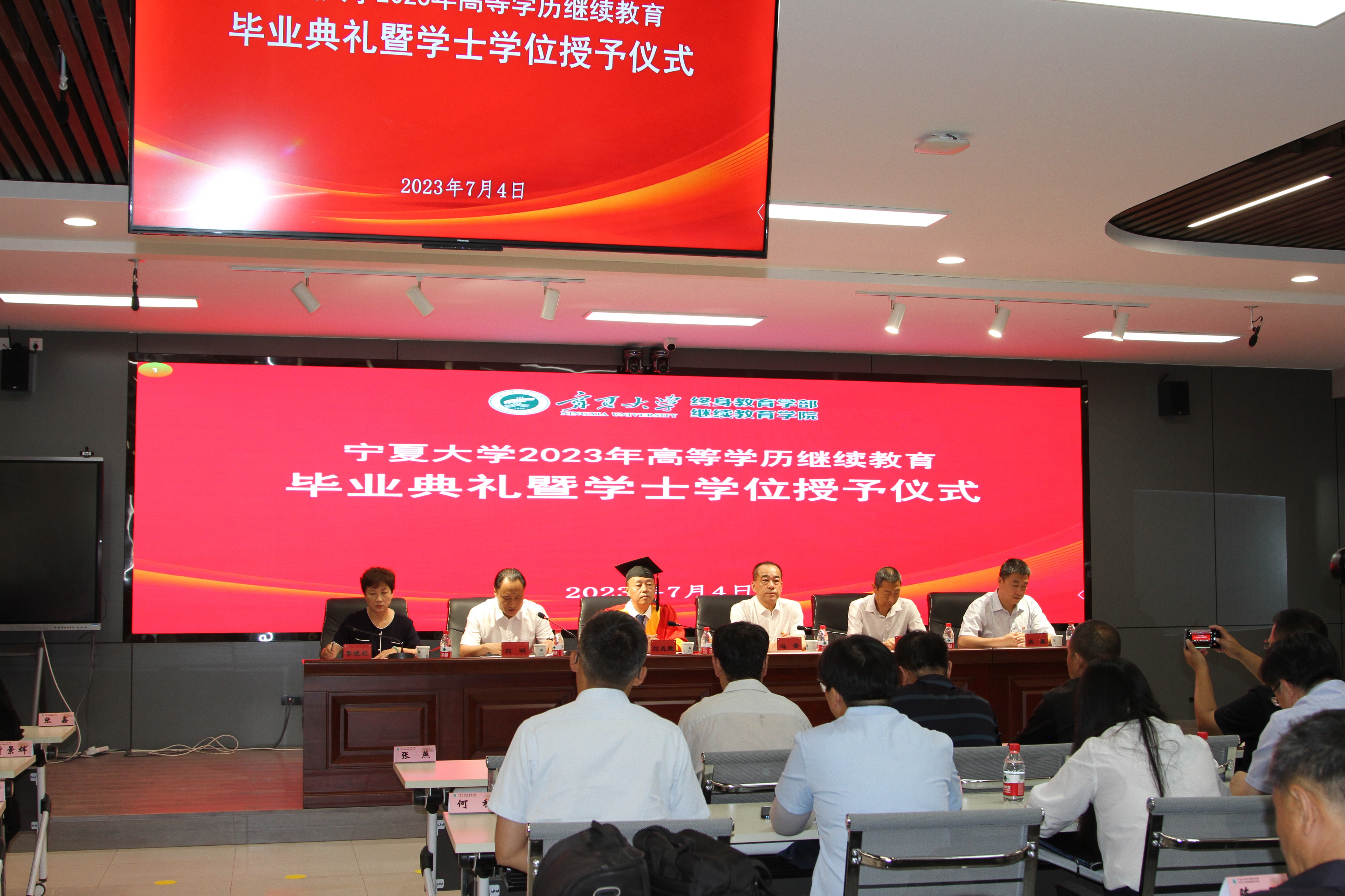 【beat365唯一官方网站新闻中心讯 继续教育学院】7月4日上午,beat365唯一官方网站高等学历继续教育2023届毕业生典礼暨学士学位授予仪式在金凤校区隆重举行。校党委常委、副校长刘炎胜,终身教育学部、继续教育学院领导冯奎、刘明、李晓红、高鹏翔、张鑫出席。学院全体教职工、各校外教学点、自学考试助学机构负责人、学士学位获得者、优秀毕业生等百余人参加仪式。仪式由学院院长刘明主持。