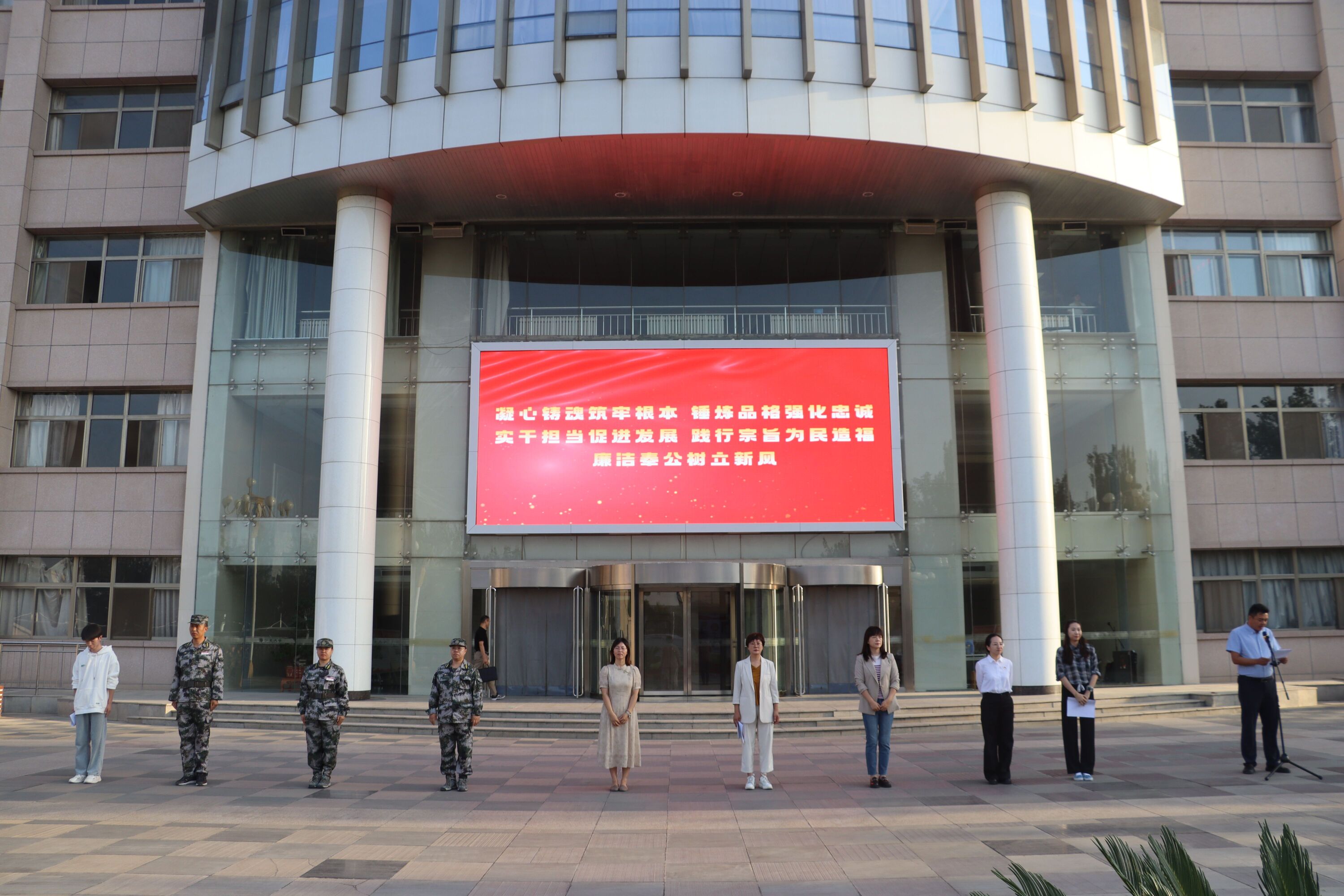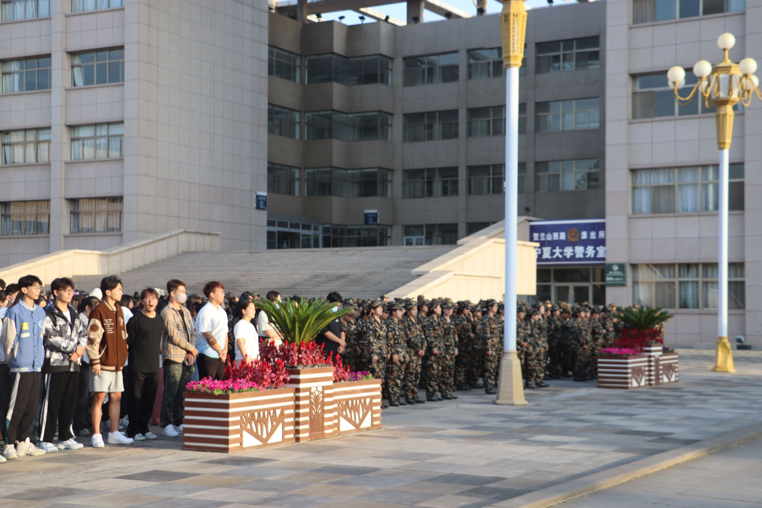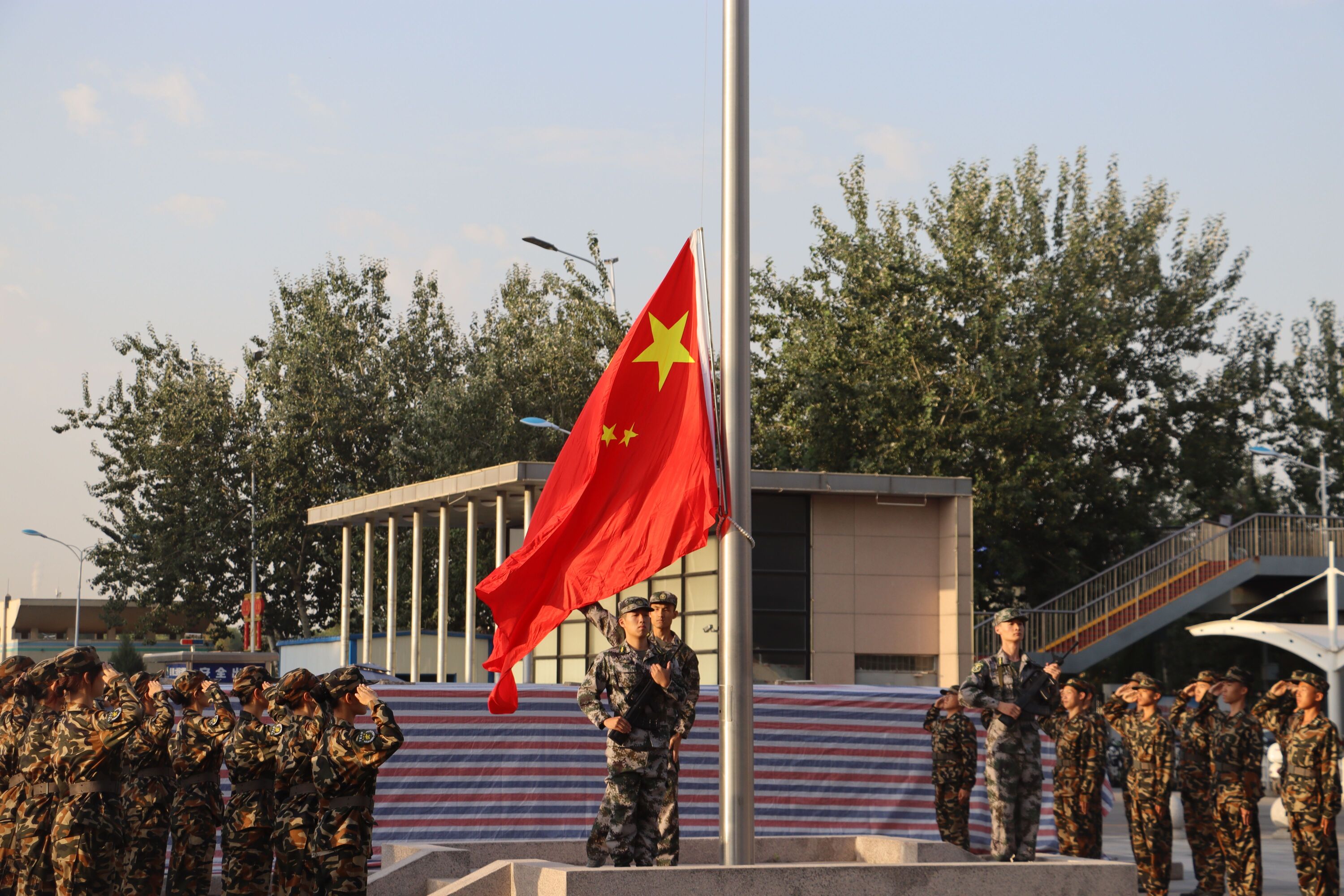 迎着旭日朝阳,国旗护卫队昂首挺胸,迈着整齐划一的步伐来到升旗台下,在国歌声中,五星红旗冉冉升起,师生面向国旗行注目礼,齐唱国歌。