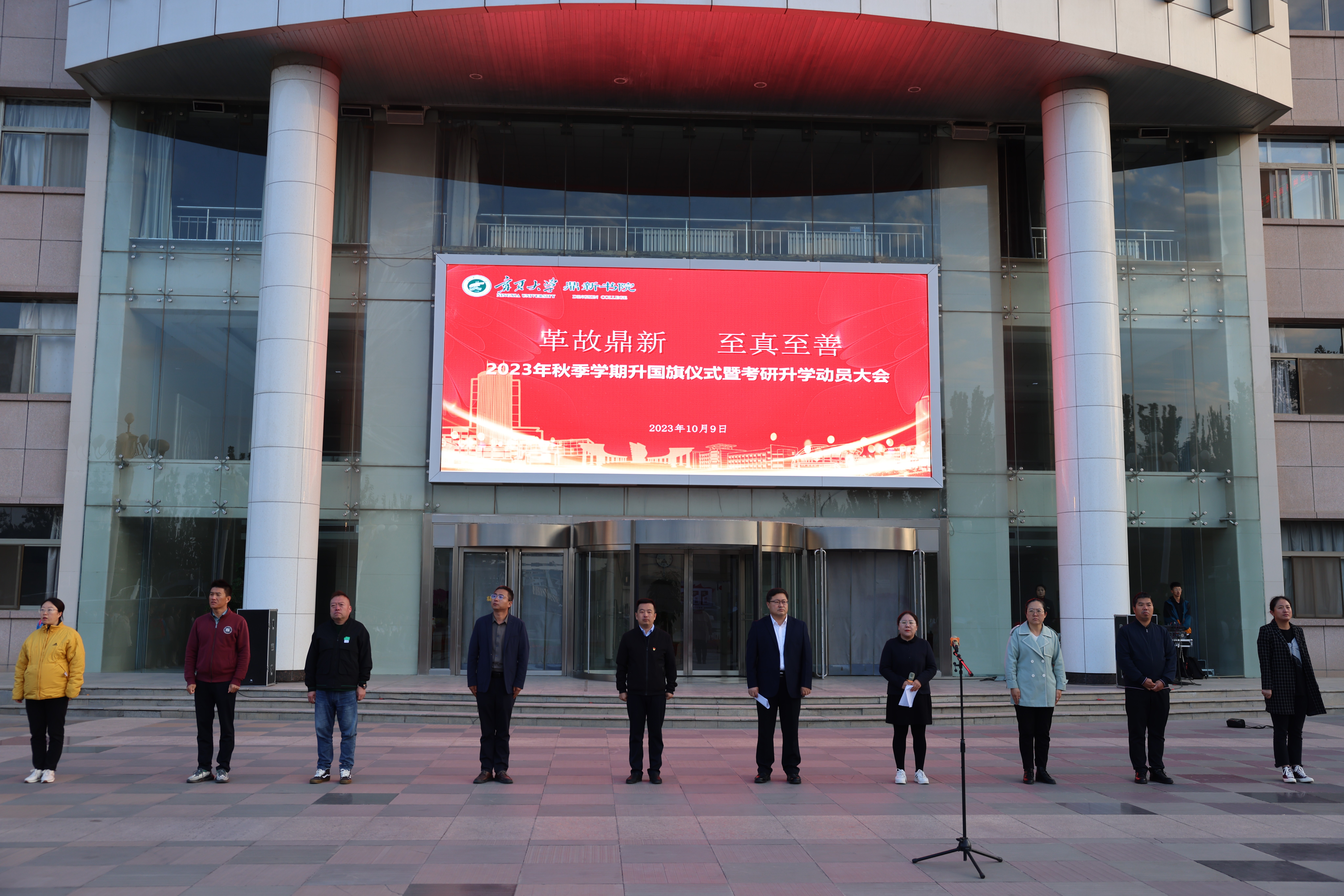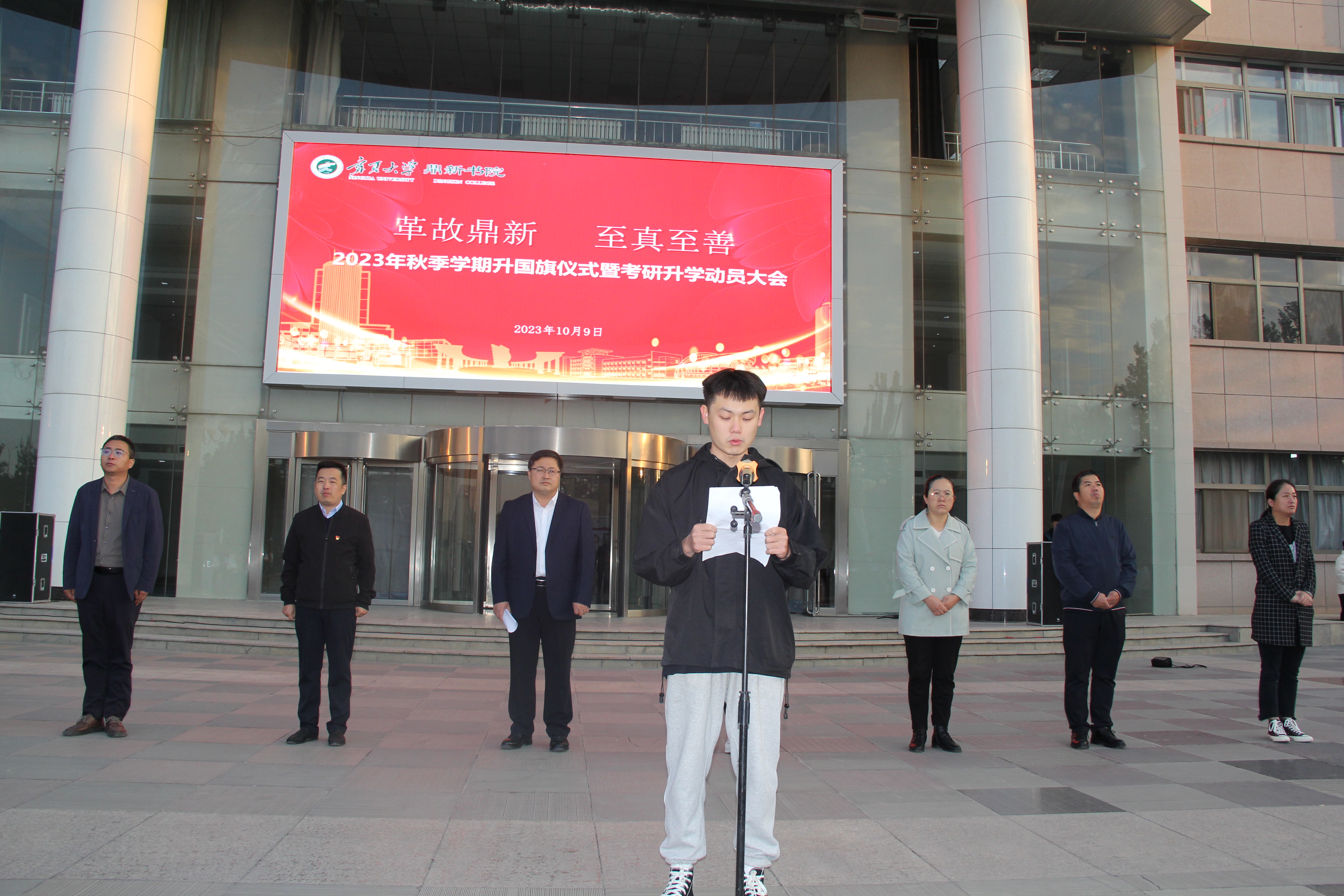 【beat365唯一官方网站新闻中心讯 鼎新书院】10月9日清晨,鼎新书院在贺兰山校区德勤楼前举行2023年秋季学期升国旗仪式暨考研升学动员大会,书院班子成员、辅导员和全体在校本科生、研究生参加升旗仪式,书院党委副书记马丽蓉主持大会。