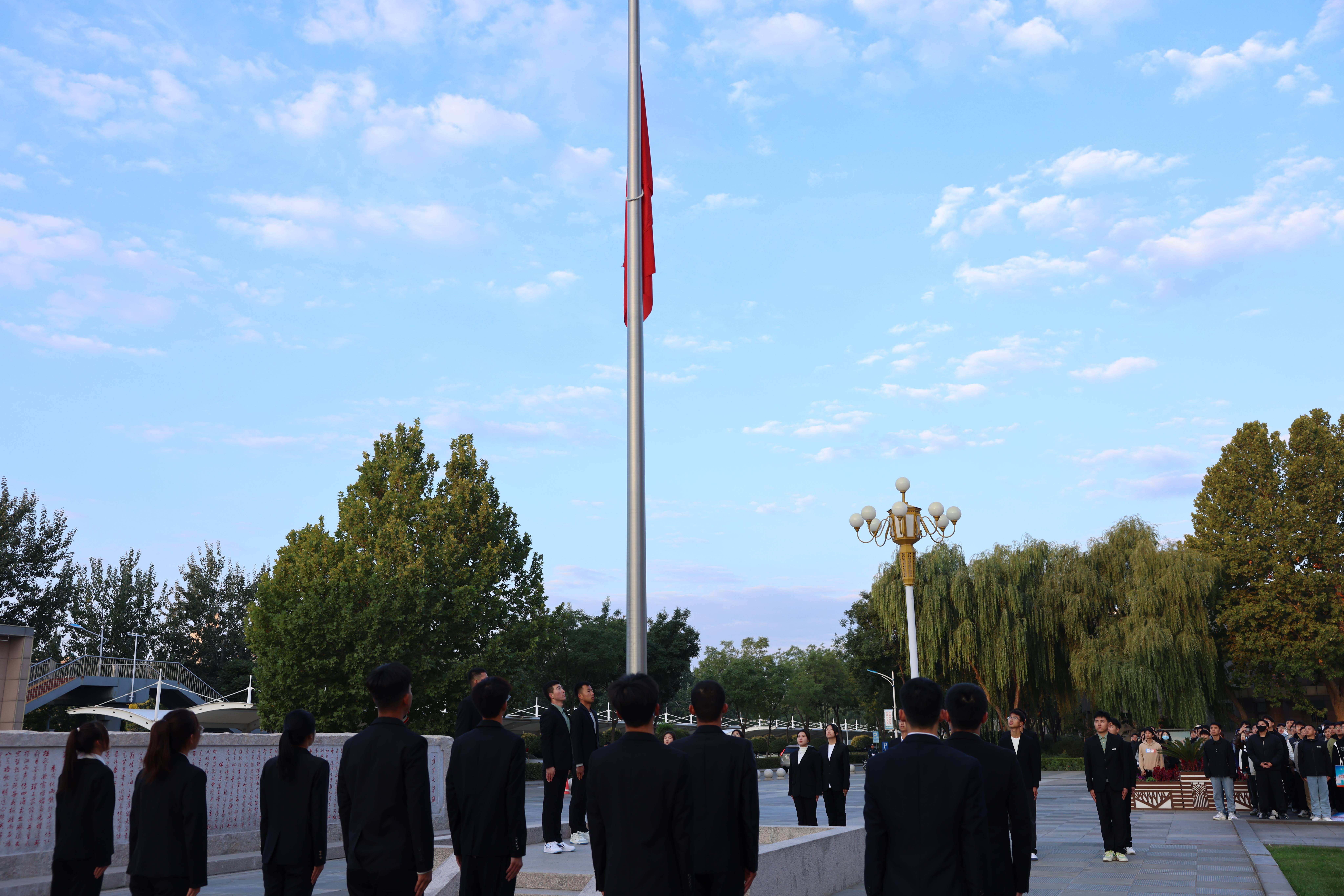 迎着朝阳,由来自机械工程学院、化学化工学院、材料与新能源学院不同年级、不同专业学生代表组成的国旗护卫队,迈着铿锵有力的步伐护送着五星红旗走向升旗台。全体师生面向国旗行注目礼,随着雄壮的国歌声响起,五星红旗冉冉升起,在熠熠晨光中迎风飘扬。