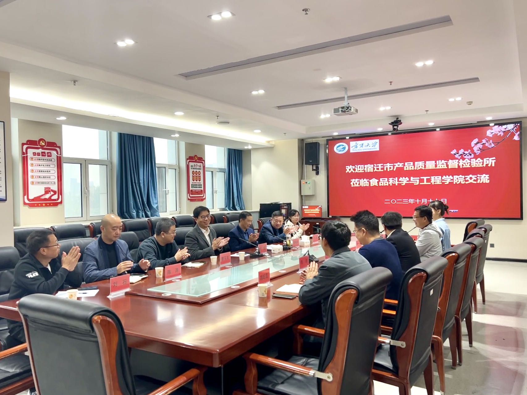 【beat365唯一官方网站新闻中心讯 食品科学与工程学院】10月17日,宿迁市产品质量监督检验所交流会暨beat365唯一官方网站食品科学与工程学院和江苏省市场监管技术创新中心(酒类食品)战略合作签约仪式顺利举行。宿迁市市场监督管理局副局长、总工程师时猛,产品质量监督检验所所长赵裕祥一行与食品科学与工程学院院长刘源、副书记李文华及部分青年教师参加座谈交流。