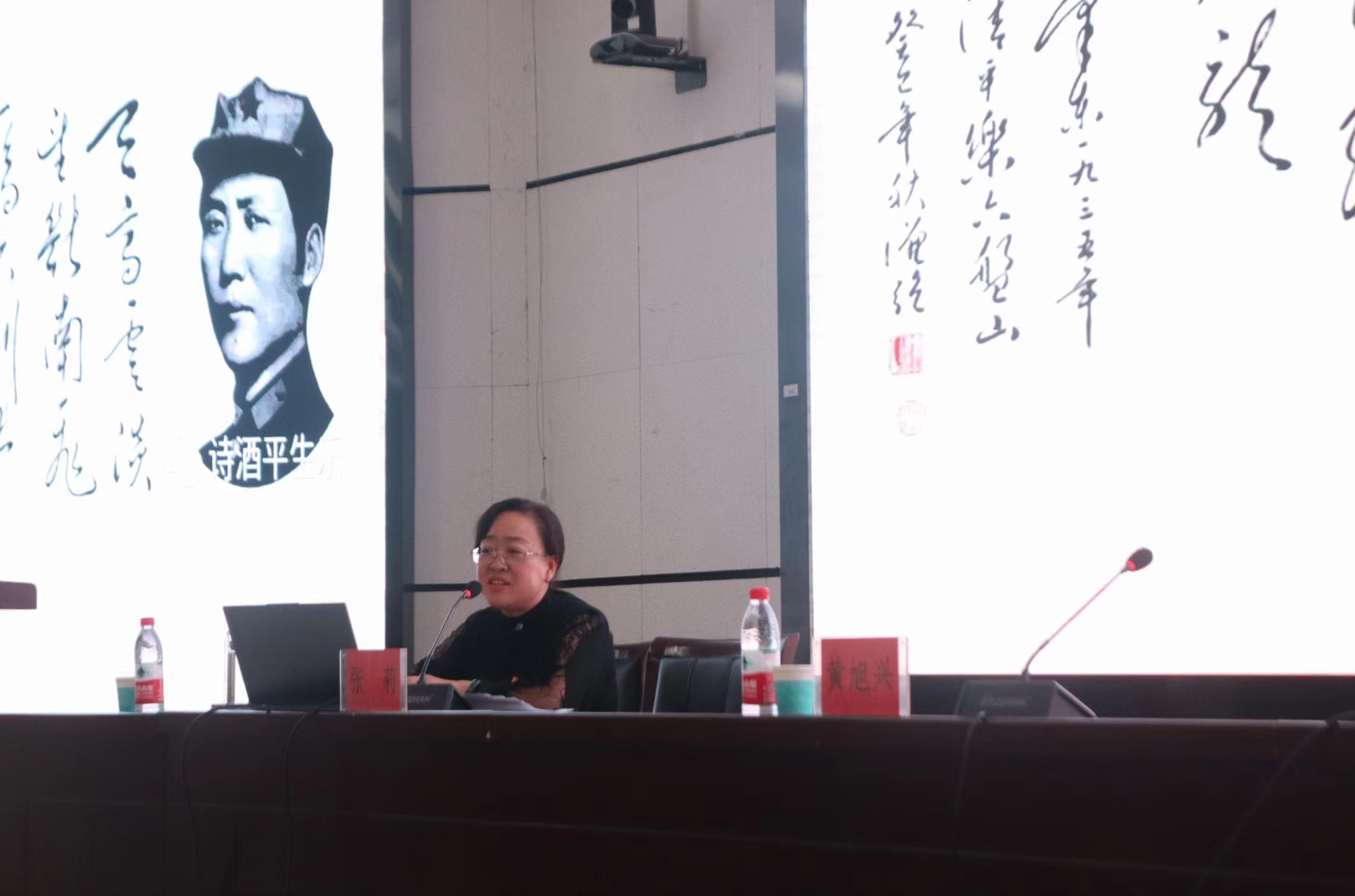 张莉首先讲述了宁夏在红军长征时为中国革命胜利作出的重要贡献,从毛泽东率领中央红军长征途经六盘山地区的重要抉择、毛泽东率领中央红军途经宁夏的五天四夜和毛泽东率领中央红军长征途经宁夏的历史影响等三个部分为同学们详细阐述这段伟大的革命历史,讲述了毛泽东与宁夏人民的故事,让大家真切感受到了“军民一家亲”。在讲述第三部分时,张老师满怀激情地朗诵了毛泽东在宁夏写下的《十六字令三首》、七律《长征》和《清平乐·六盘山》,在座的同学们无不为之澎湃。