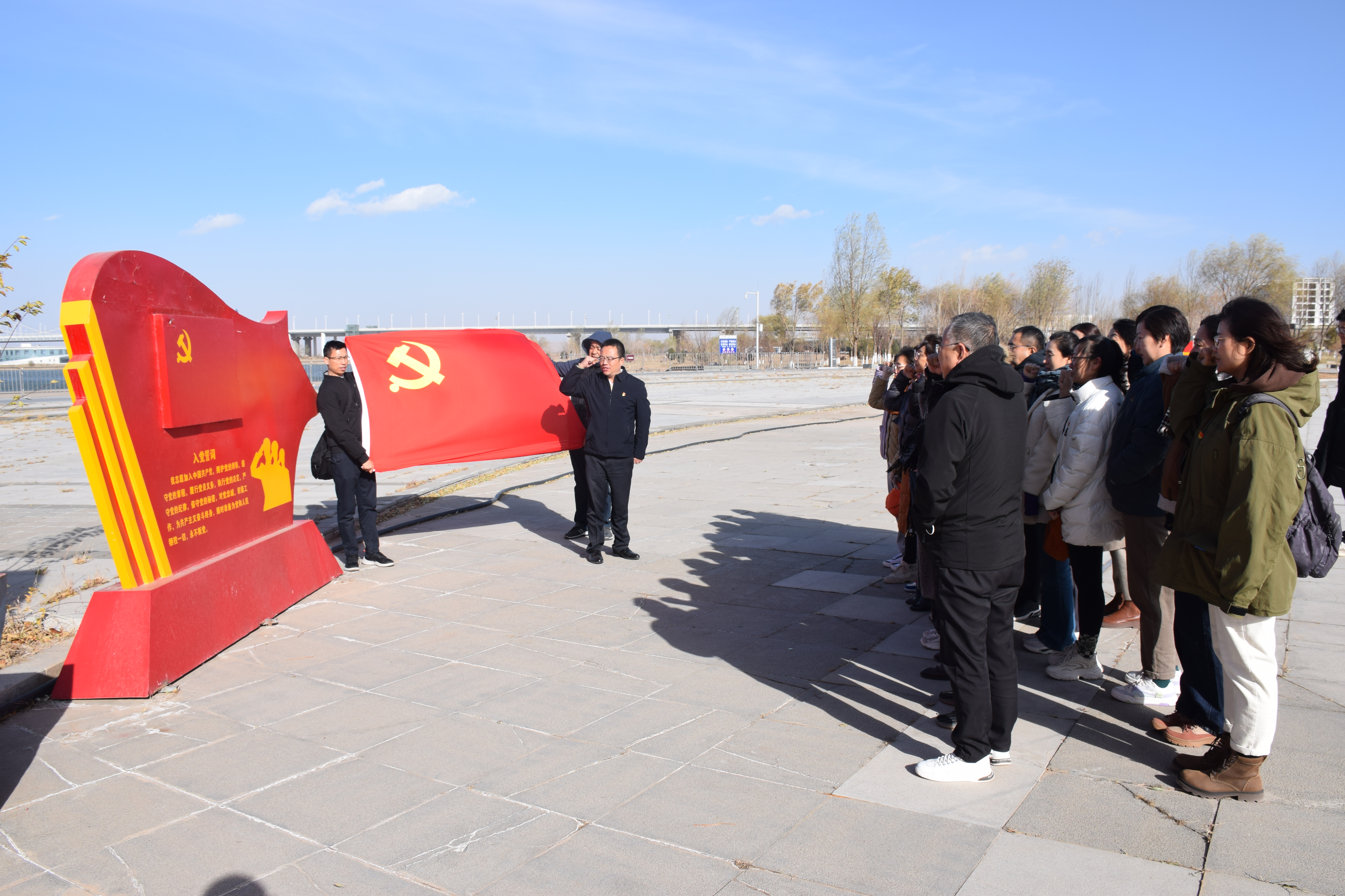 讲解员带领师生们通过浮雕展示了解了黄河军事文化的历史发展。紧接着,学院全体教师党员在郭利的带领下,高举右手,面向党旗,庄严宣誓。铮铮誓言,铿锵有力,振奋人心,重新审视入党时的初心,深切表达了身为新时代共产党员的责任与担当。