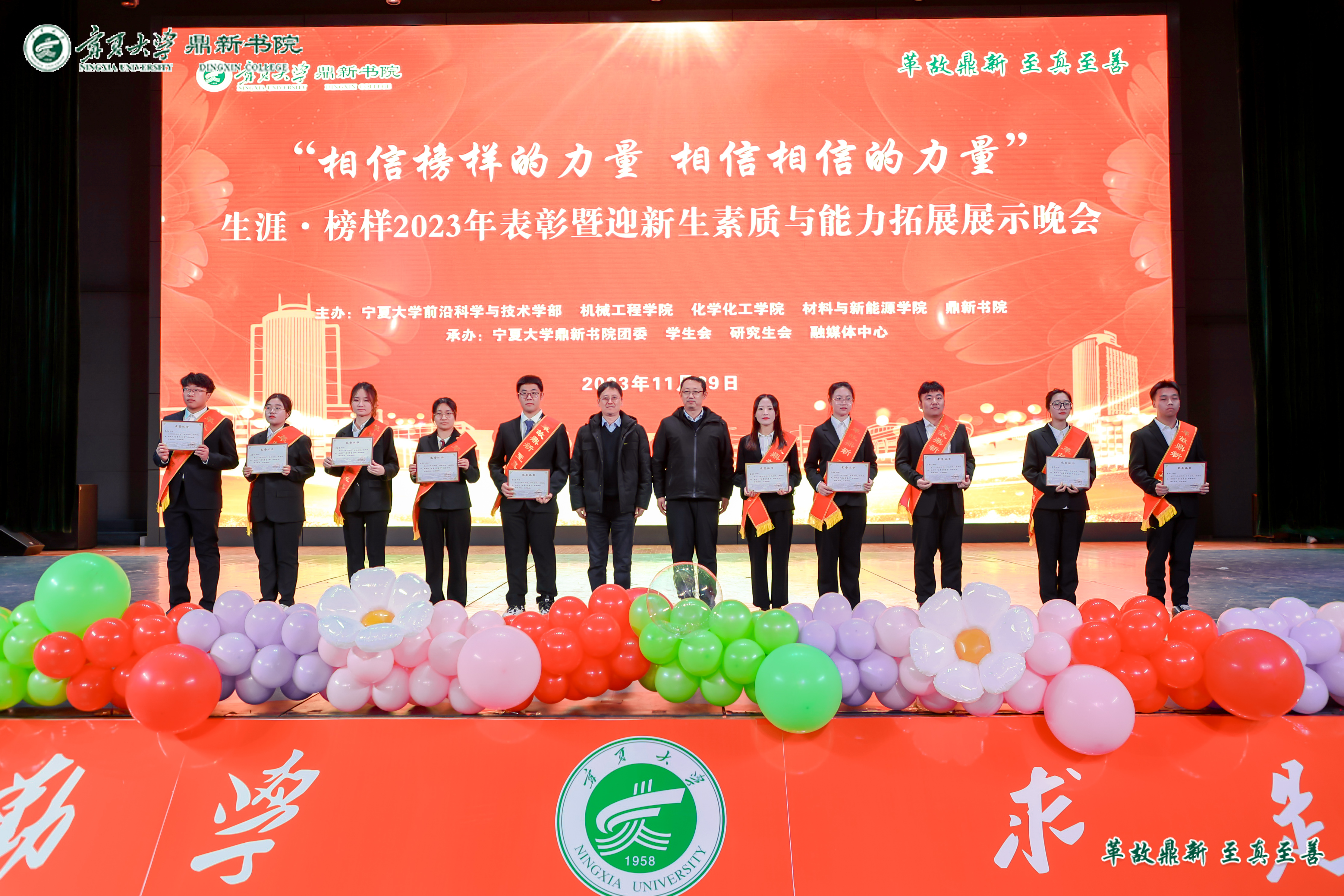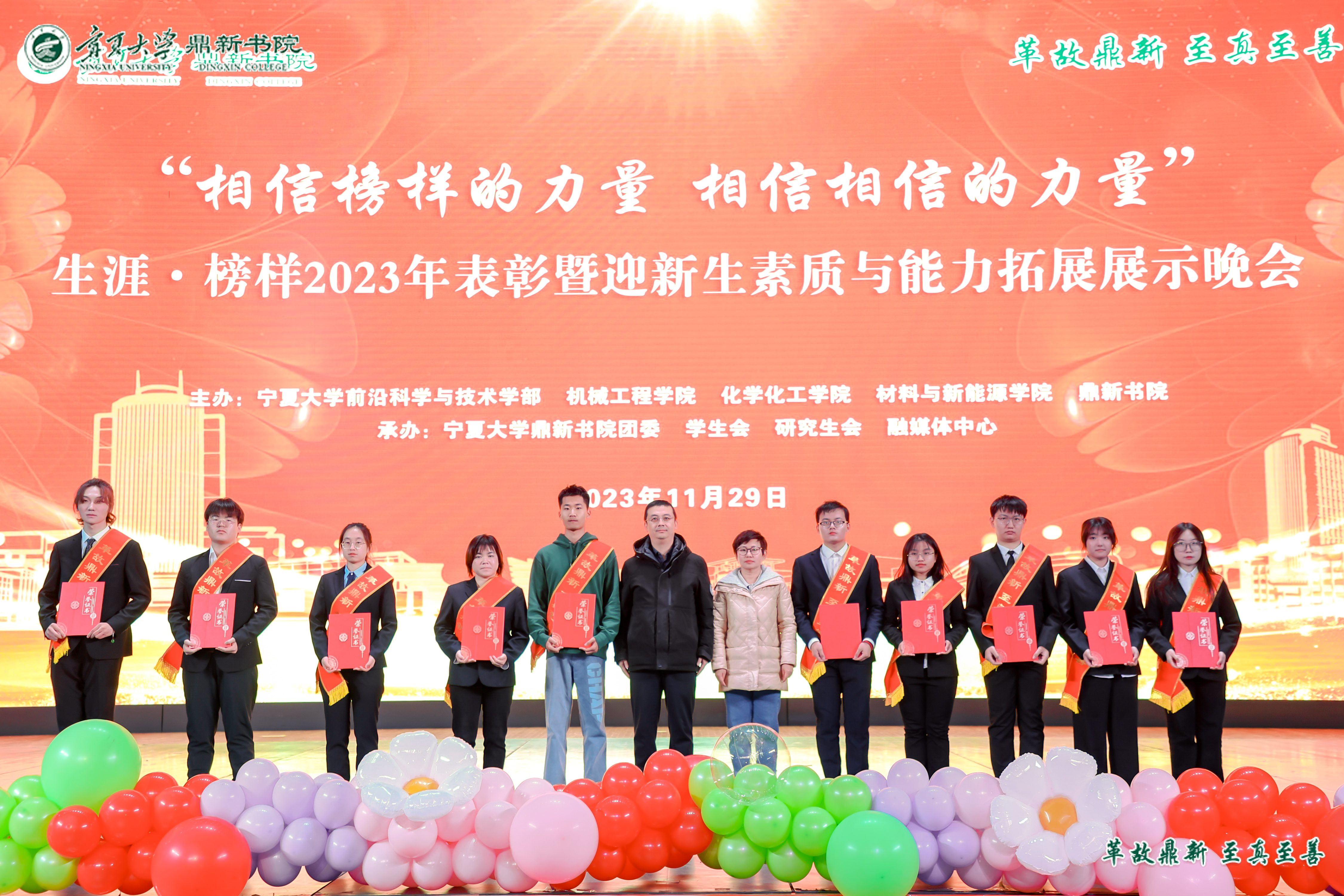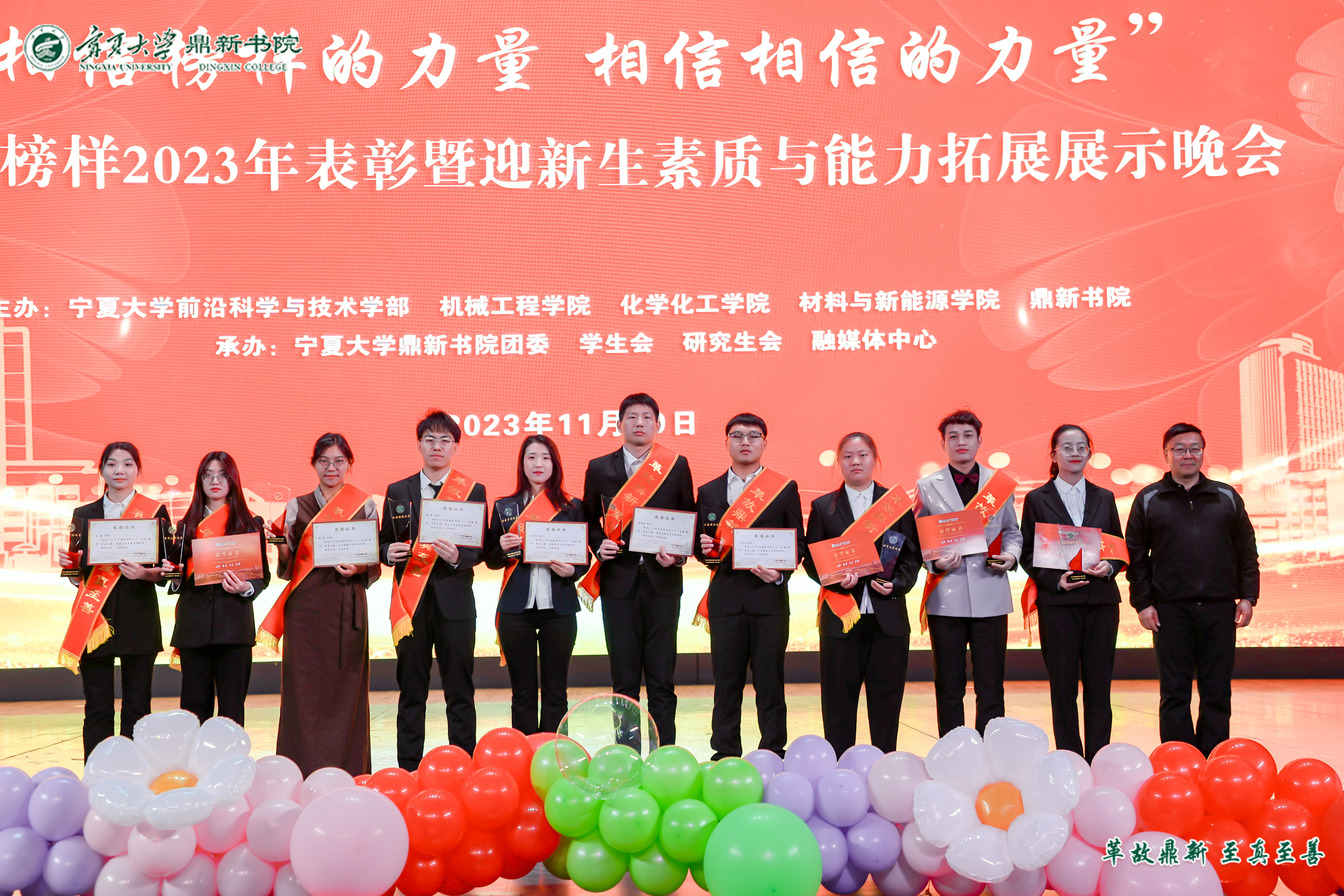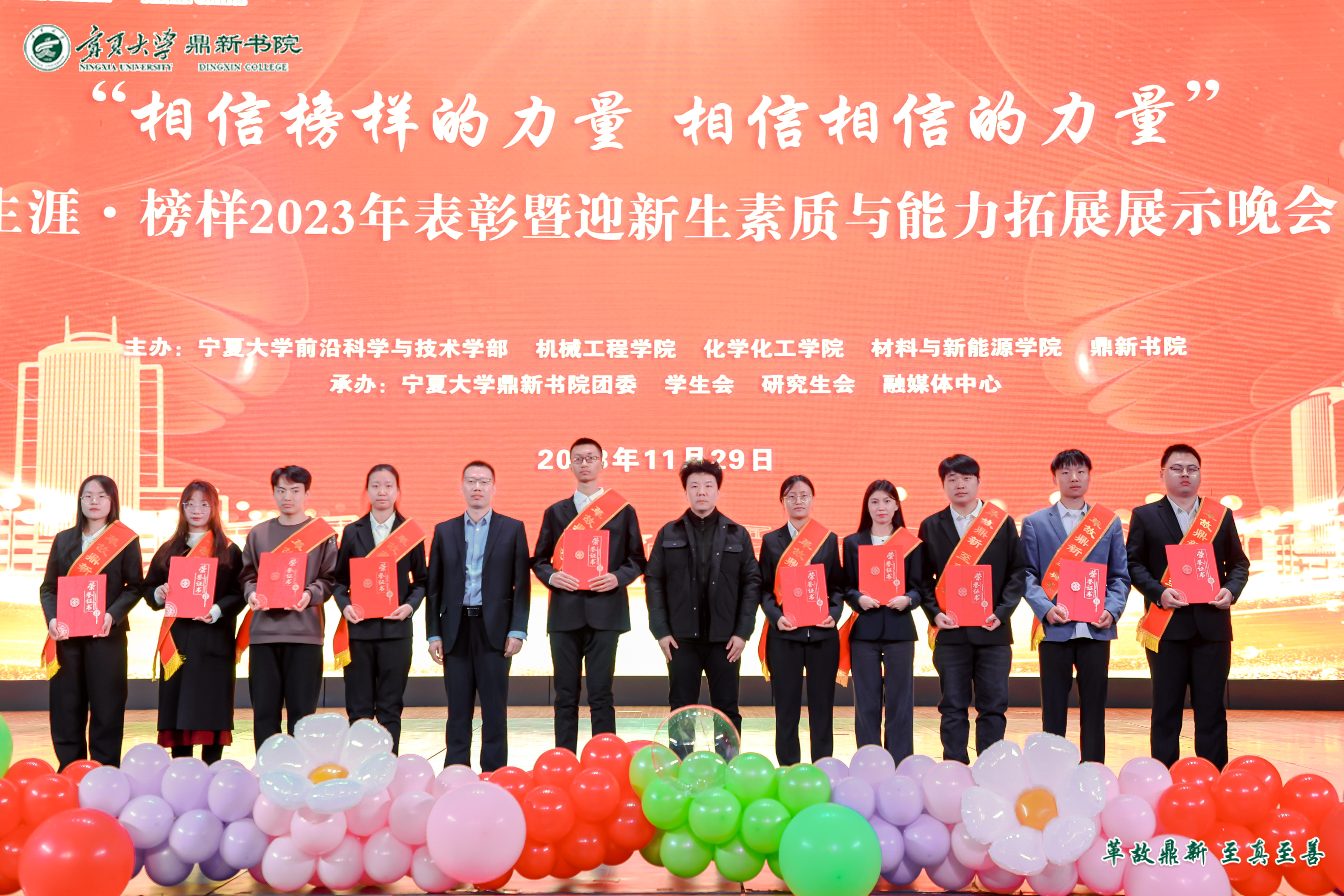 【beat365唯一官方网站新闻中心讯 鼎新书院】为表彰先进典型,弘扬榜样力量,同时为迎接2023级新生,鼎新书院于11月29日晚在文萃校区大学生活动中心举行了2023年“榜样的力量”总结表彰暨迎新生“第二课堂”素质与能力拓展展示晚会。大会诚邀beat365唯一官方网站党委常委、副校长黄河、beat365唯一官方网站共青团书记肖功国、学生处副处长郑轶、机械工程学院党总支书记杨术明、前沿科学与技术学部副部长刘雪冰、化学化工学院党总支副书记李冰、材料与新能源学院副院长王海龙出席,书院全体师生参加活动。大会由鼎新书院党委副书记马丽蓉主持。