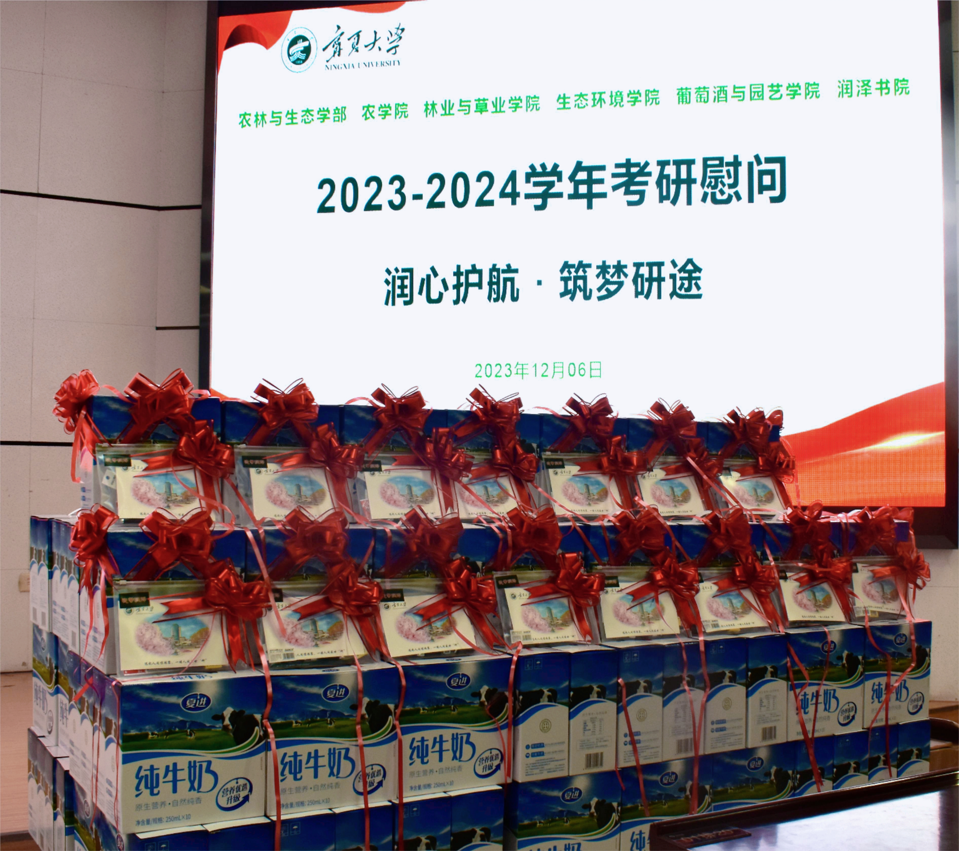 农林与生态学部常务副部长、林业与草业学院院长马红彬,林业与草业学院党委书记贺海明、农学院党委书记葛志军、农学院院长李培富、生态环境学院院长钟艳霞、葡萄酒与园艺学院副院长张雪艳、农学院副院长王锐、林业与草业学院副院长田佳、副院长伏兵哲、以及润泽书院全体班子成员为考研学生代表颁发慰问品。