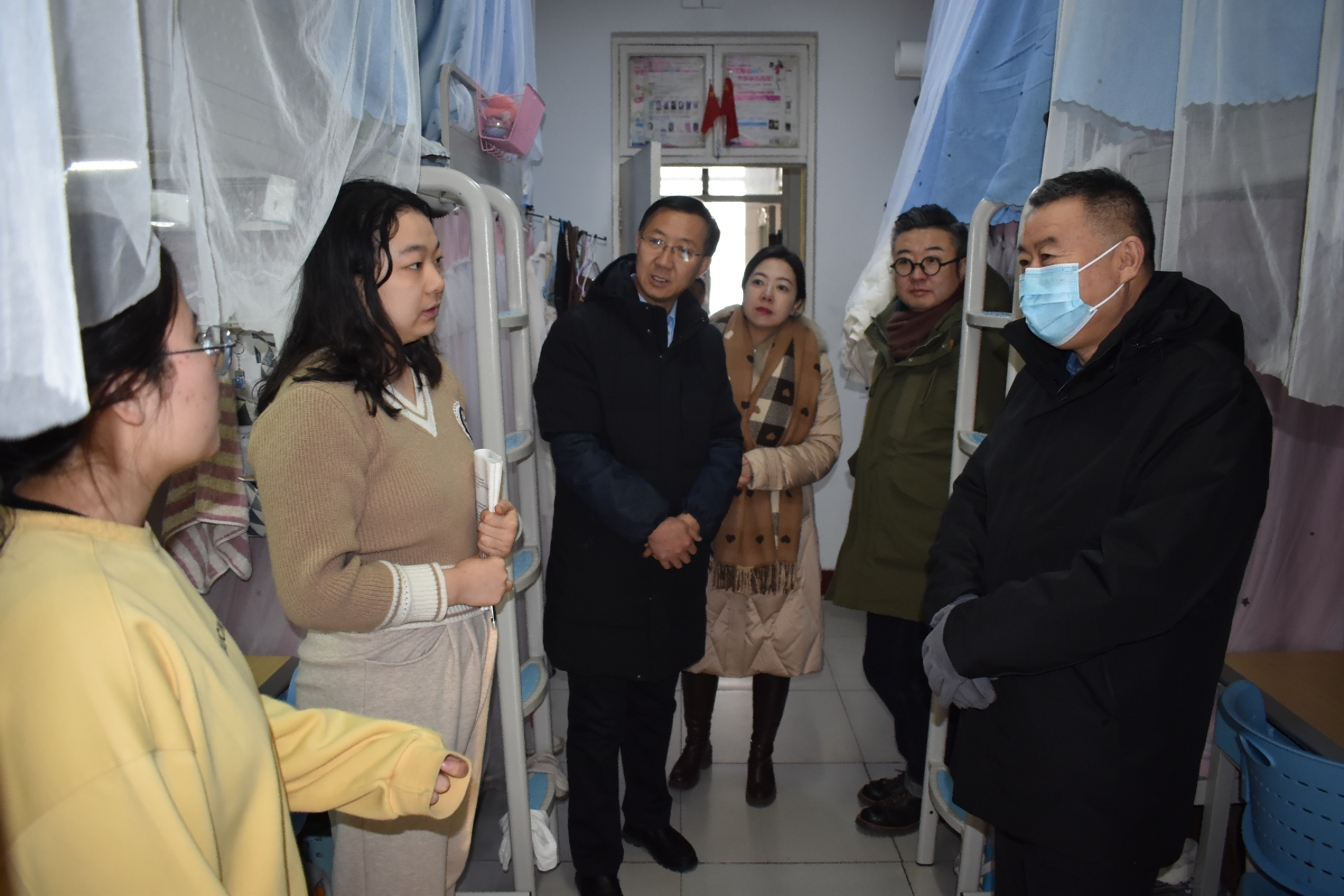 在文萃校区9号公寓205宿舍,李建设与三位考研同学深入交流,了解她们的学习生活情况。得知她们对即将到来的考试很有信心,李建设非常高兴,鼓励她们保持高昂的斗志和积极的心态,也要注意放松心情,争取以最佳的状态跑完考研战场最后一公里。