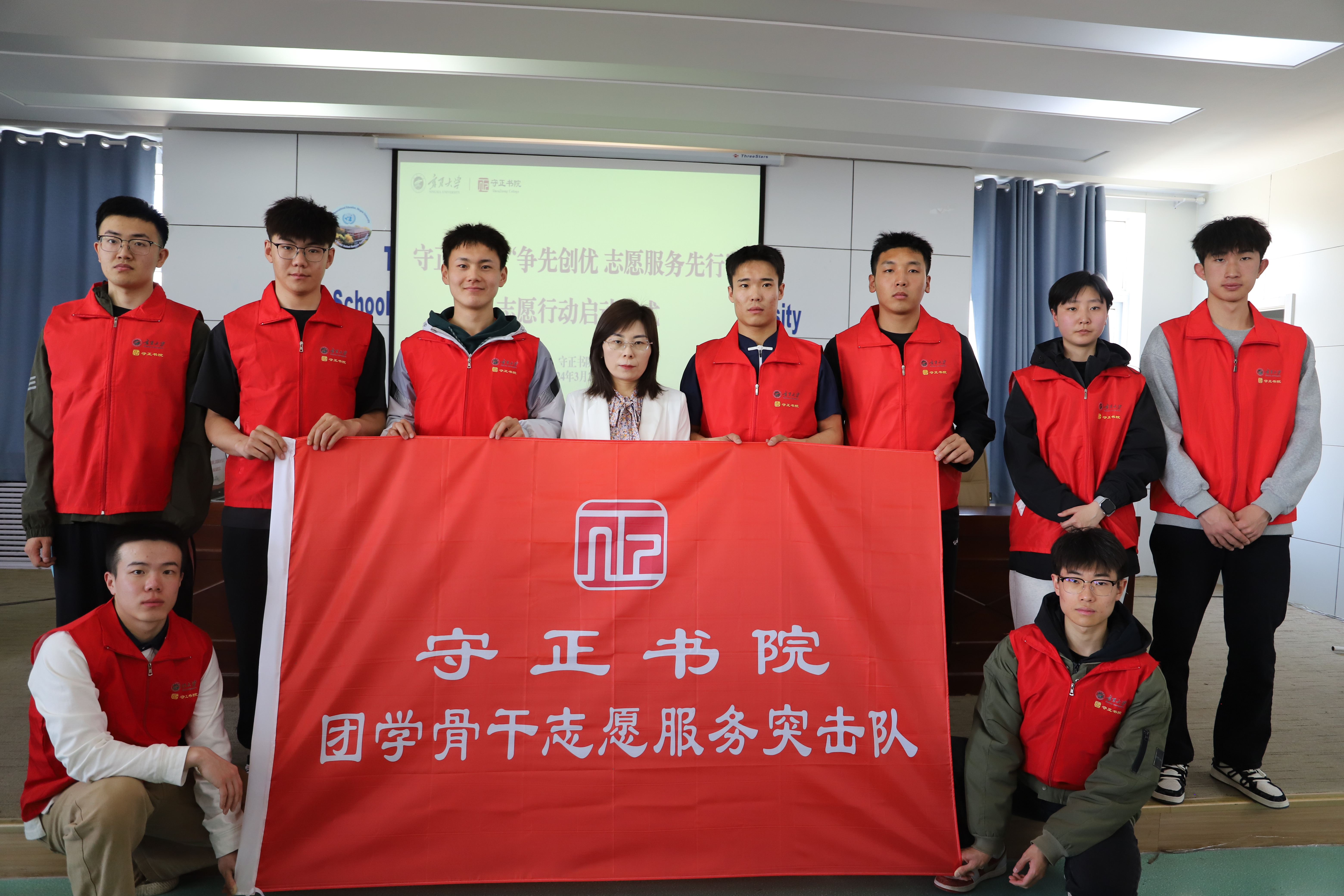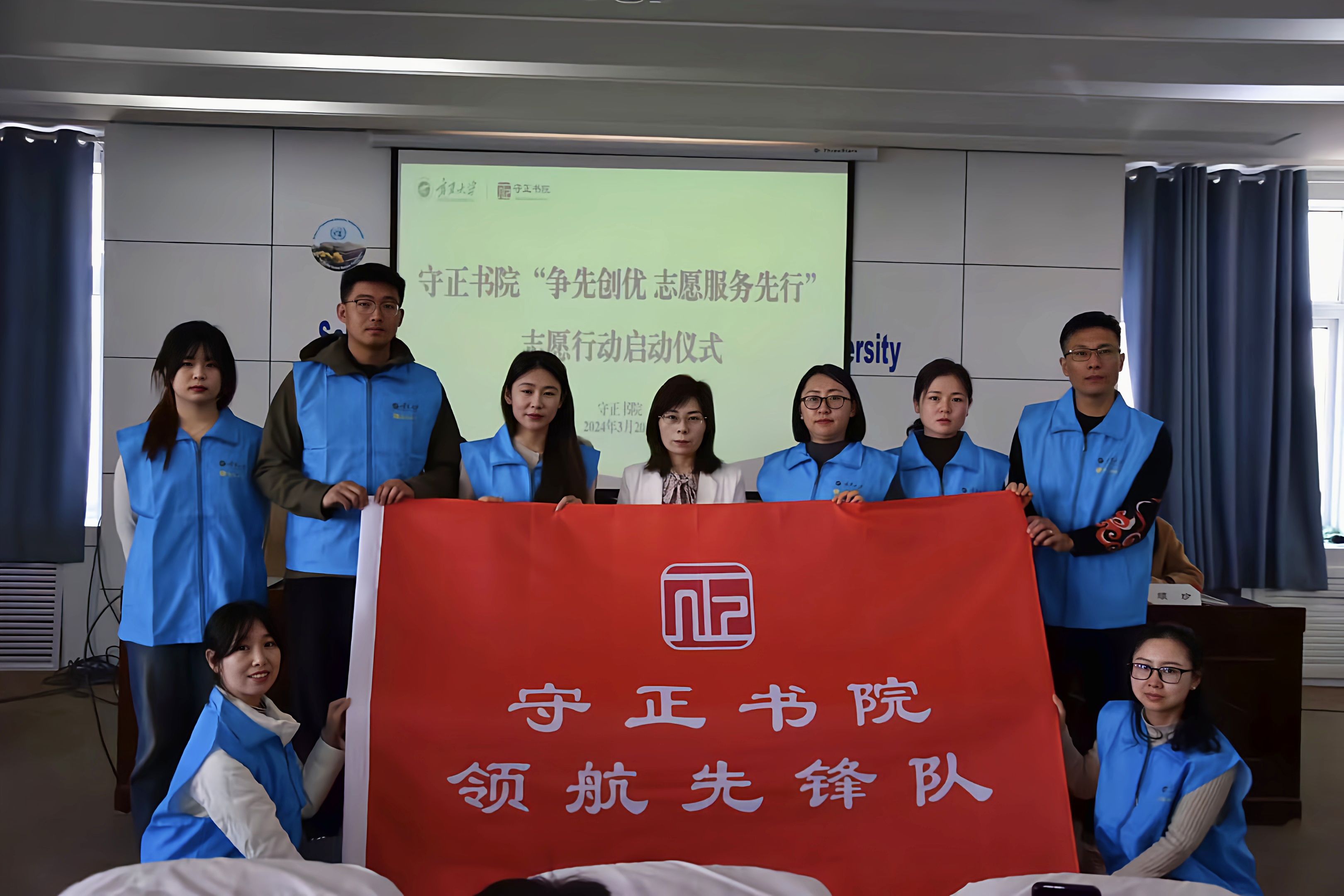 书院党委书记、院长闫蓉为各志愿服务队授旗。领航志愿者服务小分队代表王玮、领雁志愿者服务小分队代表谭美玲、团学骨干志愿服务突击队代表杨昕分别宣读了倡议书。