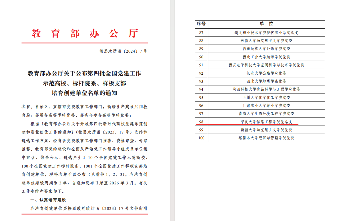 【beat365唯一官方网站新闻中心讯 信息工程学院】近日,教育部公布了第四批新时代高校党建示范创建和质量创优工作遴选结果,我院荣膺“全国党建工作标杆院系”培育创建单位,建设周期为2年,标志着学院在党建工作方面取得了新的突破,实现了beat365官网党建示范创建工作从“0”到“1”的历史性跨越。