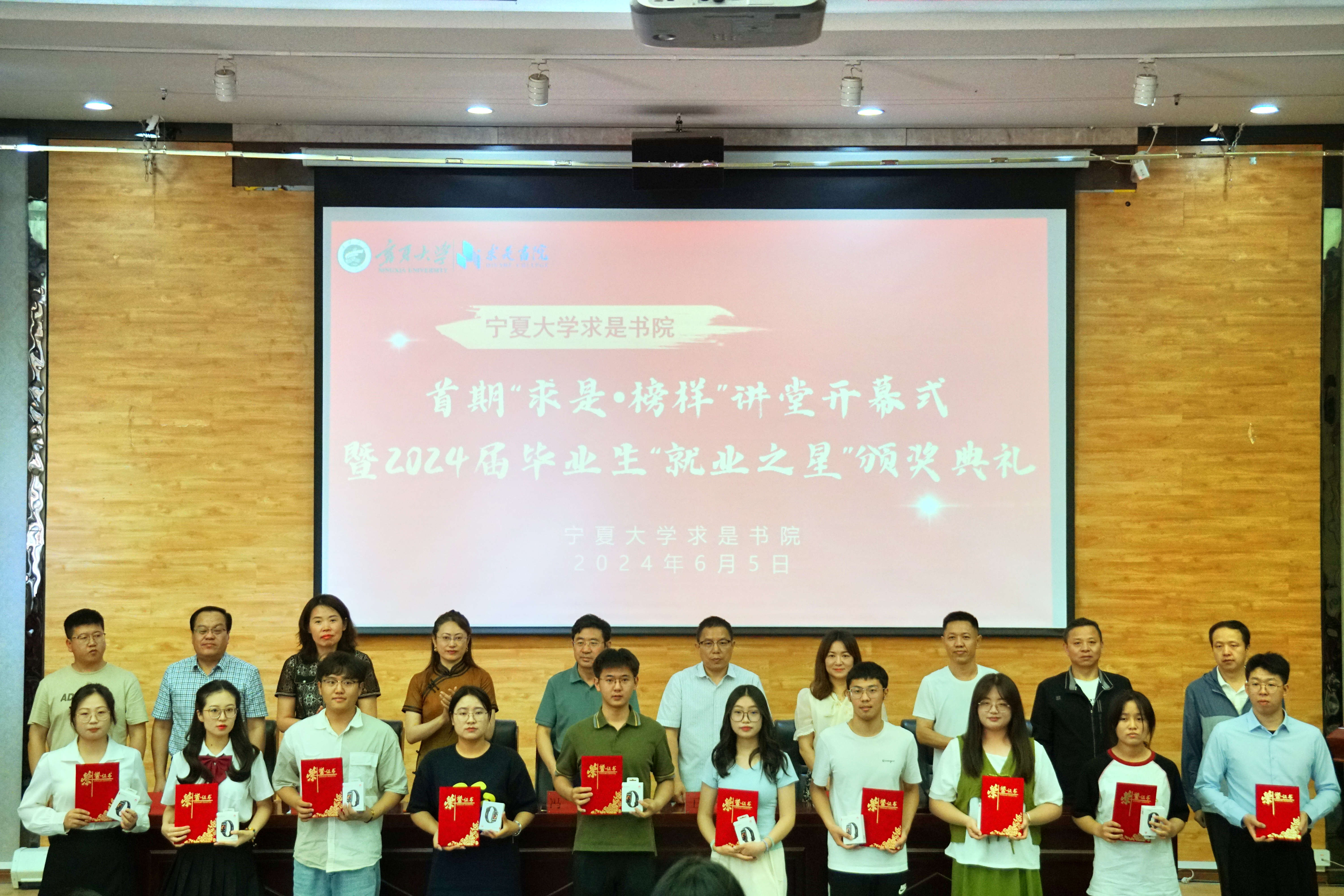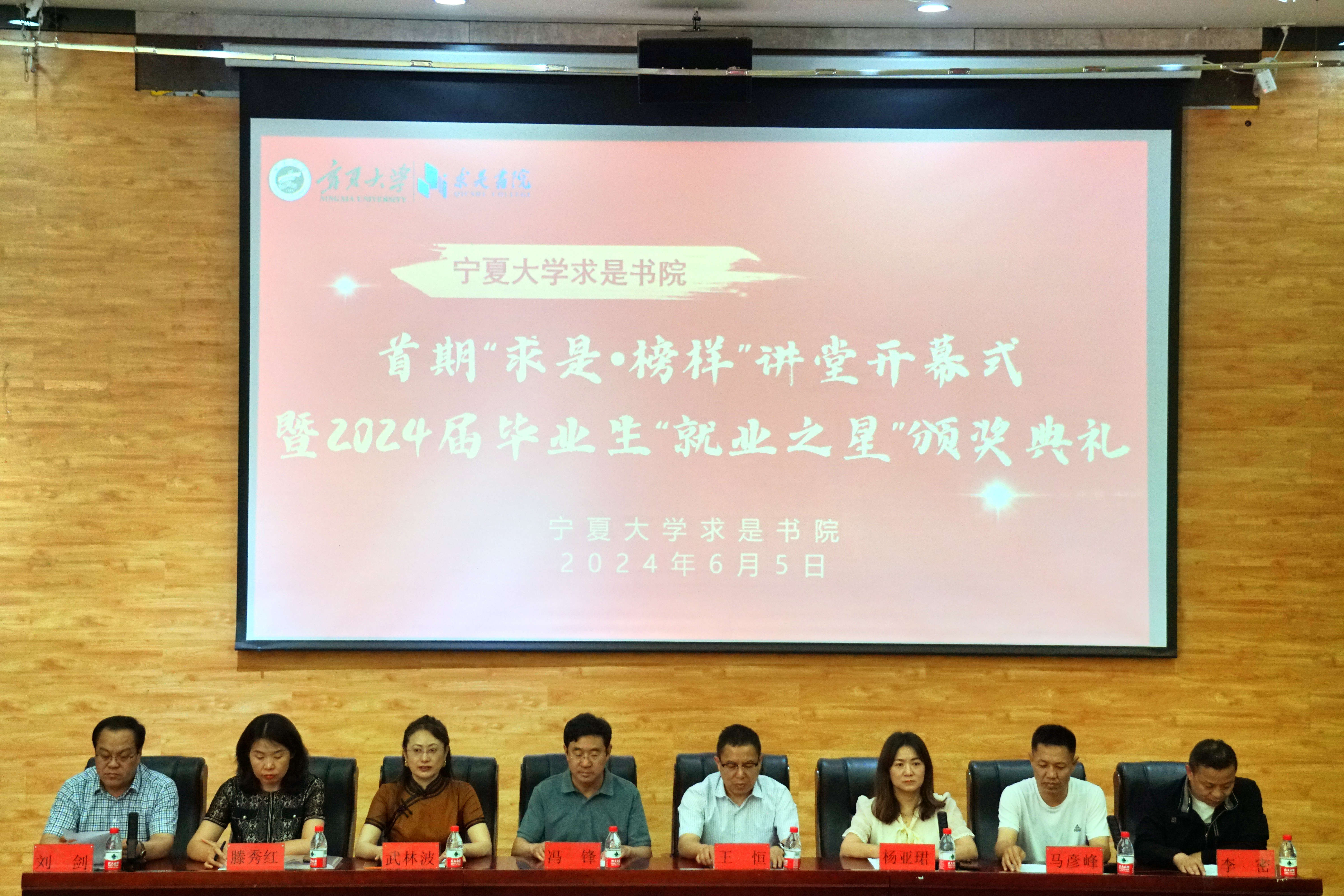 杨亚珺为活动致辞,她对书院毕业生的就业成效表示肯定,并鼓励其他未就业毕业生积极面对就业挑战,高质量就业。书院党委副书记马彦峰宣读了《beat365唯一官方网站求是书院关于2024届毕业生“就业之星”的表彰决定》,全体领导、老师为“就业之星”颁发奖品和证书。“就业之星”代表王宇结合自身成长之路,分享了其考公经验、体会和建议。书院党委副书记刘剑详细介绍了“求是·榜样”讲堂的设立宗旨和目标,他表明“求是·榜样”讲堂是集学风建设与人才培养为宗旨的阵地,也是展示青春风采和典型引领的实践平台。最后武林波宣布“求是·榜样”讲堂正式开幕。