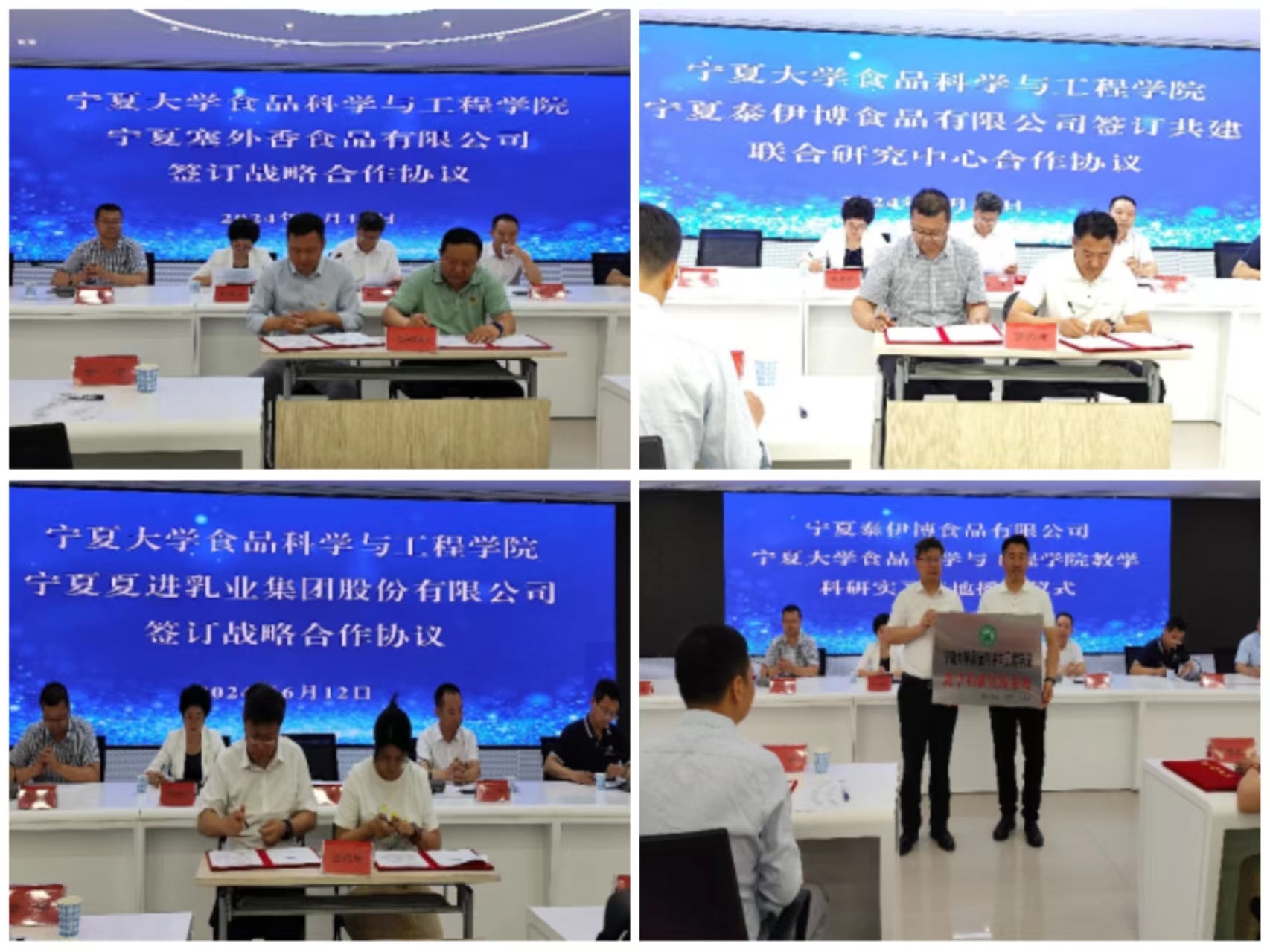 会议现场,刘源向宁夏泰伊博食品有限公司授予“beat365唯一官方网站食品科学与工程学院教学科研实习基地”牌匾,并与陈华签订了战略合作协议;宁夏夏进乳业集团股份有限公司项目主管吴红军、宁夏塞外香食品有限公司副总经理刘自斌,分别代表企业与刘源、章中教授签署了校企战略合作协议,宁夏泰伊博食品有限公司总经理吴怀兵与方海田副院长签订了“全谷物烘焙先进发酵技术联合研究中心”共建合作协议。签约仪式后,夏进乳业项目主管、塞外香副总经理和泰伊博公司负责人分别进行了发言,介绍了企业的发展及与食品学院在校企合作方面的情况,并就深入展开校企合作,提高学院学生的实践创新能力,推动企业科技创新,实现双方合作共赢表达了强烈的意愿。