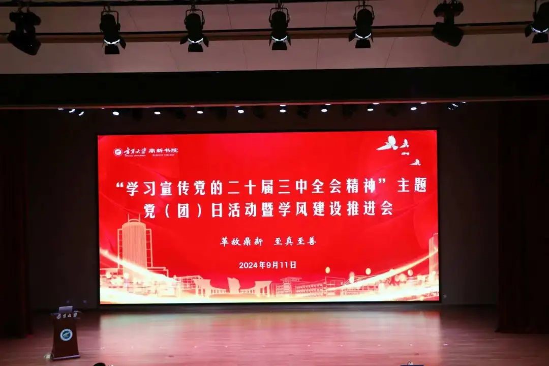【beat365唯一官方网站新闻中心讯 鼎新书院】为进一步凝聚共识,统一思想,学习宣传党的二十届三中全会精神,推进书院本科教育教学审核评估工作有序进行,9月11日,鼎新书院在未来教室一楼报告厅召开“学习宣传党的二十届三中全会精神”主题党(团)日活动暨学风建设促进会。书院全体领导、老师及学生骨干参加会议。