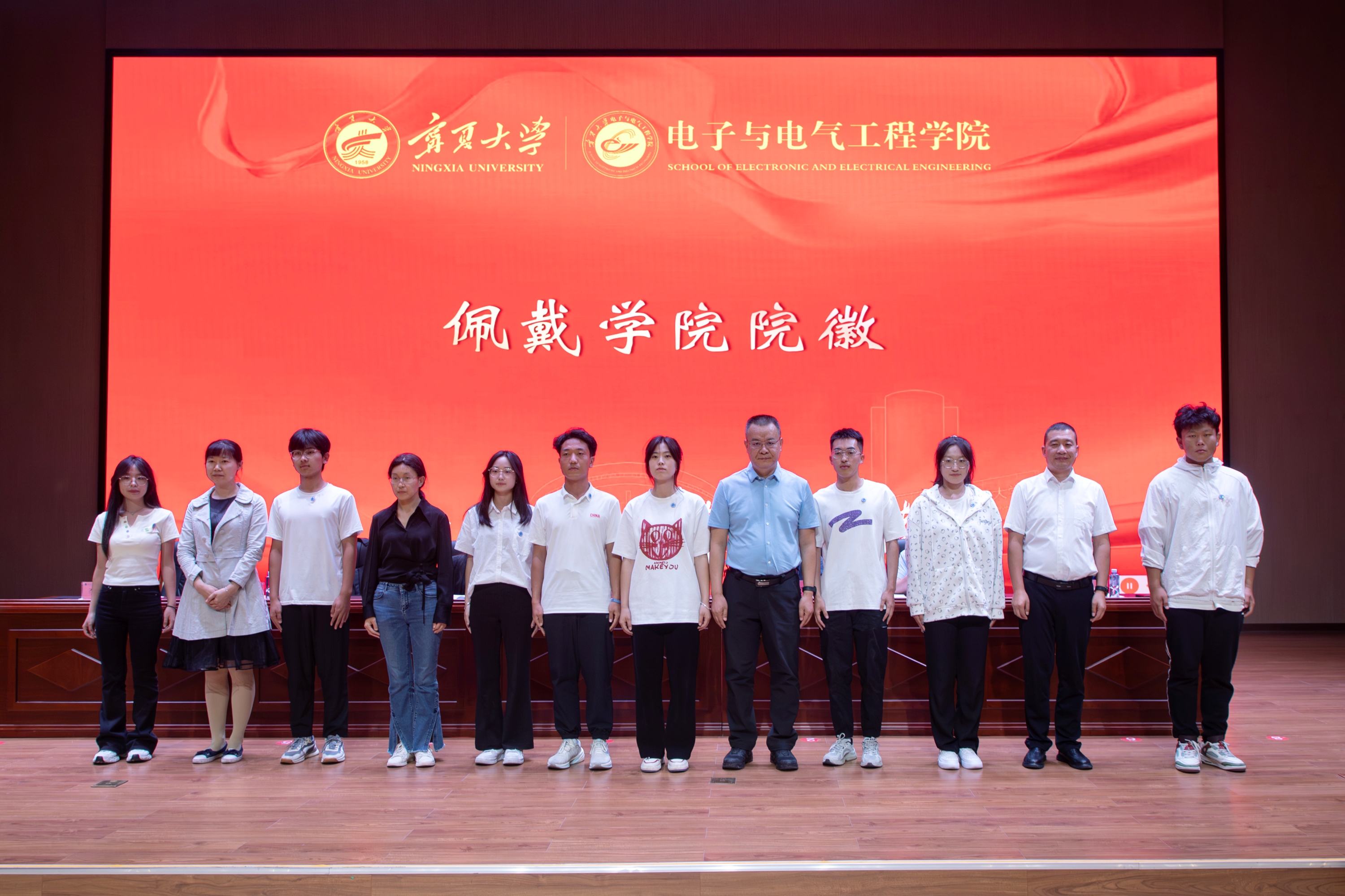 典礼现场,本科新生班主任为新生代表佩戴电子与电气工程学院院徽。台下,新同学现场集体佩戴院徽。从此刻起,来自全国各地的新同学正式成为“电院人”。未来的学习生活中,学院将与同学们携手同行、着笔谱写属于新时代青年学子的青春篇章。
