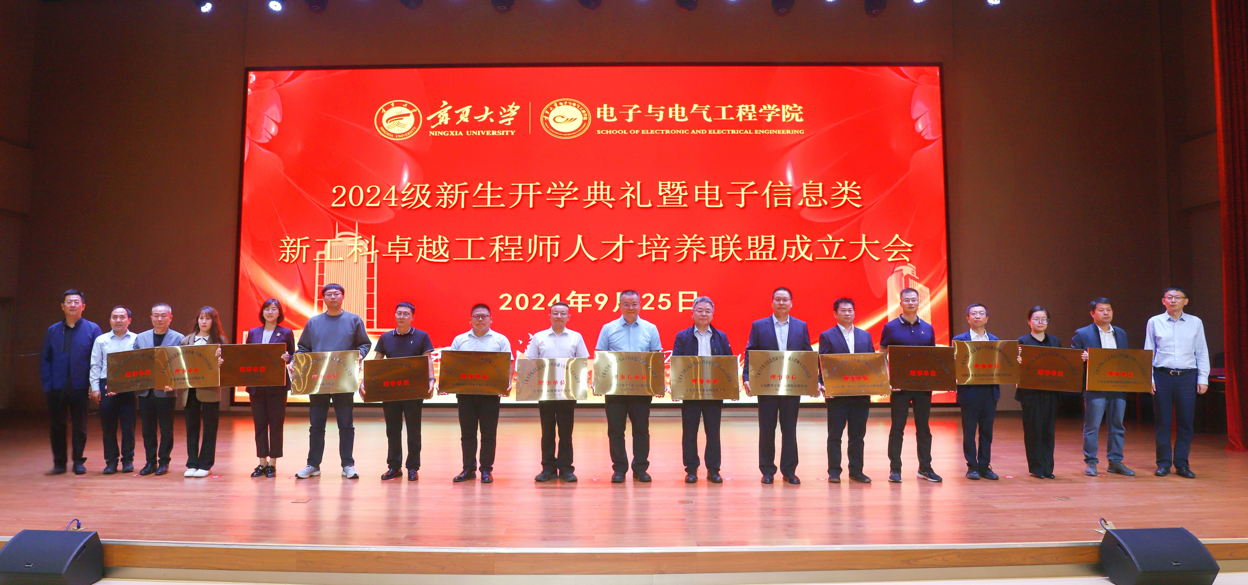 【beat365唯一官方网站新闻中心讯 电子与电气工程学院/文 程博/图】秋光为序,筑梦启航;新学肇始,万象更新。9月25日,电子与电气工程学院2024级新生开学典礼暨电子信息类新工科卓越工程师人才培养联盟成立大会于贺兰山校区笃行楼一楼报告厅举行,来自全国各地的262名新同学相聚在贺兰山下,与电路共舞,与代码对话,共同开启在beat365唯一官方网站电子与电气工程学院的求学之路。来自国内电子、通信和电力行业的公司领导和优秀校友共同开启并见证beat365唯一官方网站电子与电气工程学院电子信息类新工科卓越工程师人才培养联盟的正式成立。会议由学院党总支书记何彦平主持。