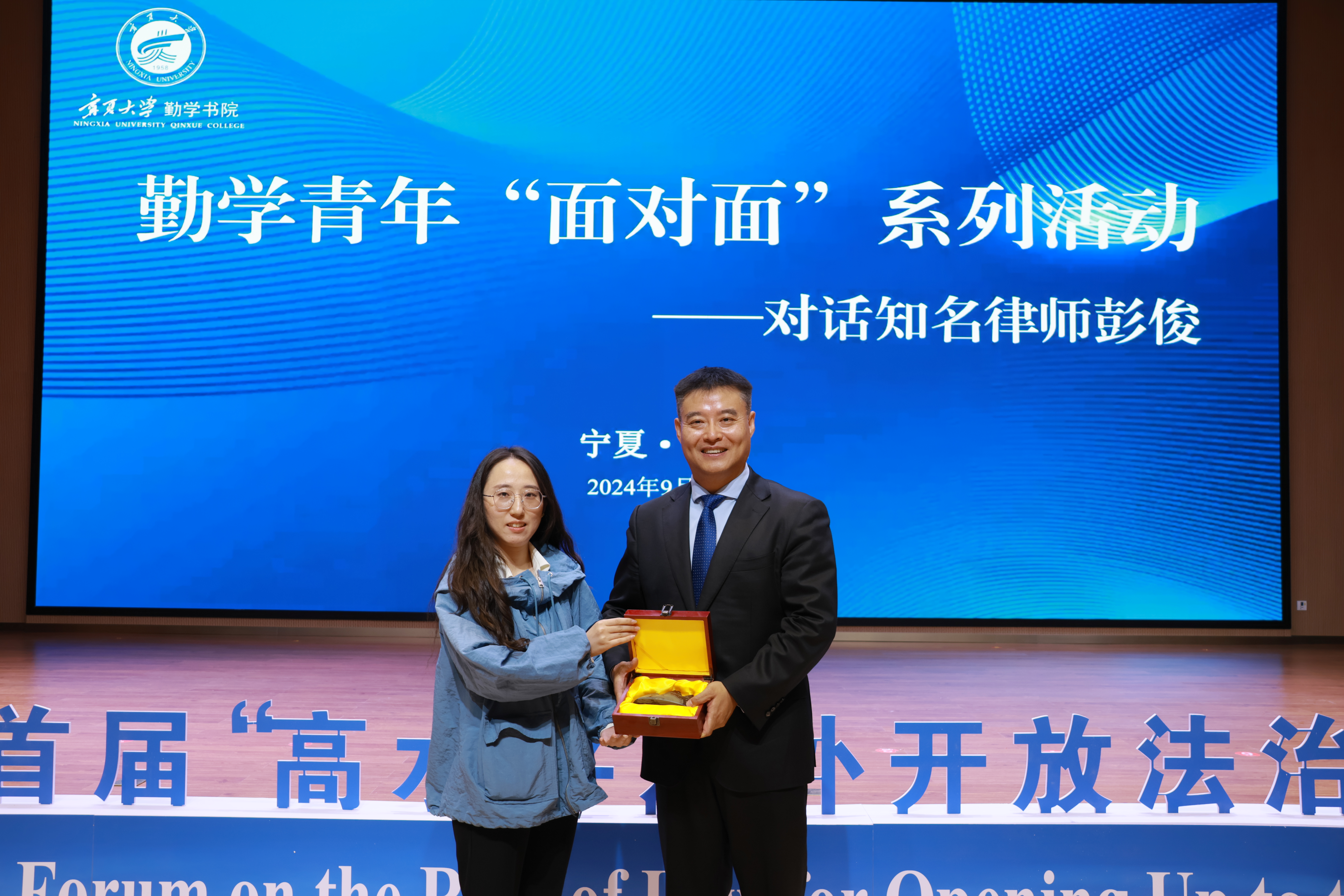 报告开始前,勤学书院副院长常江为彭俊律师颁发了特聘导师聘书,期待彭俊律师能在学业规划和职业规划等方面为书院的学生提供更多有力支持。
