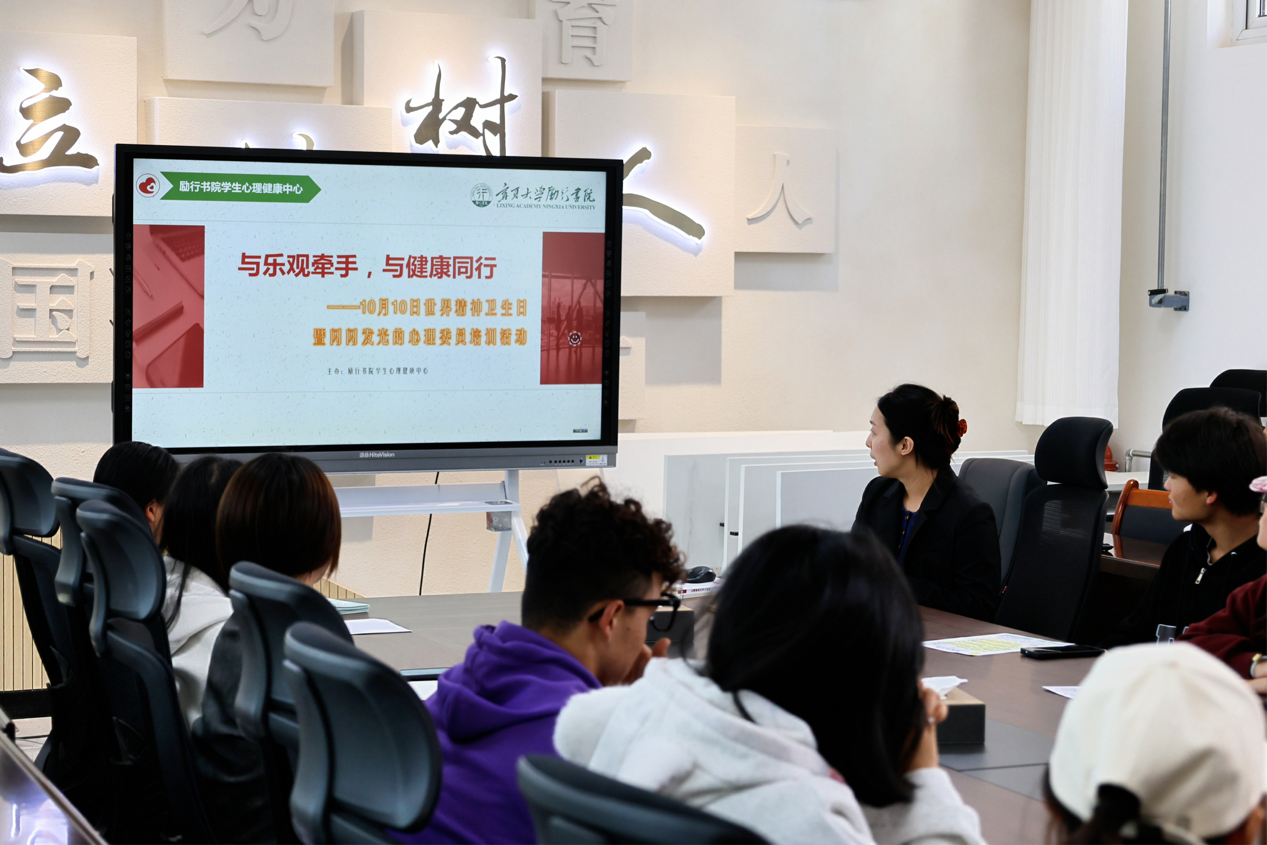 【beat365唯一官方网站新闻中心讯 励行书院】为宣传精神卫生日,普及心理健康知识。10月10日,励行书院开展“与乐观牵手,与健康同行”世界精神卫生日暨“闪闪发光的心理委员”培训会,本次培训会由励行书院学生心理健康中心梁冀宁老师主持,书院2024级全体心理委员参加。
