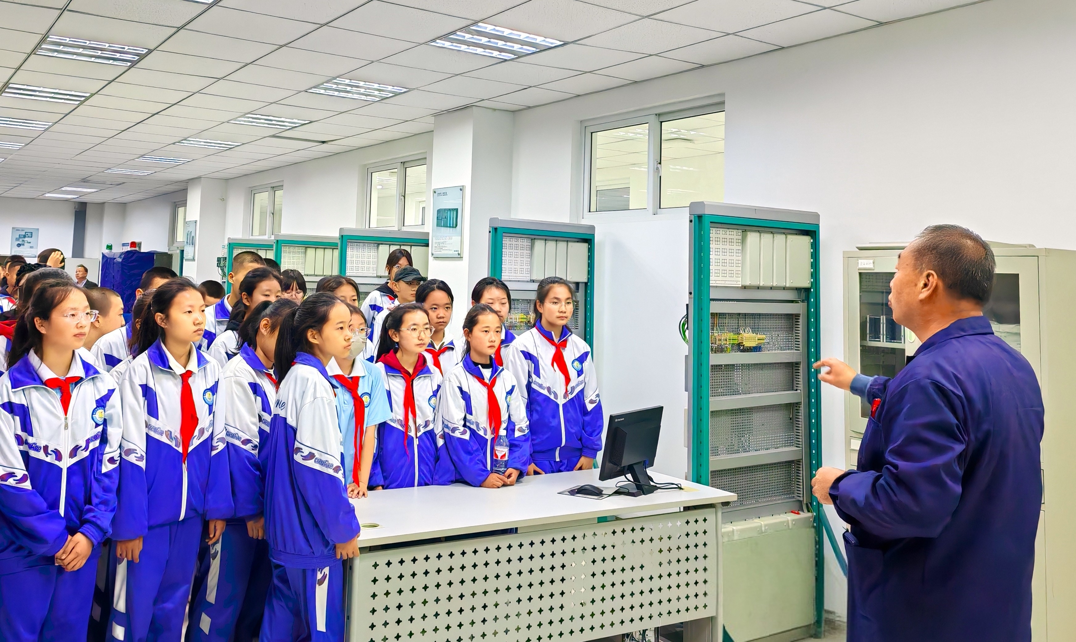 二十四中学北校区师生一行在我院电气工程及其自动化系主任杨国华、电工电子实验中心主任蔺金元和实验室老师周虎、赵国荣的带领引导下,先后参观实践了电气虚拟仿真实验室、现代电气检测综合实验平台、PLC西门子联合实验室、电工学实验室、电子实训与创新等专业实验室。实验室老师及研究生助教耐心细致地向同学们讲解了电工电子实验中心及电气工程专业实验室的基本概况、实验特点、操作方法和科学意义,讲解了电工电子创新实验的基本仪表和设备、电气参数检测仪器及检测方法,剖析了可编程控制器实验要点,展示了现代变电所运维情景仿真。