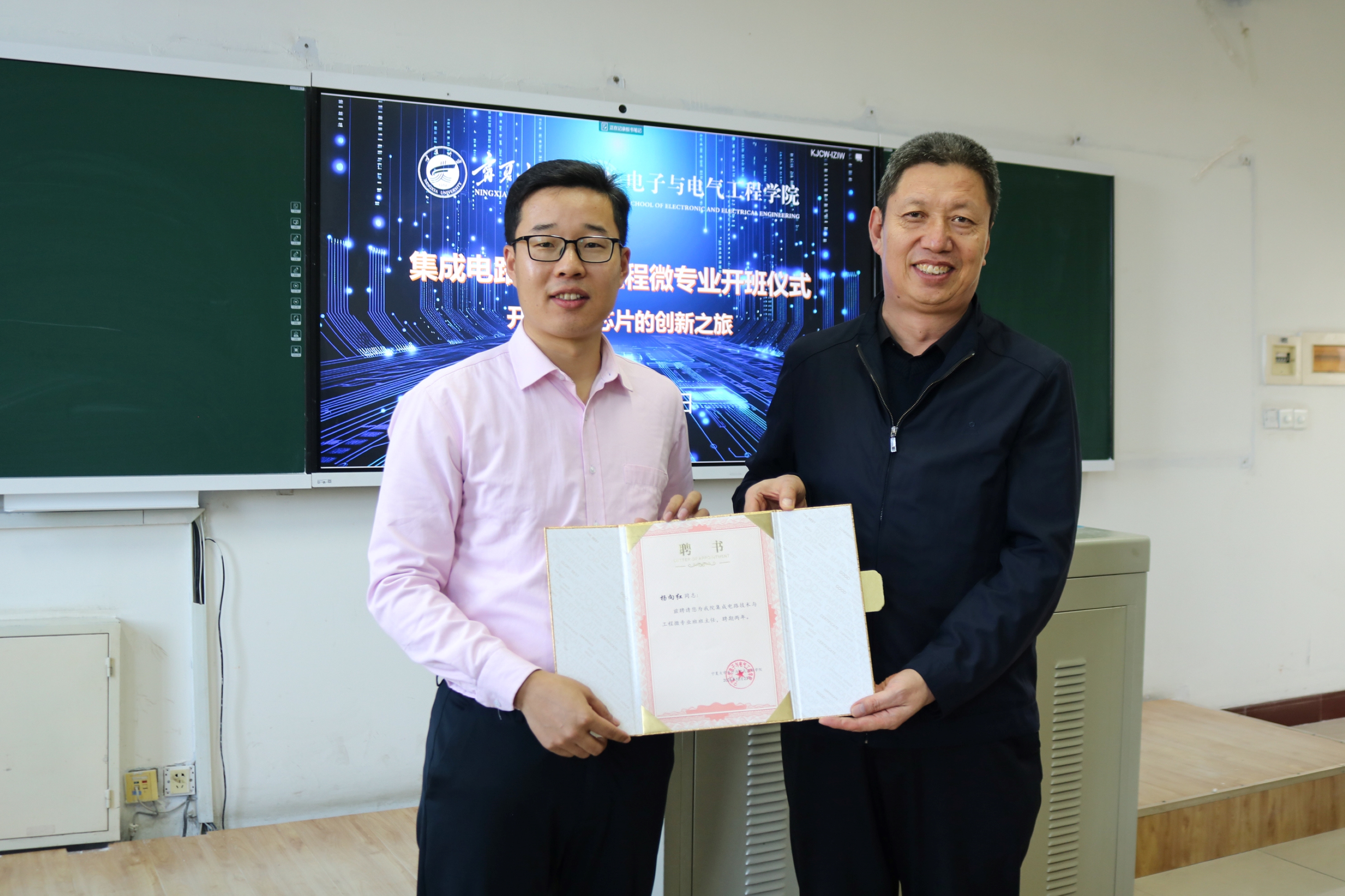 开班仪式上,何彦平向首届集成电路技术与工程微专业班主任杨向红颁发班主任聘书。