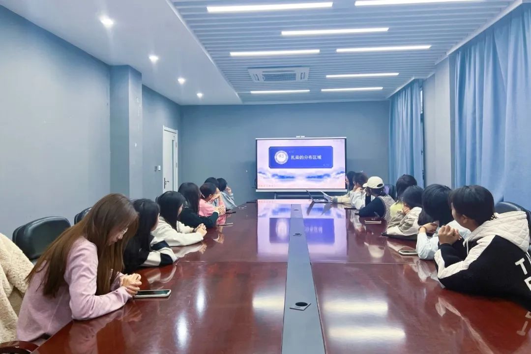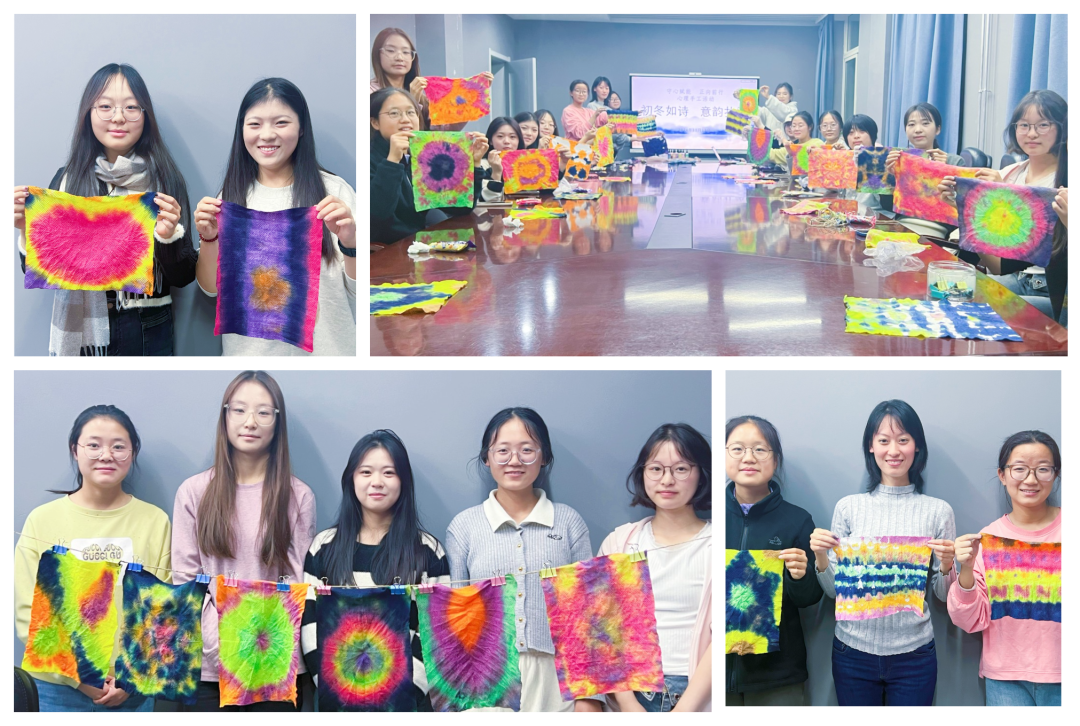 活动伊始,史春燕向同学们介绍了扎染的历史演变、制作工艺、以及艺术风格特点。随后,同学们根据自己的创意和兴趣,设计了各种图案,并运用不同的扎结技巧和染色方法,用染料进行洇晕印染,一起绘制了各种各样的图案。在大家的啧啧称奇中,一幅幅扎染作品生动呈现在同学们眼前,这些作品犹如山峦起伏、水流蜿蜒,云朵飘荡、烟花绽放,充满了生机和活力,展现出扎染艺术独特的晕染效果和意韵之美。