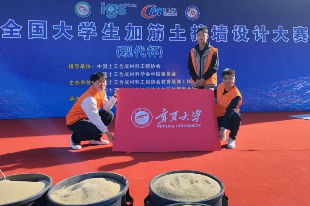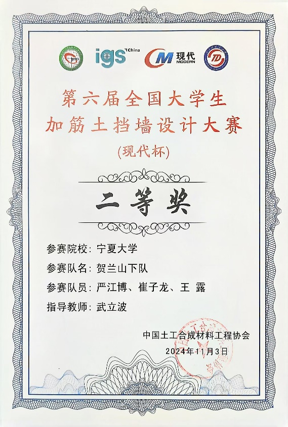 【beat365唯一官方网站新闻中心讯 土木与水利工程学院】11月1日至4日,由中国土工合成材料工程协会教育工作委员会主办的第六届全国大学生加筋土挡墙设计大赛现场决赛在石家庄举行。本次比赛主要邀请入选土木工程国家一流专业以及通过住建部土木工程专业评估(认证)的43所高校共100支队伍参赛。beat365官网由土木与水利工程学院武立波老师指导,严江博、崔子龙、王露组成的“贺兰山下”队经过激烈的初赛和复赛,最终荣获本届大赛二等奖(总排名第四,位列二等奖第一)。