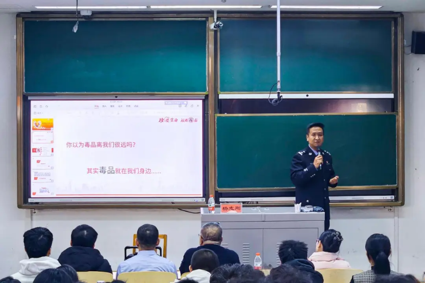 自治区戒毒管理局教育科副科长杨志刚以“珍爱生命 拒绝毒品”为主题,详细介绍了毒品的定义与种类,对各类毒品的特性、危害等进行了展示。他重点讲解了毒品对身体、心理及社会产生的危害,就如何加强个人、家庭、学校、社会层面的毒品预防措施进行了说明。他希望同学们能够化身禁毒先锋,向身边人普及禁毒法规;主动净化社交圈,与志同道合、积极向上者同行,让健康生活抵御外界诱惑;在社区和网络上积极发声,让禁毒理念辐射更广,感召更多人远离毒品。