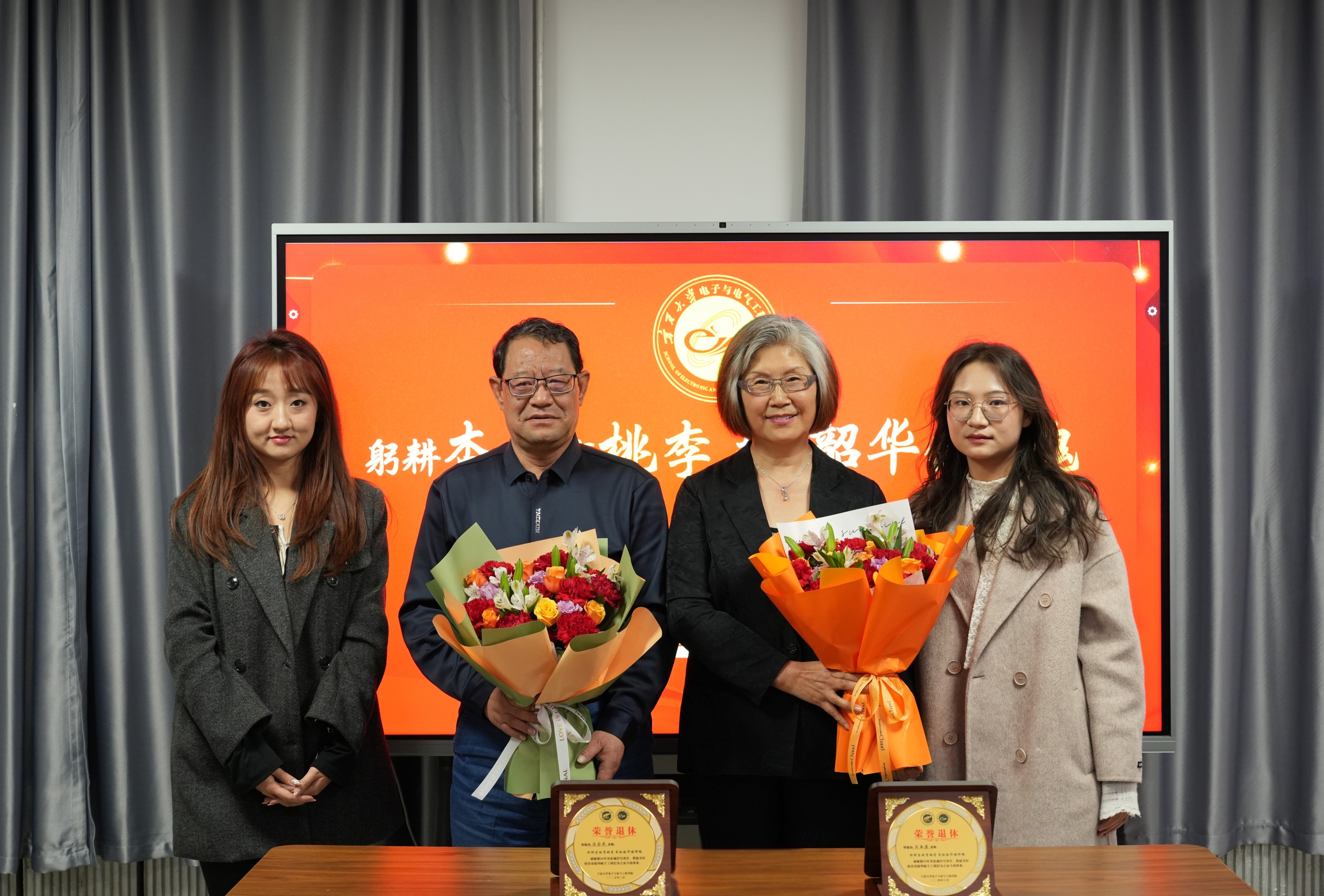 学院党总支书记何彦平向汪西原、汤全武教授颁发荣休纪念牌,希望他们退休后能够继续保持健康的心态和乐观的精神,享受美好的退休生活。