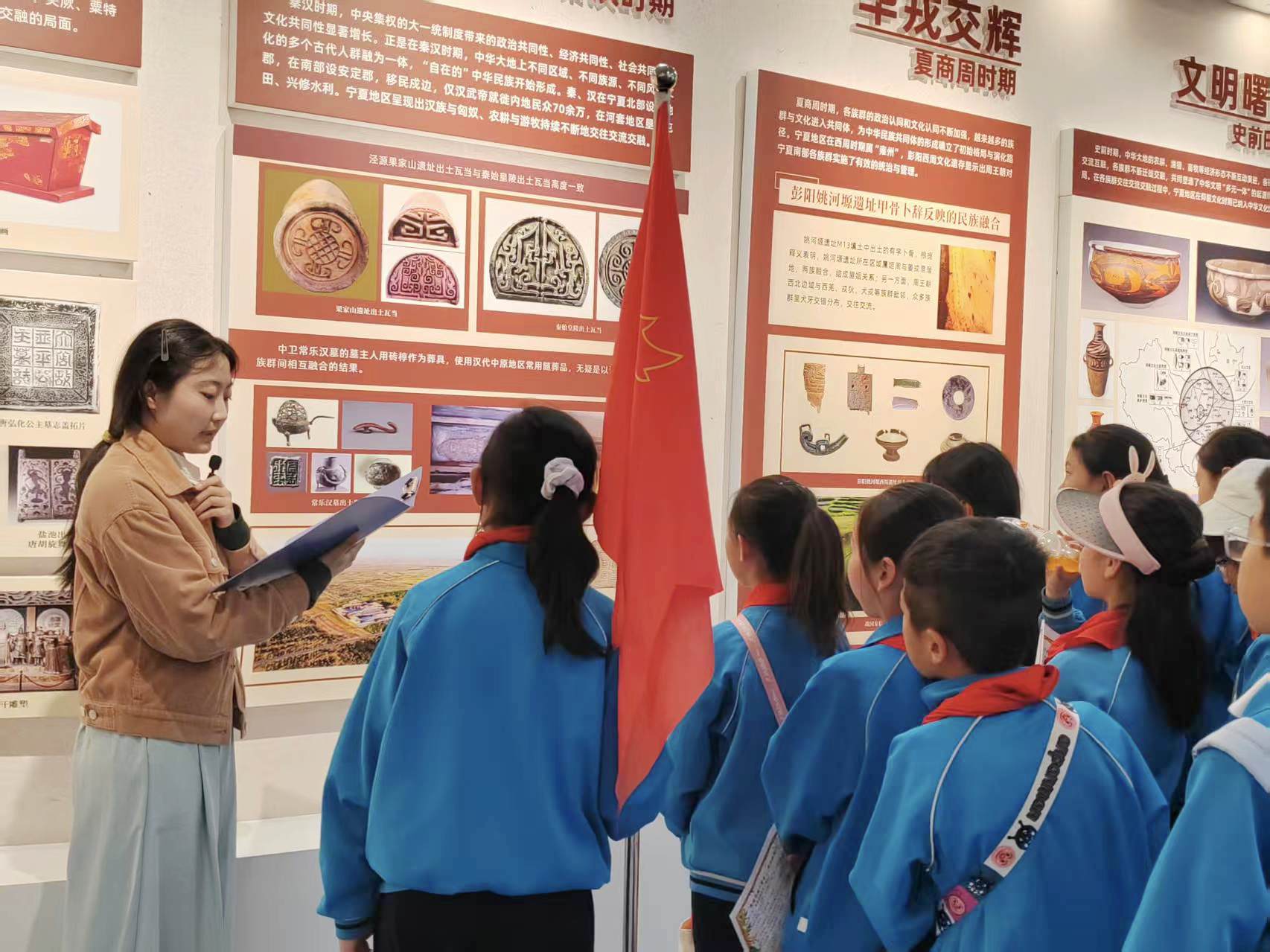 在铸牢中华民族共同体意识实践教育基地,讲解员带领学生们依次参观了 “中华民族交往交流交融的宁夏史话” “习近平总书记对宁夏的关怀” 等展区。通过一幅幅珍贵的图片、一段段详实的文字、一件件生动的实物,学生们深入了解了宁夏地区各民族在长期的发展过程中,相互交往交流交融的鲜活历史,深刻感受到了国家领导人对宁夏地区发展和民族团结的高度重视与亲切关怀。同学们认真聆听讲解,不时提出问题,与讲解员积极互动,现场气氛热烈。
