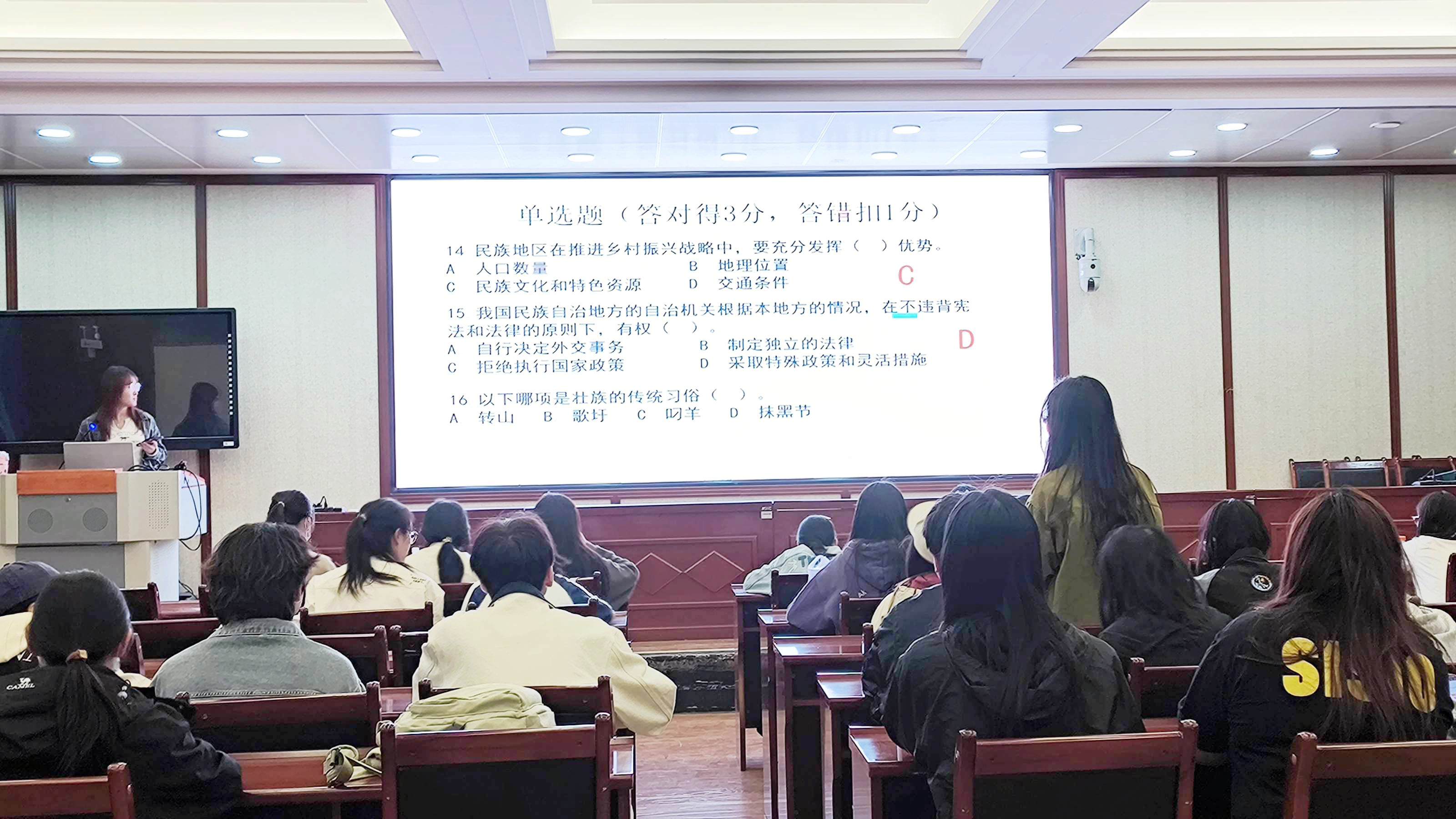 决赛于5月14日晚在怀远一教131教室举行,由守正书院“小石榴”宣讲团团长、研究生会主席团成员程瑞晴,学生会主席团成员董奥宇,研究生会学术科研部主要负责人高竟慧、负责人石文慧,以及此次活动负责人石惠担任评委,各小组凭借扎实的民族团结知识储备与出色应变能力,通过合唱表演、宣讲+情景剧等形式展示对民族团结的理解与实践,五位评委从内容深度、创意性、团队协作等方面进行评分。最终,各参赛小组凭借各自出色的表现,荣获相应等级的奖项。