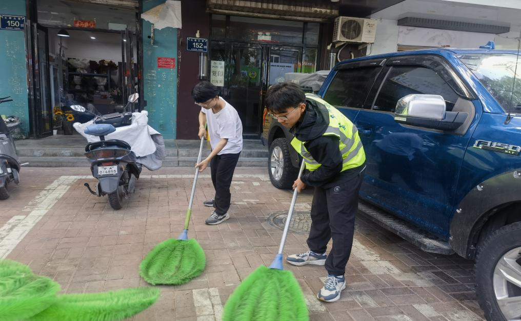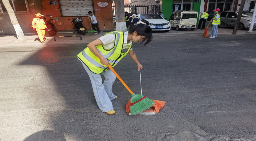 同学们手持保洁袋、抑尘扫把、捡拾器、铲刀、擦洗器等清扫保洁工具,在环卫主管的指导下,熟悉城市环境卫生工作流程、作业规范,认真学习环卫设施与工具的正确使用,完成了兴庆区6条街区的环境卫生清扫清运工作。同学们无惧烈日,沉浸于每一条大街小巷、每一处垃圾箱具的清洁养护,同时也结合所学专业深入思考如何实现“树胶”、“油渍”的快速处理、如何提升公众的环保意识等问题。大家纷纷表示,这不仅仅是一次“绿街行动”的劳动实践,更是环境专业大学生使命担当的劳动反思。