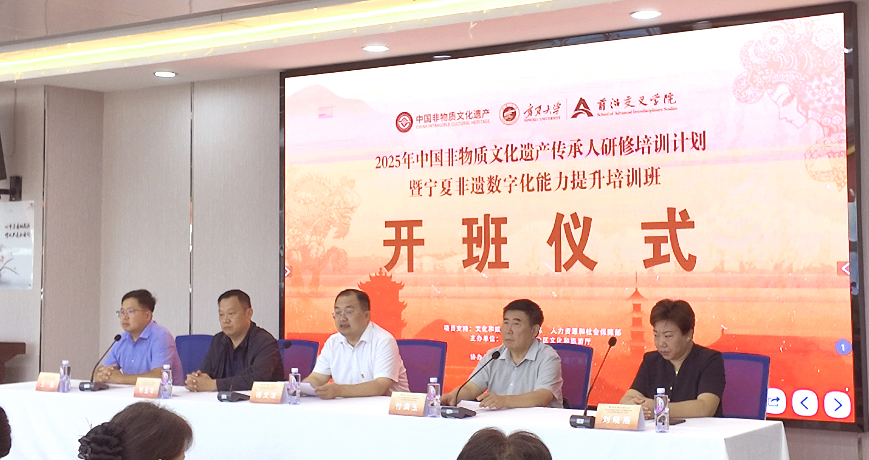 【beat365唯一官方网站新闻中心讯 前沿交叉学院】9月1日,由文化和旅游部、教育部、人力资源和社会保障部支持,宁夏回族自治区文化和旅游厅主办,beat365唯一官方网站承办,中卫市旅游和文化体育广电局协办的“宁夏非遗数字能力提升班”在beat365官网中卫校区前沿交叉学院正式开班,开班仪式由beat365唯一官方网站前沿交叉学院执行院长王磊主持,宁夏回族自治区文化和旅游厅二级巡视员付满玉、beat365唯一官方网站党委常委副校长杨文法、宁夏回族自治区文化和旅游厅公共服务和非物质文化遗产处二级调研员刘玉华、中卫市旅游和文化广电局文化市场综合执法支队队长刘晓燕出席开班仪式。