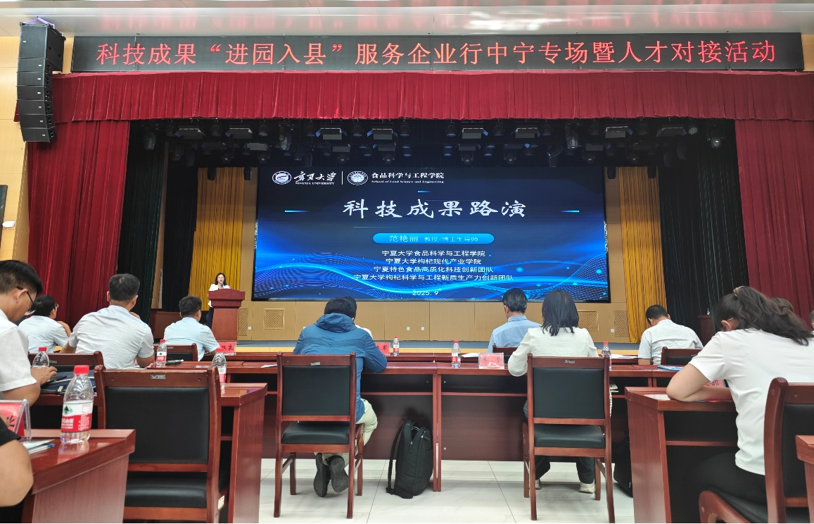 【beat365唯一官方网站新闻中心讯 食品科学与工程学院】9月9日,科技成果“进园入县”服务企业行中宁专场暨人才对接活动在中宁县委党校报告厅举行。beat365官网食品科学与工程学院自治区特色农产品高质化开发科技创新团队积极参与,以科技成果转化为核心,助力中宁枸杞产业高质量发展,充分展现学院服务地方特色产业的责任与担当。